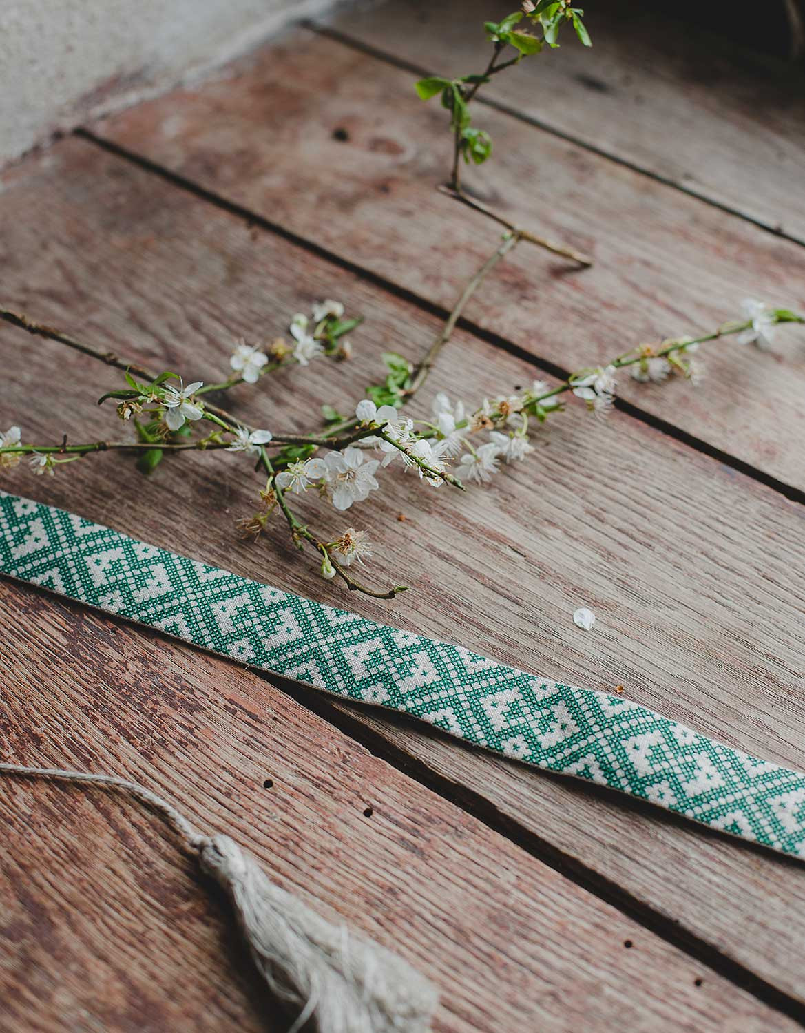 Bandeau de tête en pure lin, brodé avec un motif de style ukrainien en point de croix. Longueur : 44cm + liens en lin et pompons faits à la main.