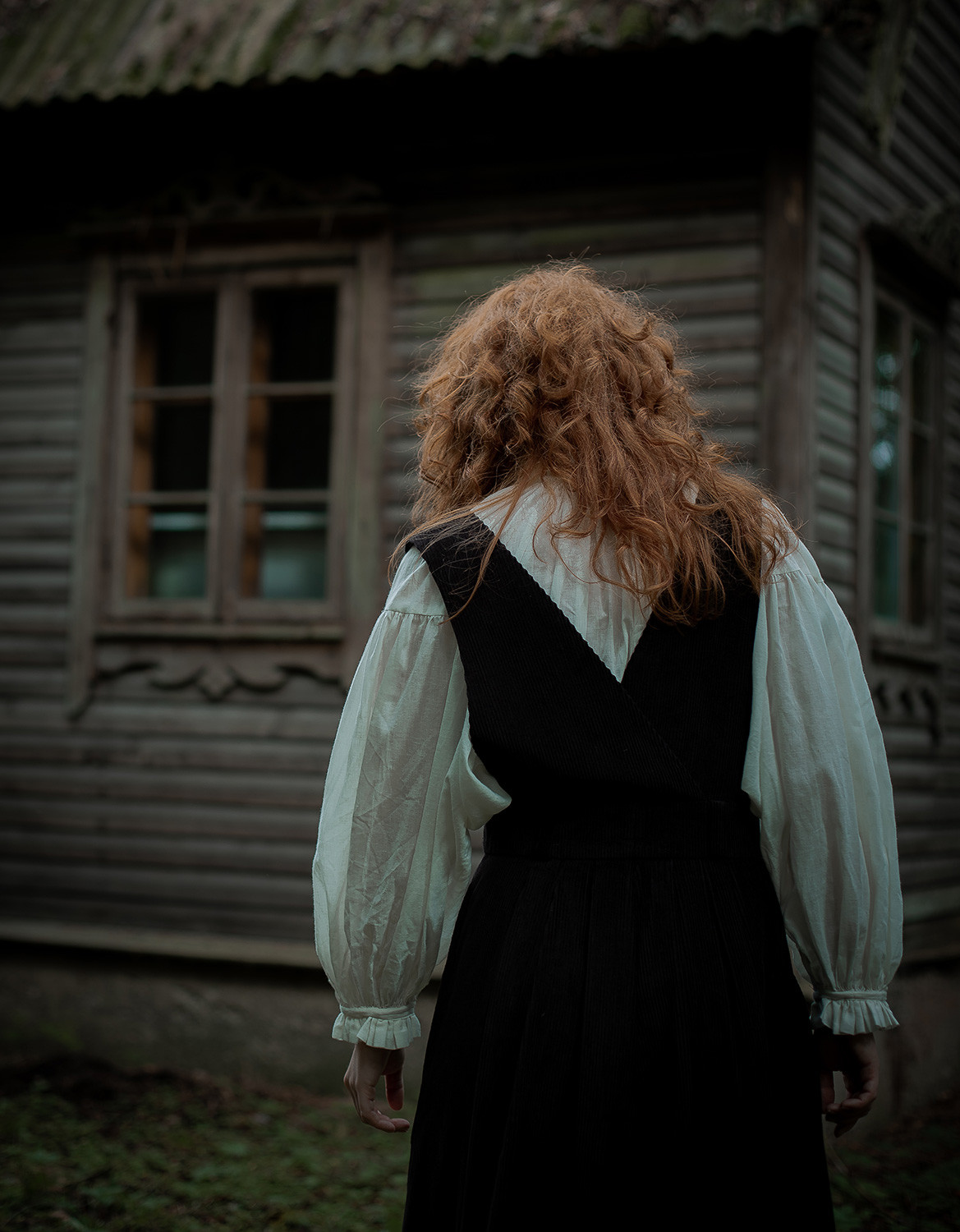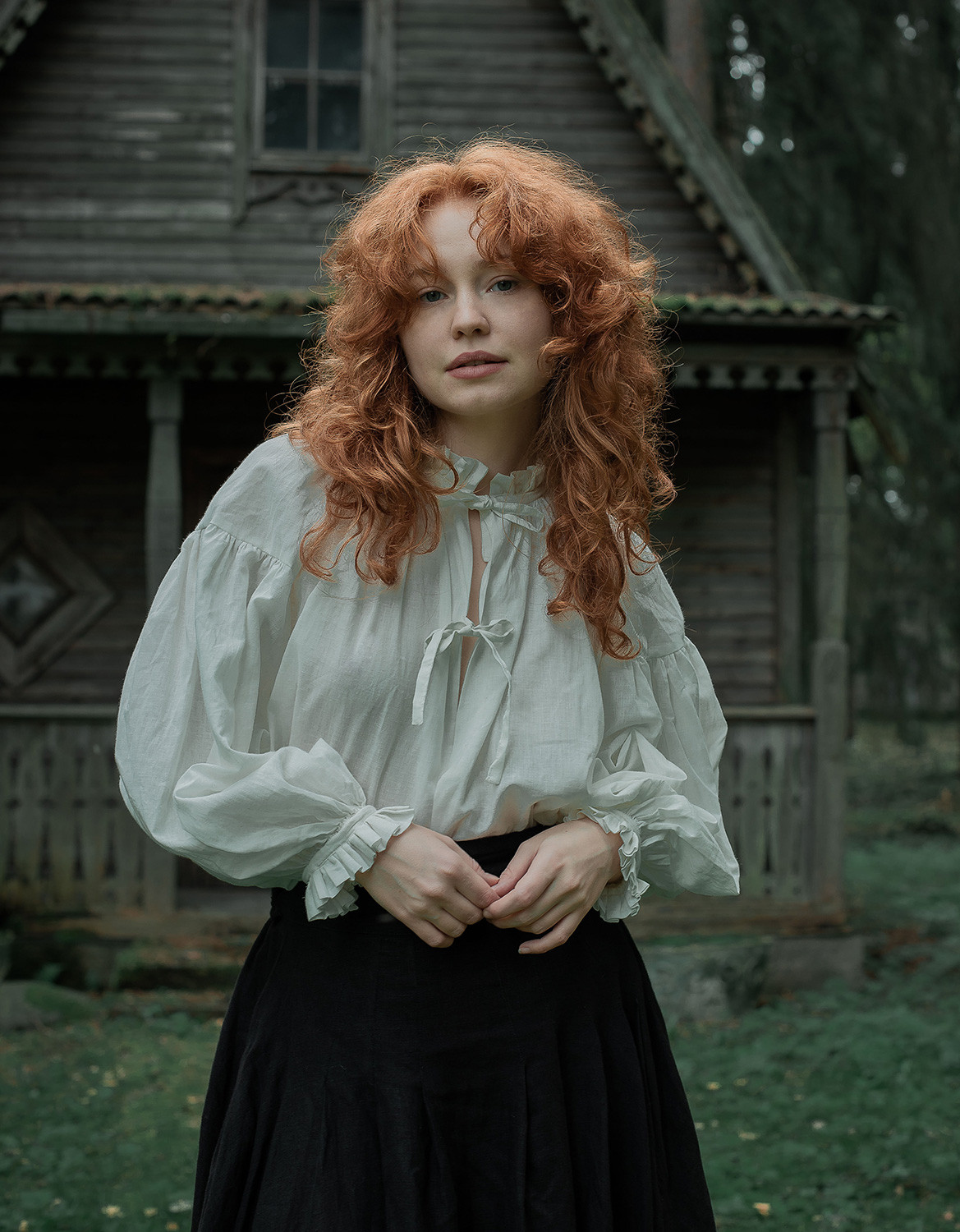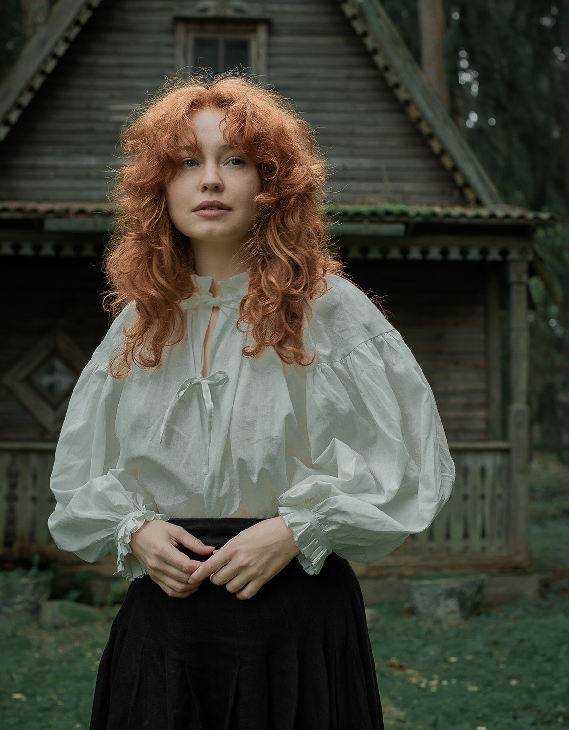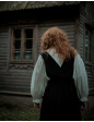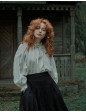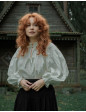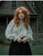 Description : Blouse avec fronces au col et aux manchettes, à nouer sur le devant. Très légèrement transparente, coton bio 60gr, à porter avec un débardeur ou une brassière en dessous en fonction de chaque individu (porté sans rien sur la photo), ou en dessous d’une robe chasuble ou gilet sans manches (voir photo de dos).