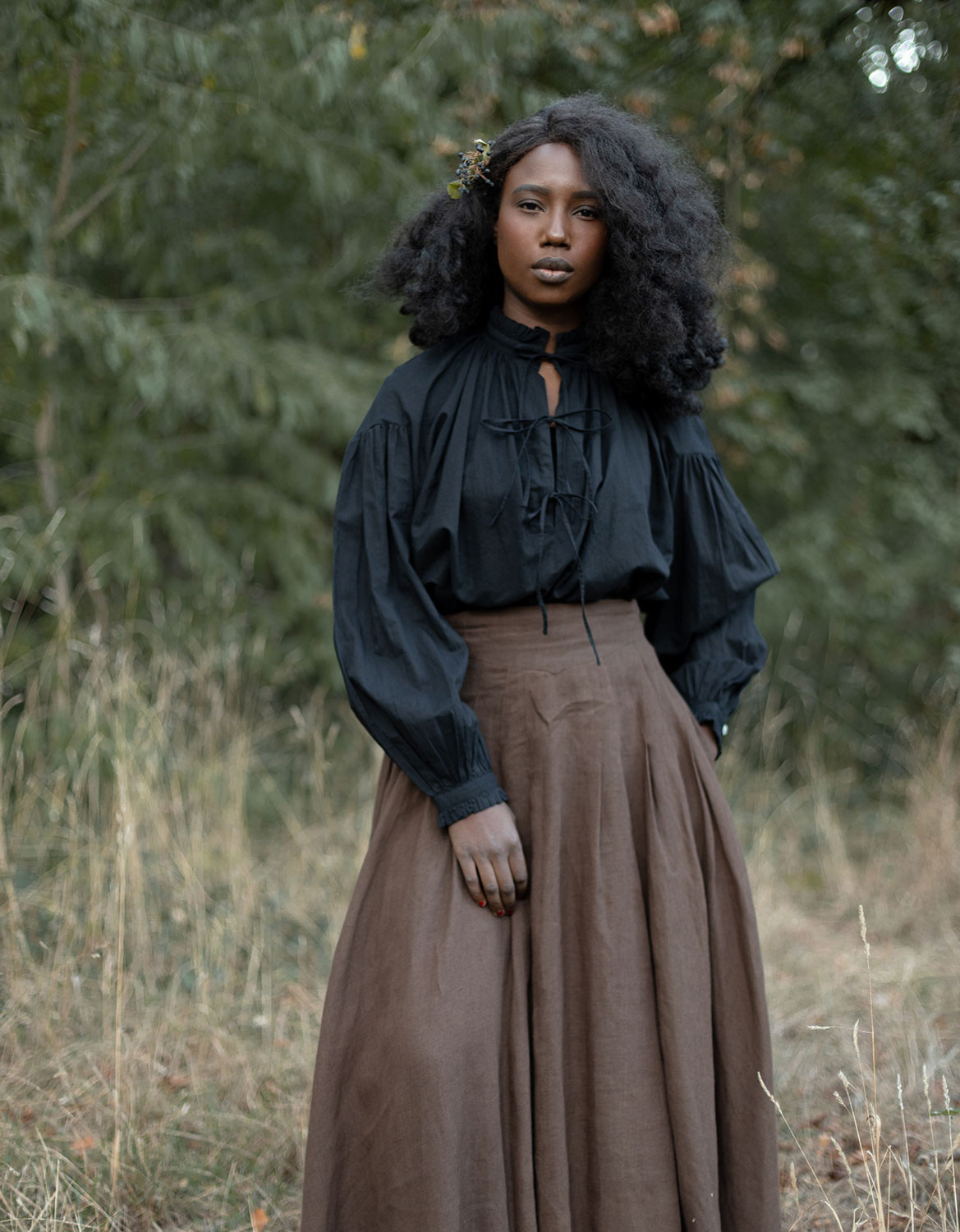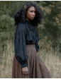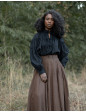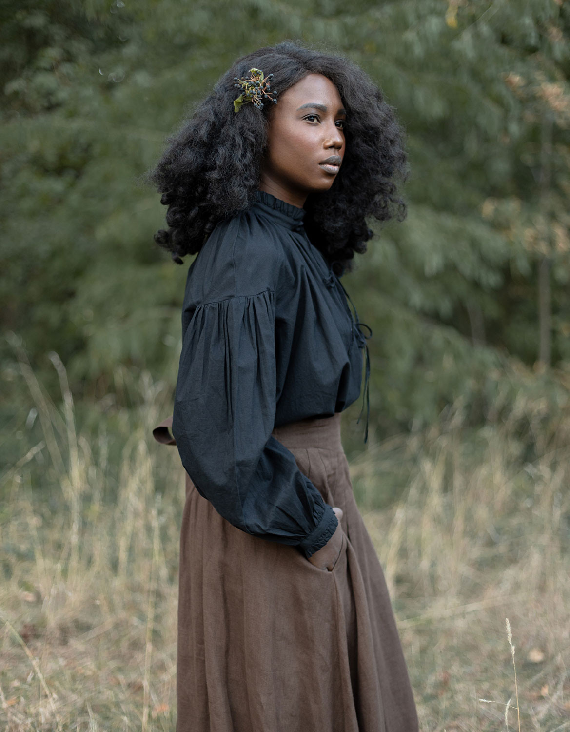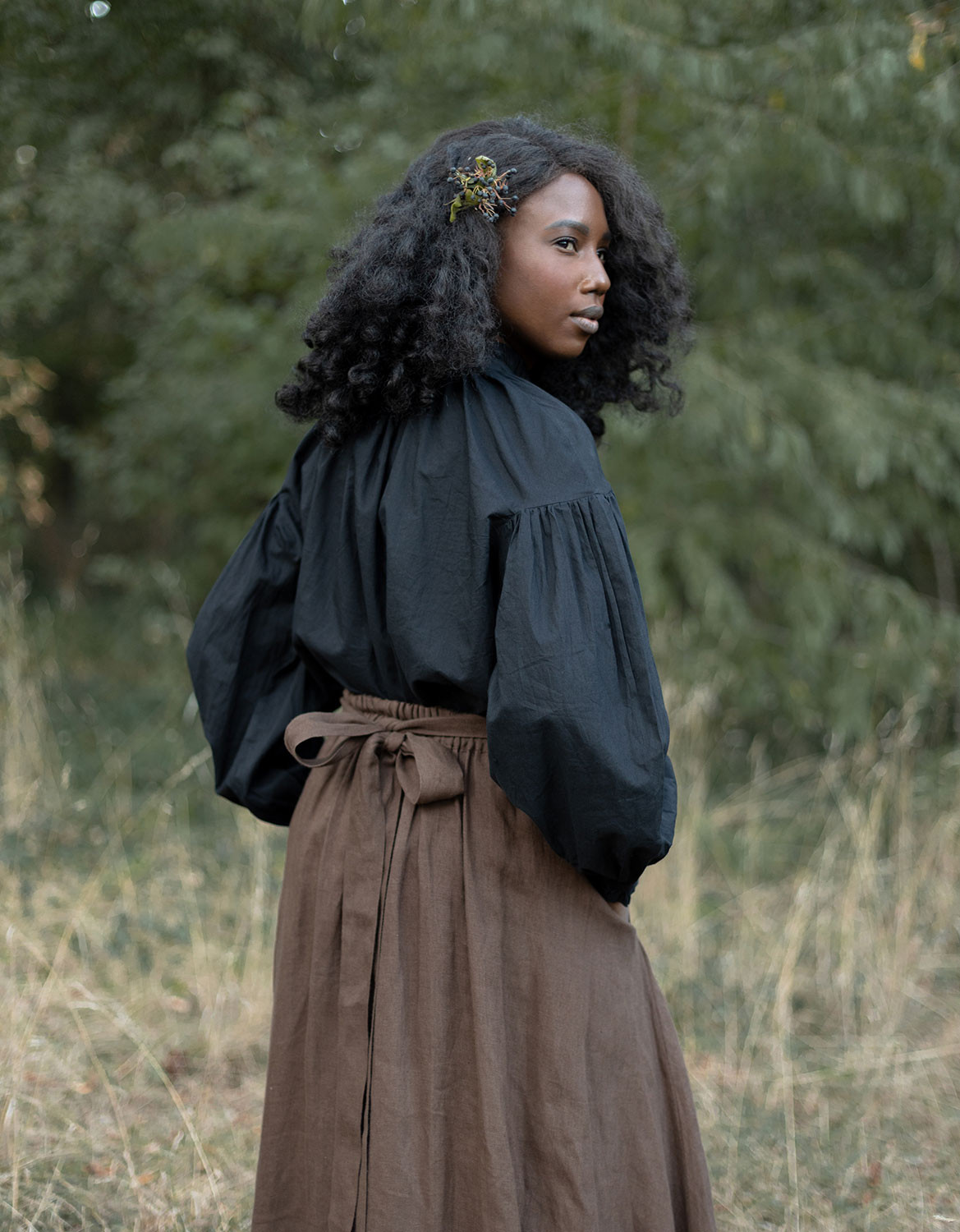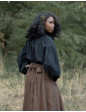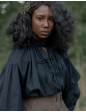 Description : Blouse voluminuese avec fronces au col et aux manchettes, à nouer sur le devant.