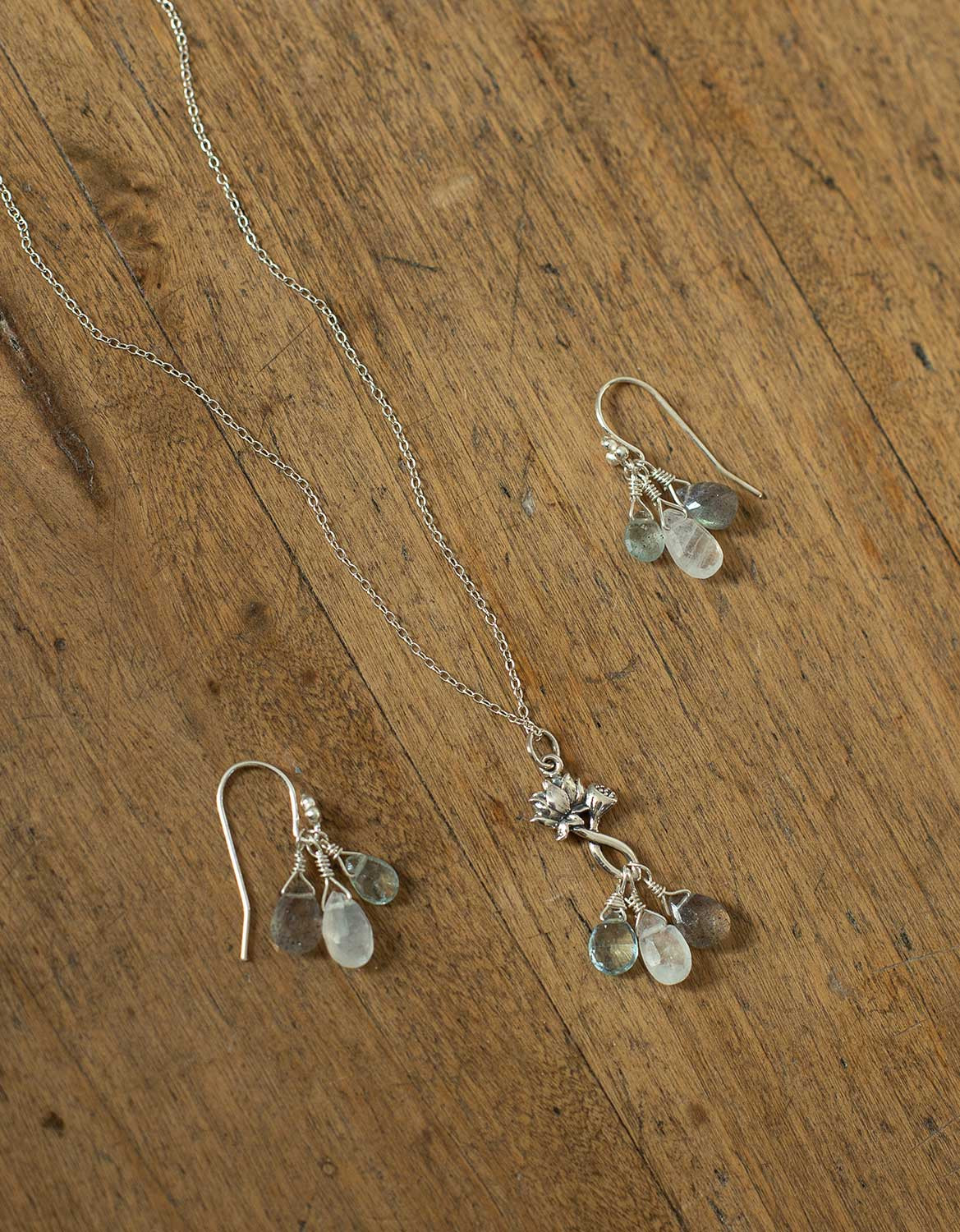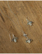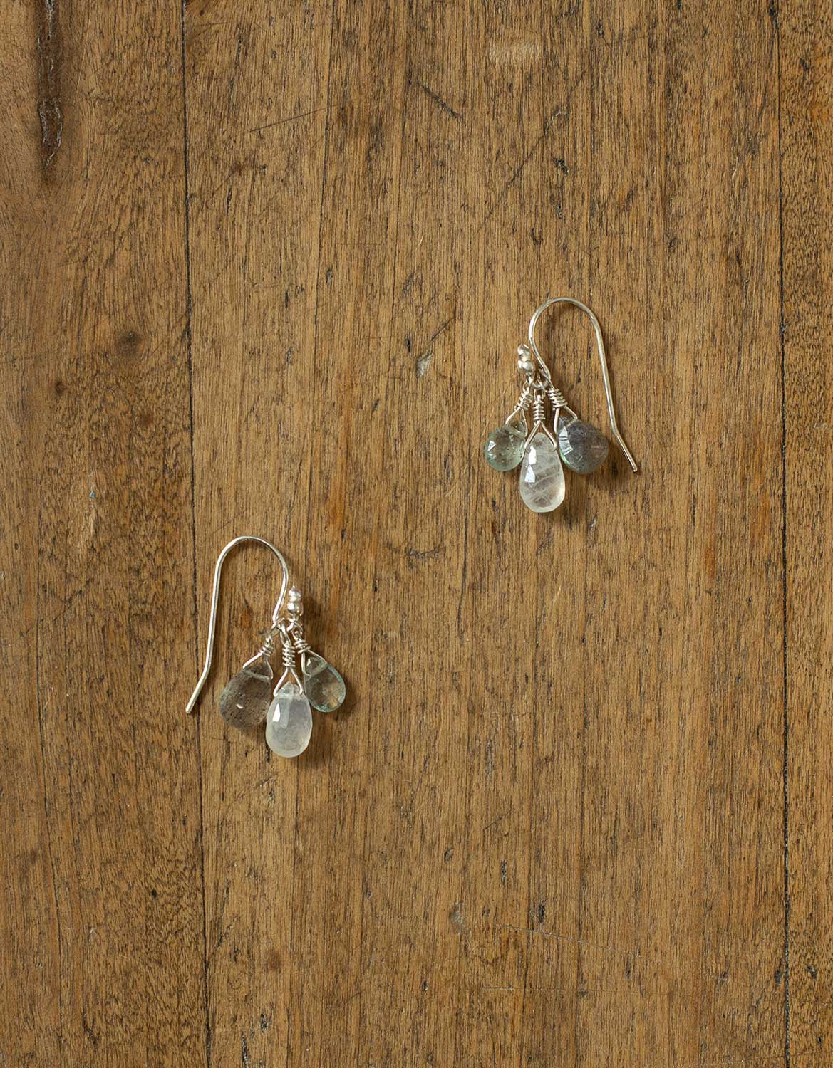 Petites boucles d'oreilles courtes composées de trois gouttes: l'une en pierre de lune, l'autre en aigue-marine et la troisième en labradorite. Les boucles d'oreilles sont montés sur des délicats crochets en argent 925, et mesurent environ 3cm depuis l'oreille.