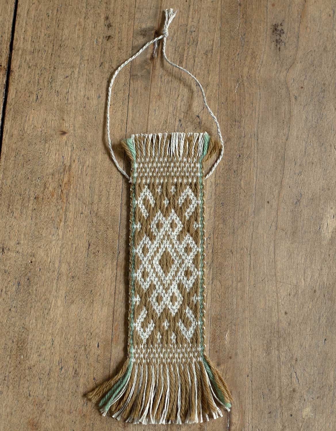 Cette décoration murale est un extrait de ceinture tissée selon un savoir-faire ancestral et représente le symbole du "soleil". Qui symbolise l'apgée du solstice d'été.composé de 82 fils de pure laine et lin.