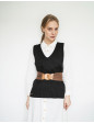 Ceinture extensible en jersey de laine mélangée avec une boucle en bois. Se porte facilement pour cintrer une robe ou tunique, un joli pull comme sur la photo, mais aussi pour décorer la taille d’un pantalon ou d’une jupe.