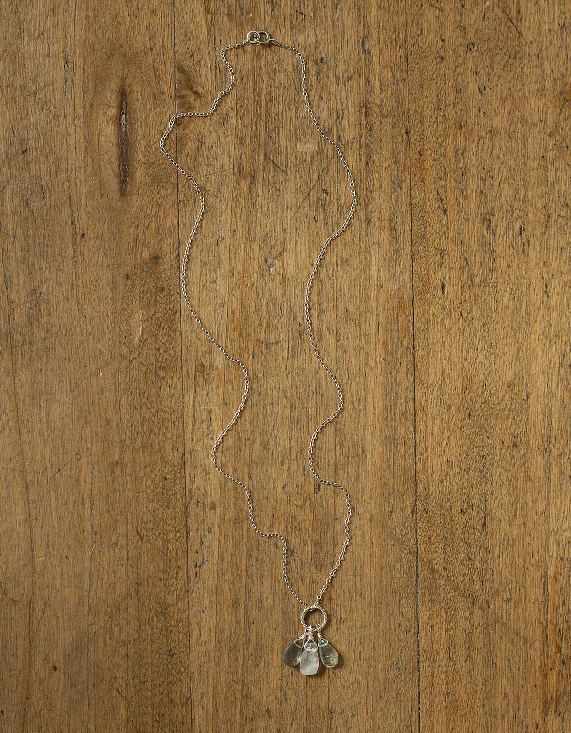 Collier en argent 925 avec trois gouttes facettées en pierres semi-précieuses d’aigue-marine, pierre de lune et labradorite.