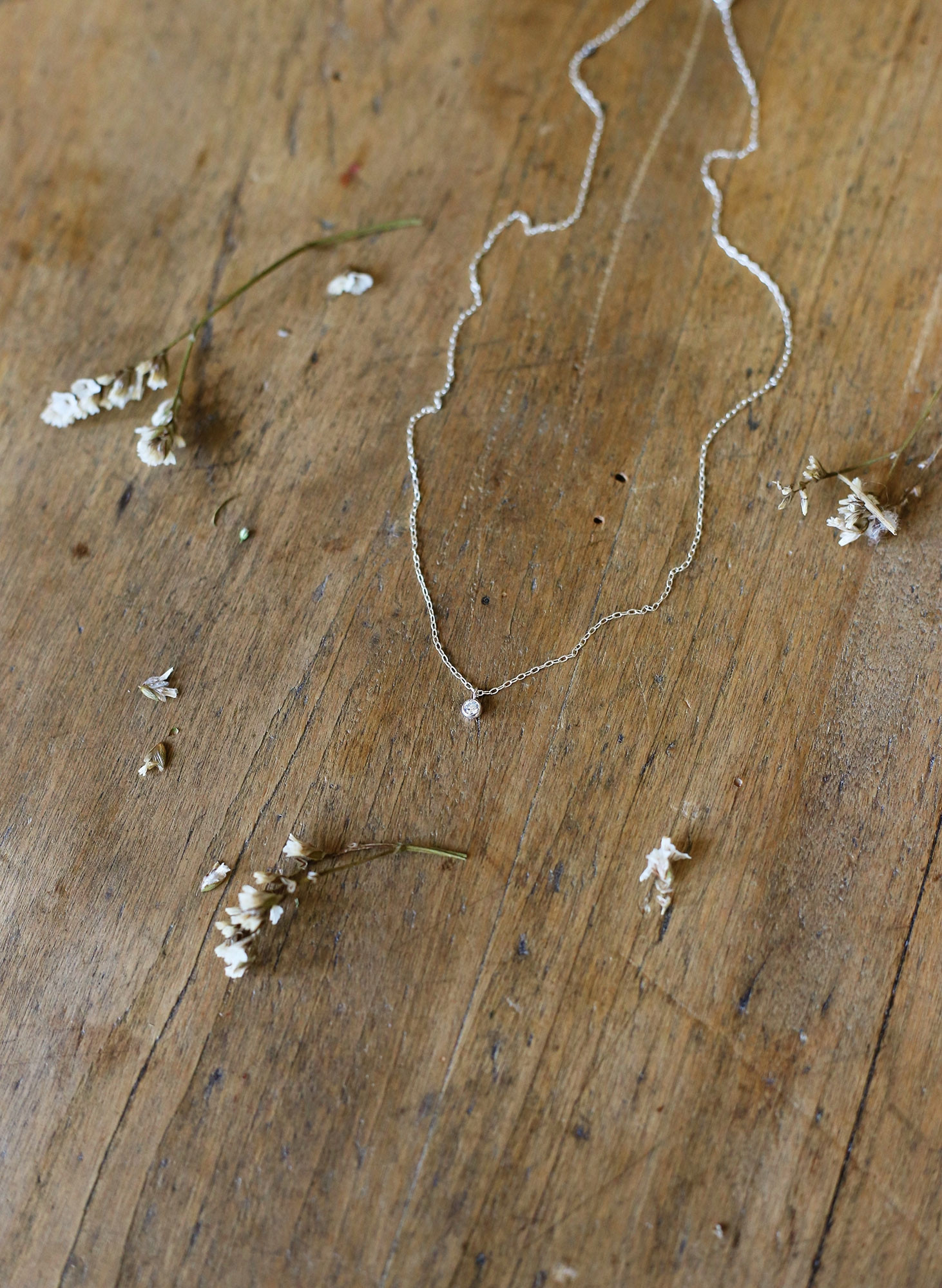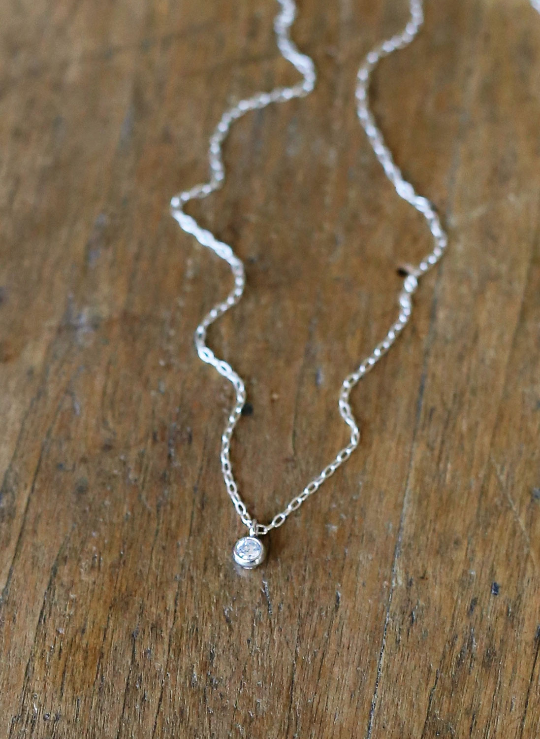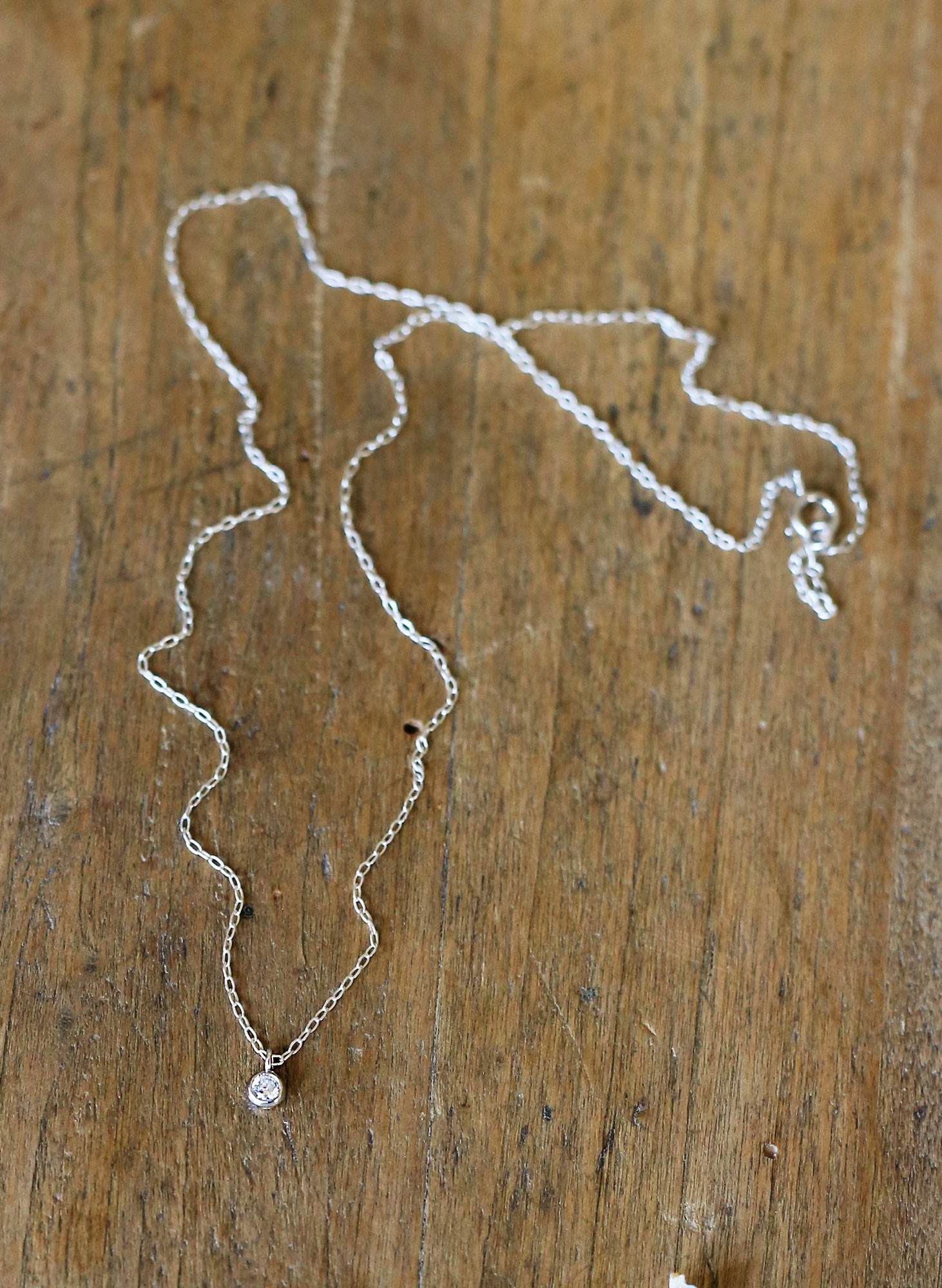Collier en argent 925 et pendentif avec un zirconium au milieu. Un bijou raffiné et minimaliste idéal à porter jour et nuit et à mélanger avec d’autres colliers.