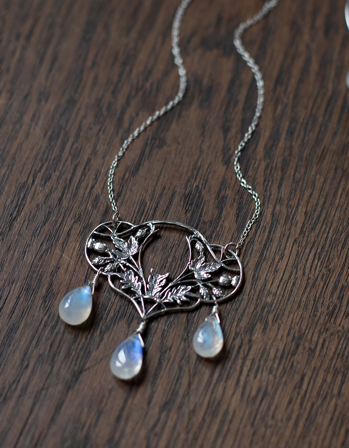 Un collier d'inspiration victorienne en argent 925 avec trois gouttes de pierre de lune sur chaine Argent 925.