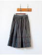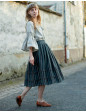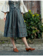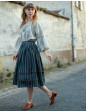Jupe plissée, inspirée du folklore lituanien et polonais, en lin rayé bio, avec une poche du côté de la fermeture éclair, car le tissu est coupé selon un concept de 0 déchet, en bandes, puis assemblé par tailles. Les coutures ne sont donc pas systématiquement latérales mais parfois distribuées dans le dos et un seul côté.