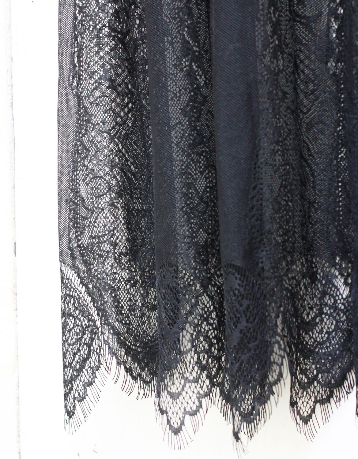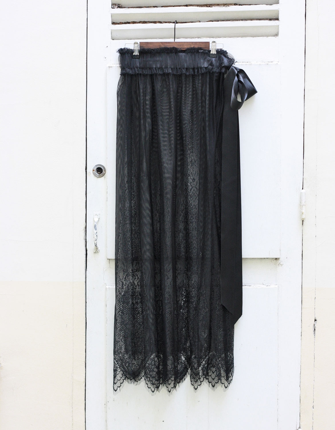 Description : Jupe ample en dentelle noire réglable à la taille avec un grand ruban en satin. Réalisée à la main dans notre atelier à Paris.