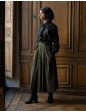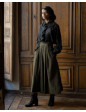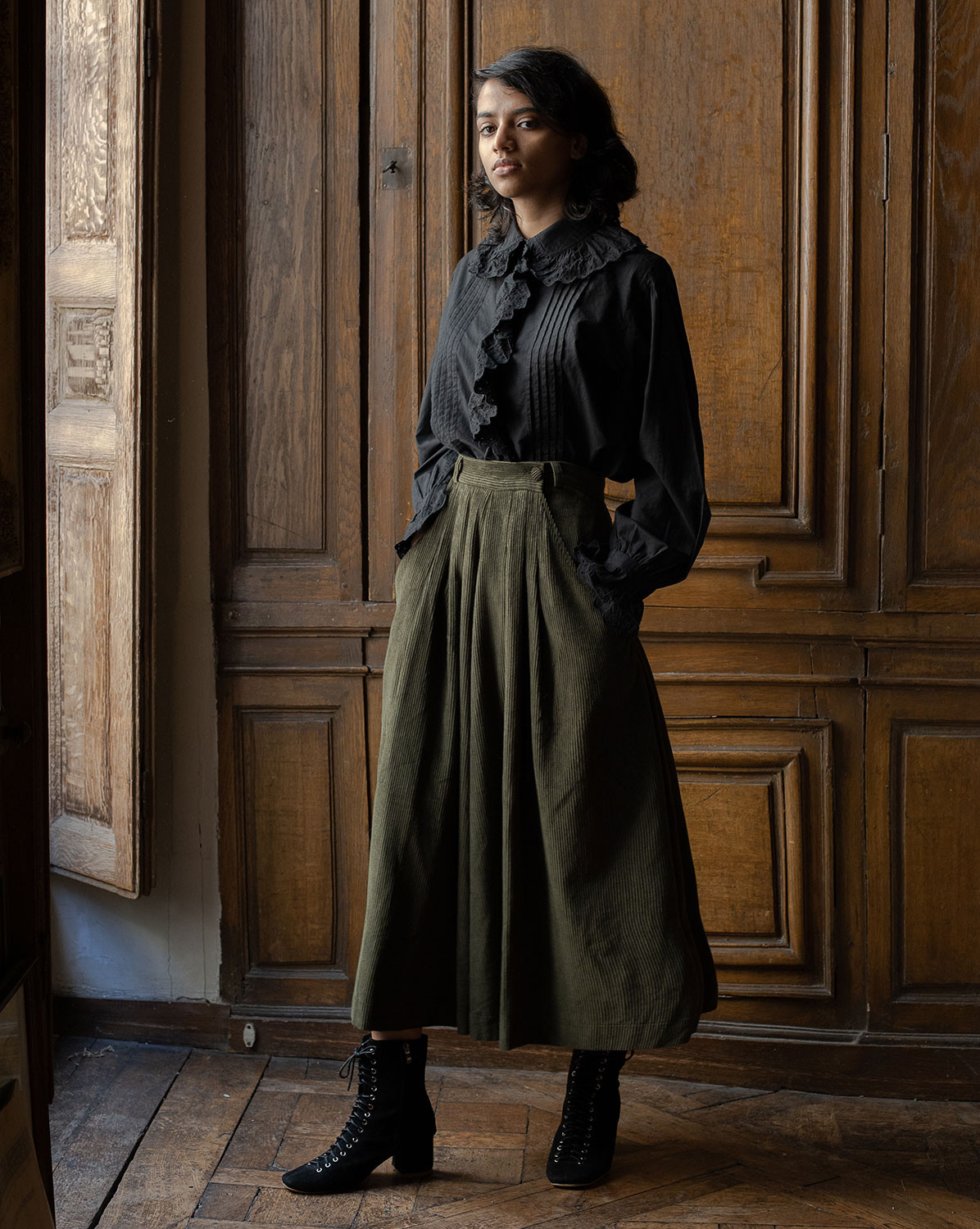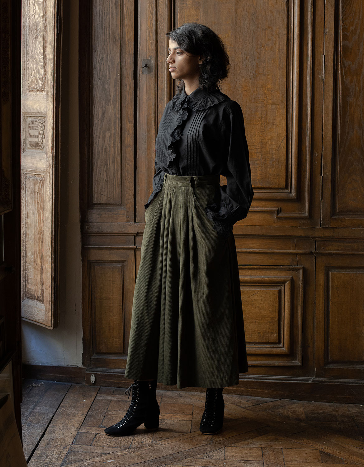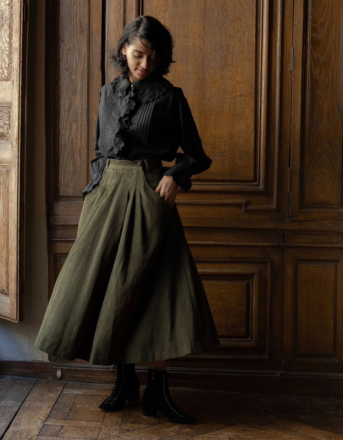 Description: Jupe évasée taille haute à pinces, en velours côtelé bio avec poches. Fermeture croisée devant.