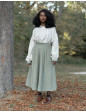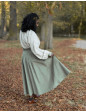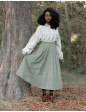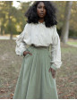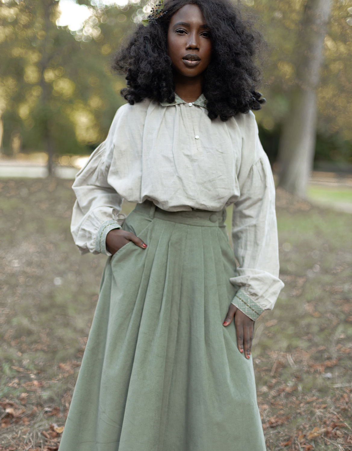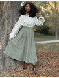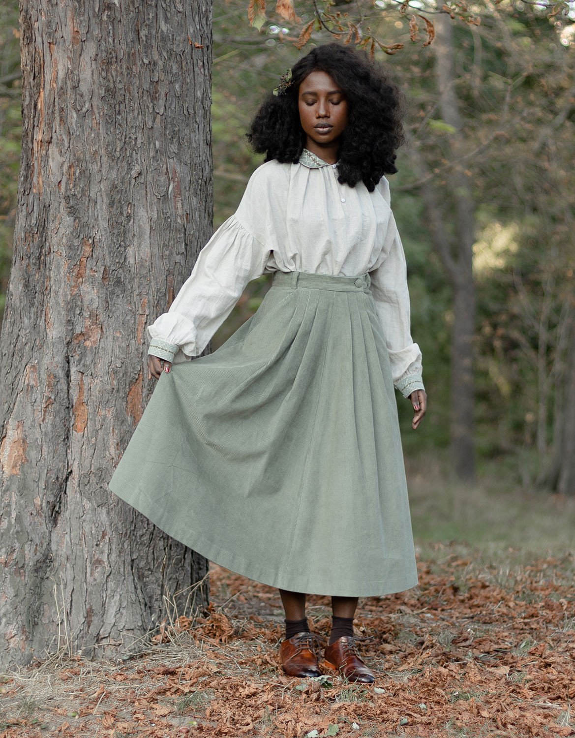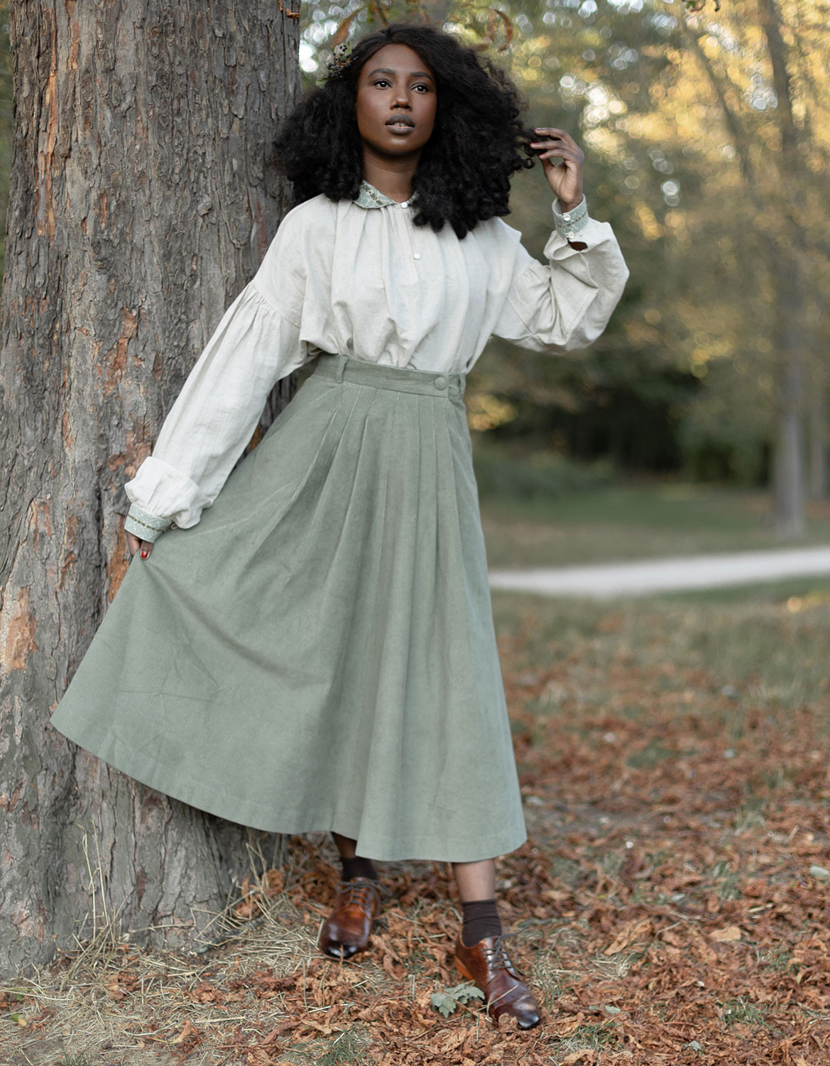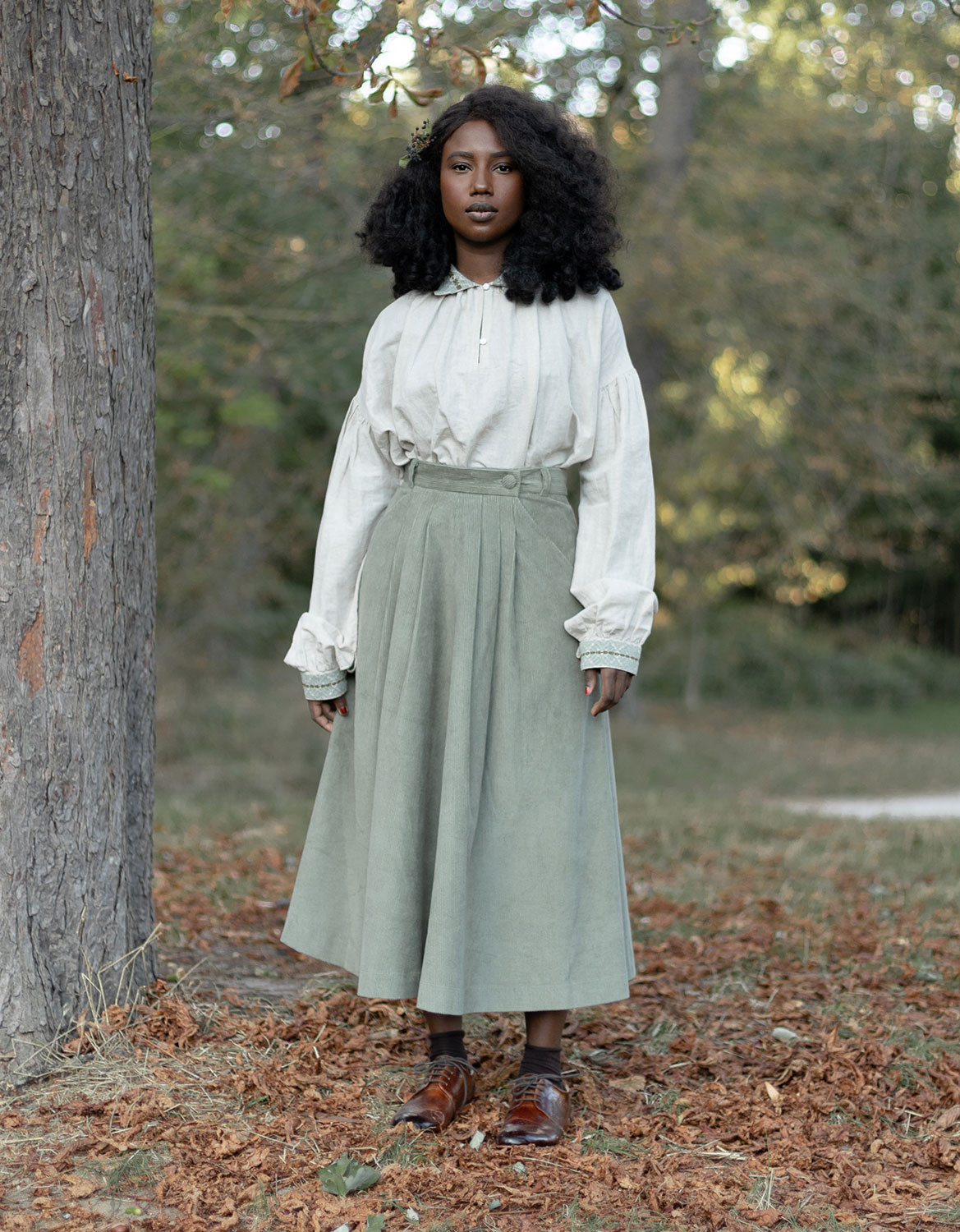 Description: Jupe évasée taille haute à pinces, en velours côtelé bio avec poches. Fermeture croisée devant.