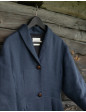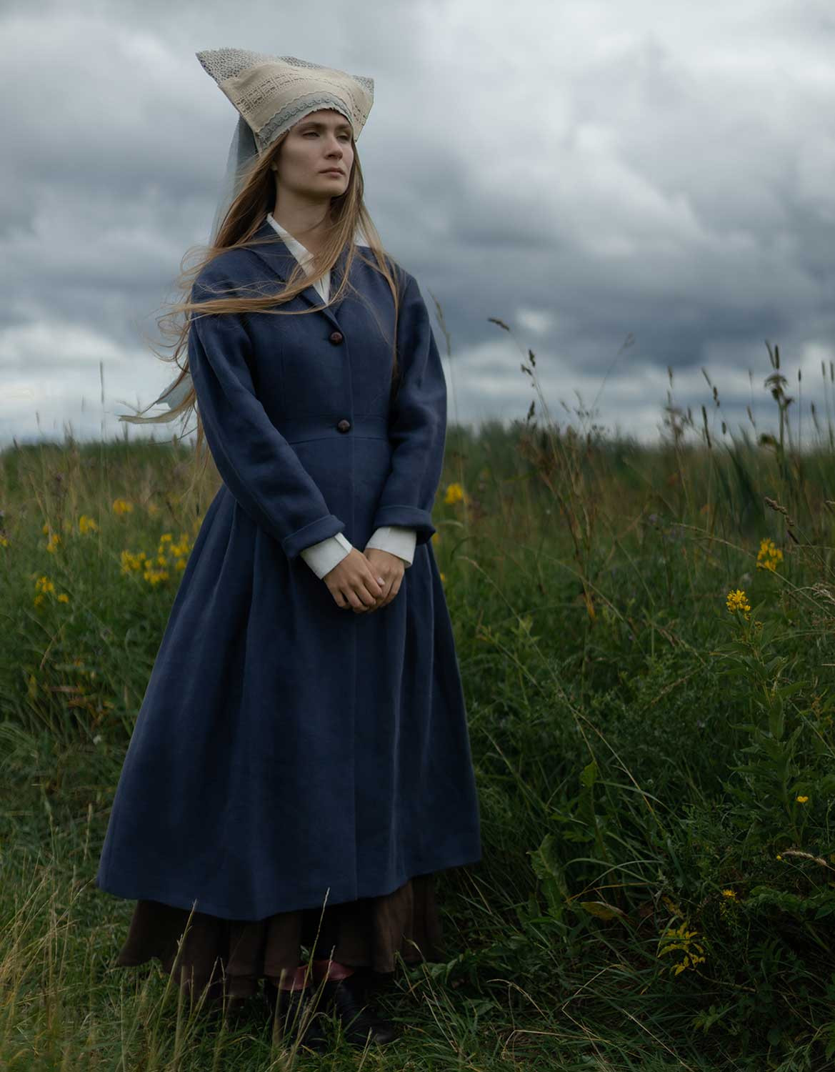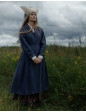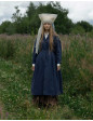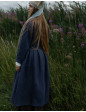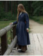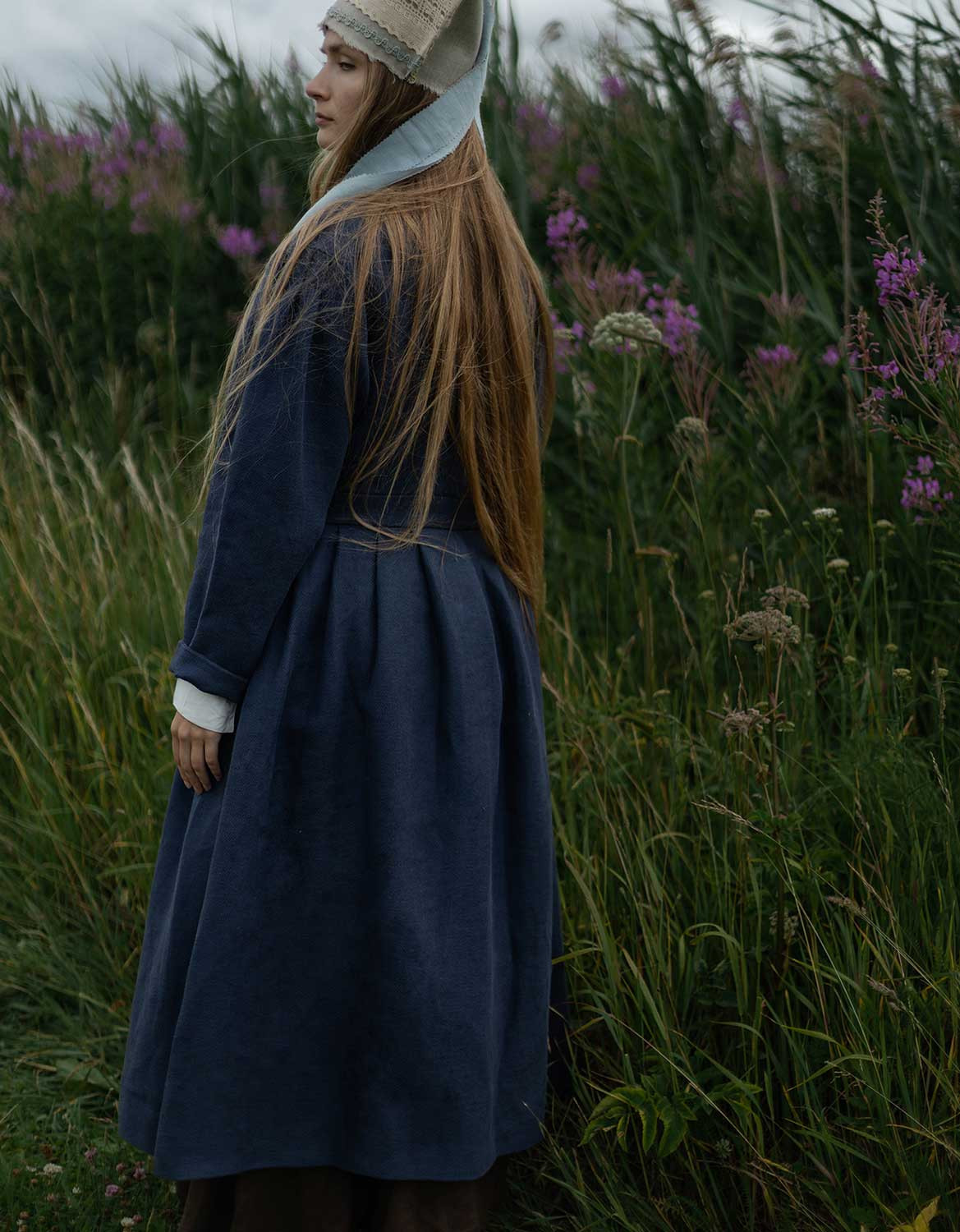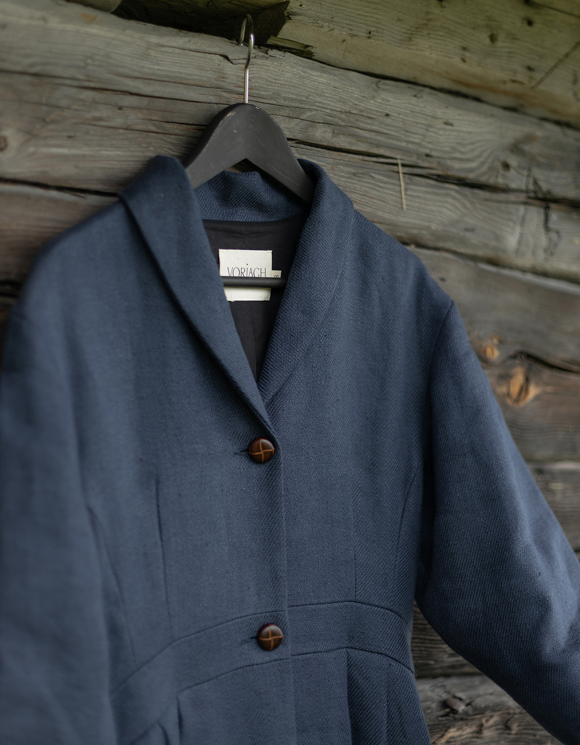 Manteau de style folk estonien avec épaules légèrement tombantes avec des plis et un col châle. Se ferme avec deux boutons en simili cuir tressé, couleur châtaigne. Longueur des manches réglages par simple revers grâce à un empiècement interne du même lin.