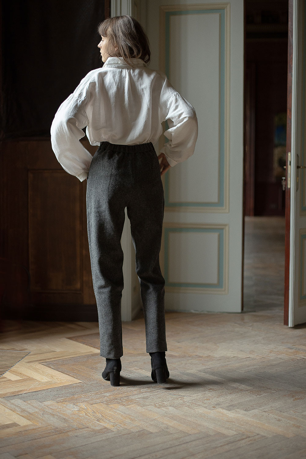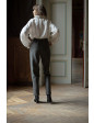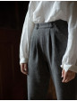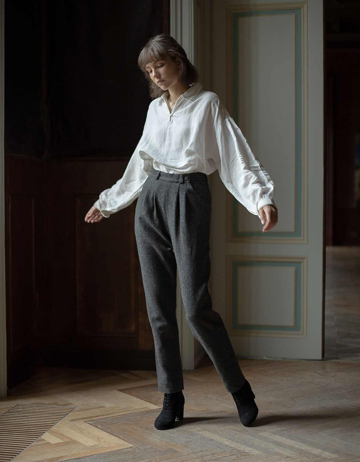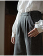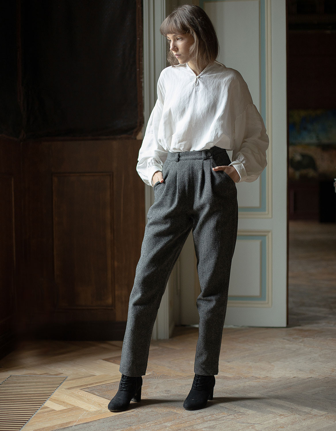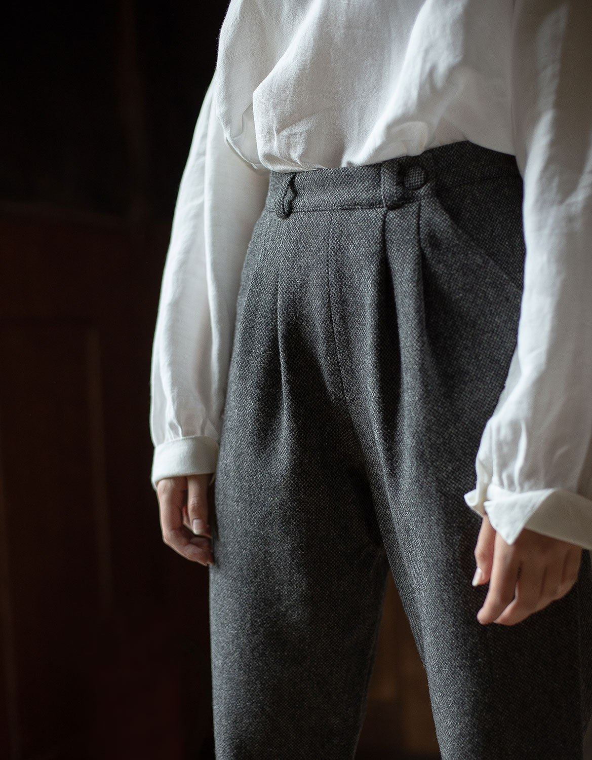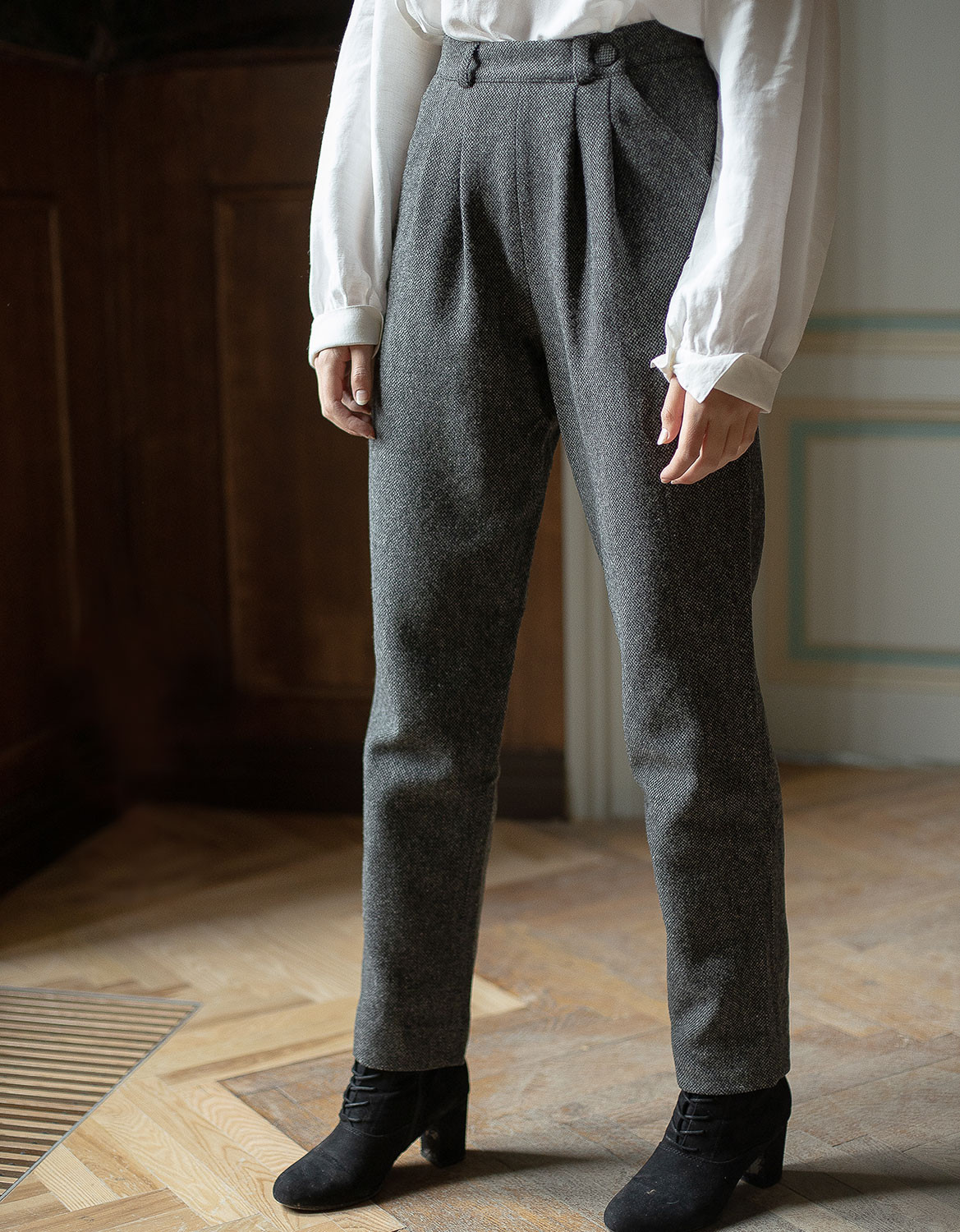 Description : Pantalon taille haute à pinces en 100% pure laine tweed avec un dos élastiqué et des poches. Fermeture croisée devant. Version améliorée avec une fermeture éclair cachée pour compléter la poche cotée gauche. Idéal pour toutes les silhouettes, en particulier pour les hanches généreuses, un ourlet peut être réalisé. Attention, la pure laine ça gratte sur les jambes, nous conseillons de porter des collants en dessous.