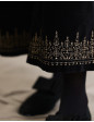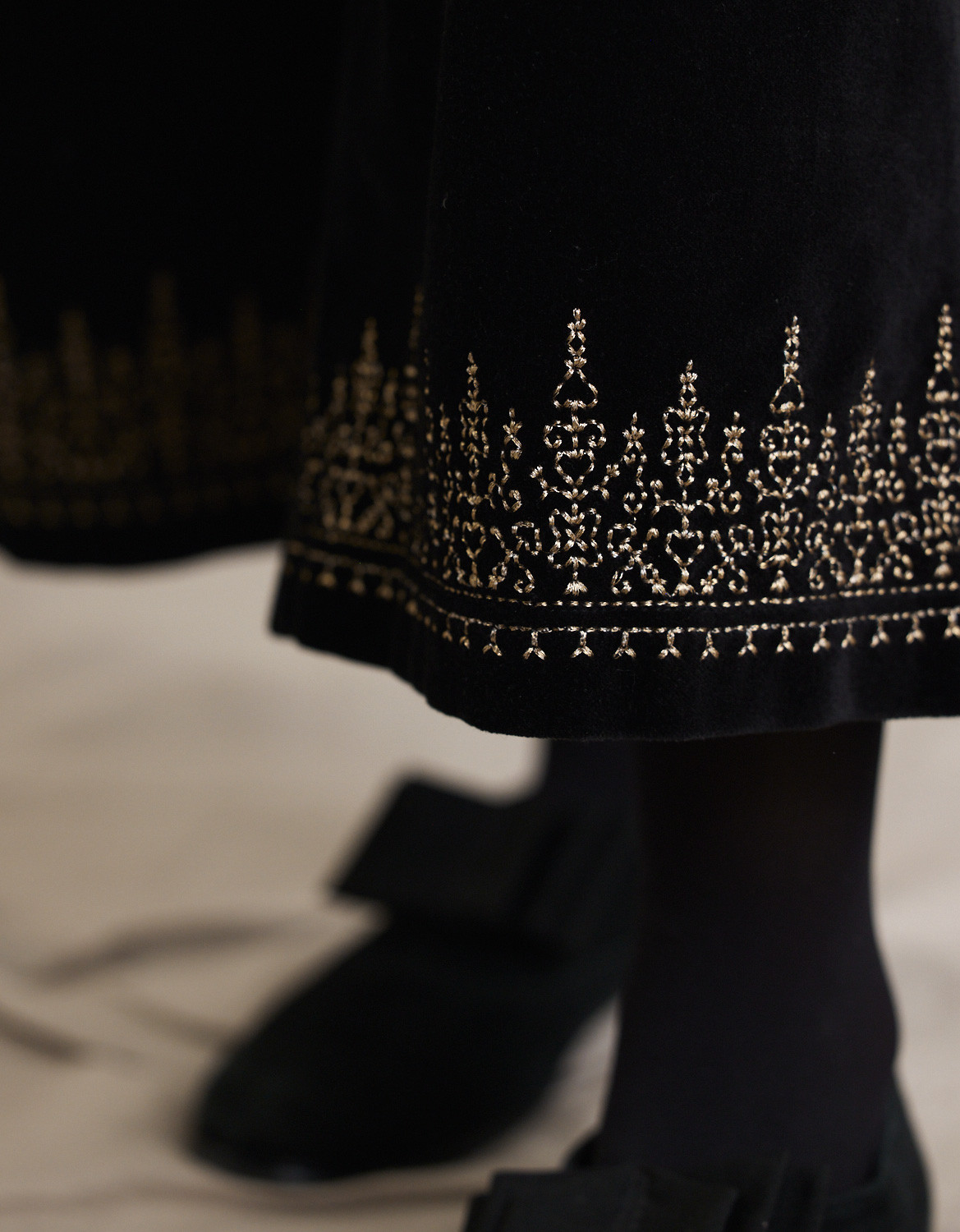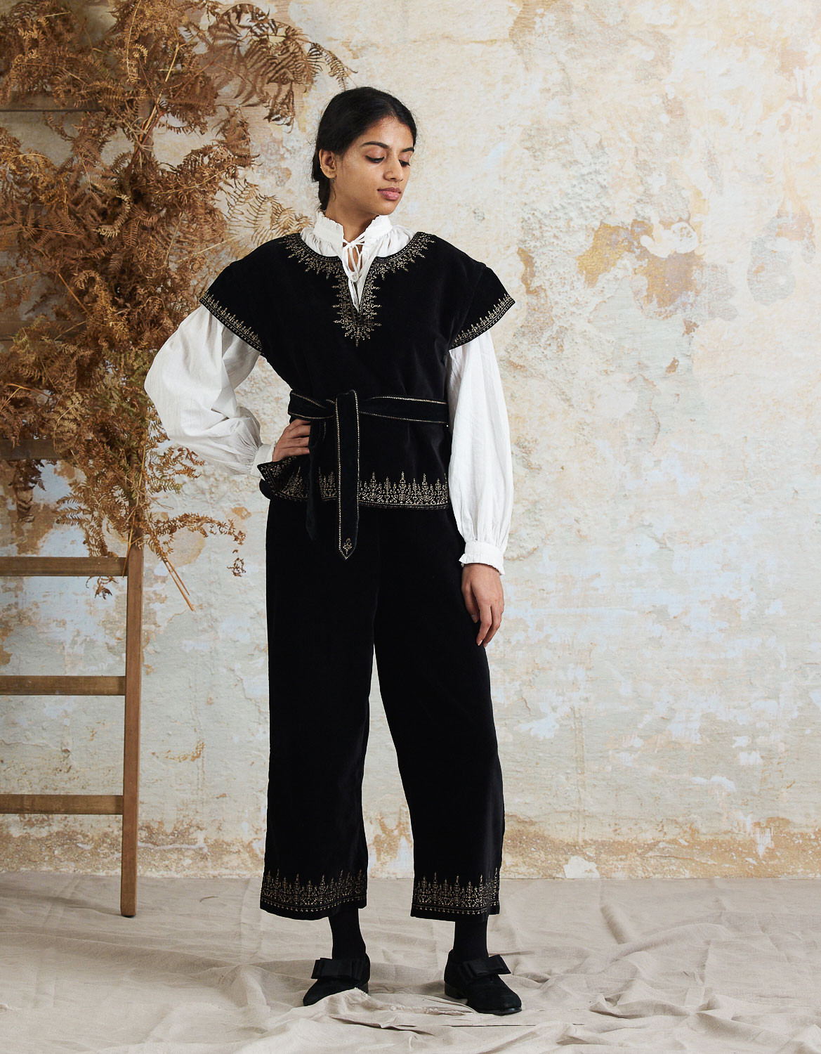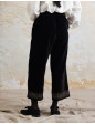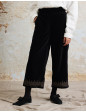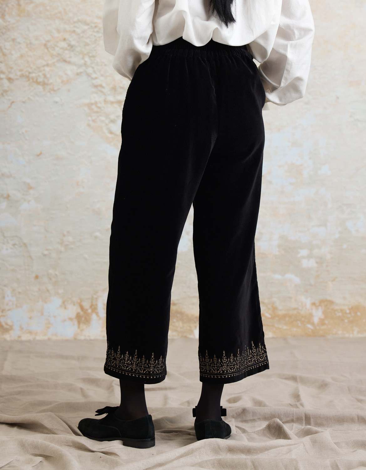 Le pantalon “Nelda” est un hommage à la richesse et au raffinement des vêtements de la Renaissance. Somptueusement paré de broderies au fil doré au niveau des chevilles, ce pantalon en velours de coton allie élégance et confort, grâce à la taille élastiquée à l’arrière. Il se ferme par une discrète fermeture éclair sur le côté gauche, et possède des poches fonctionnelles, indispensables dans toute tenue contemporaine.