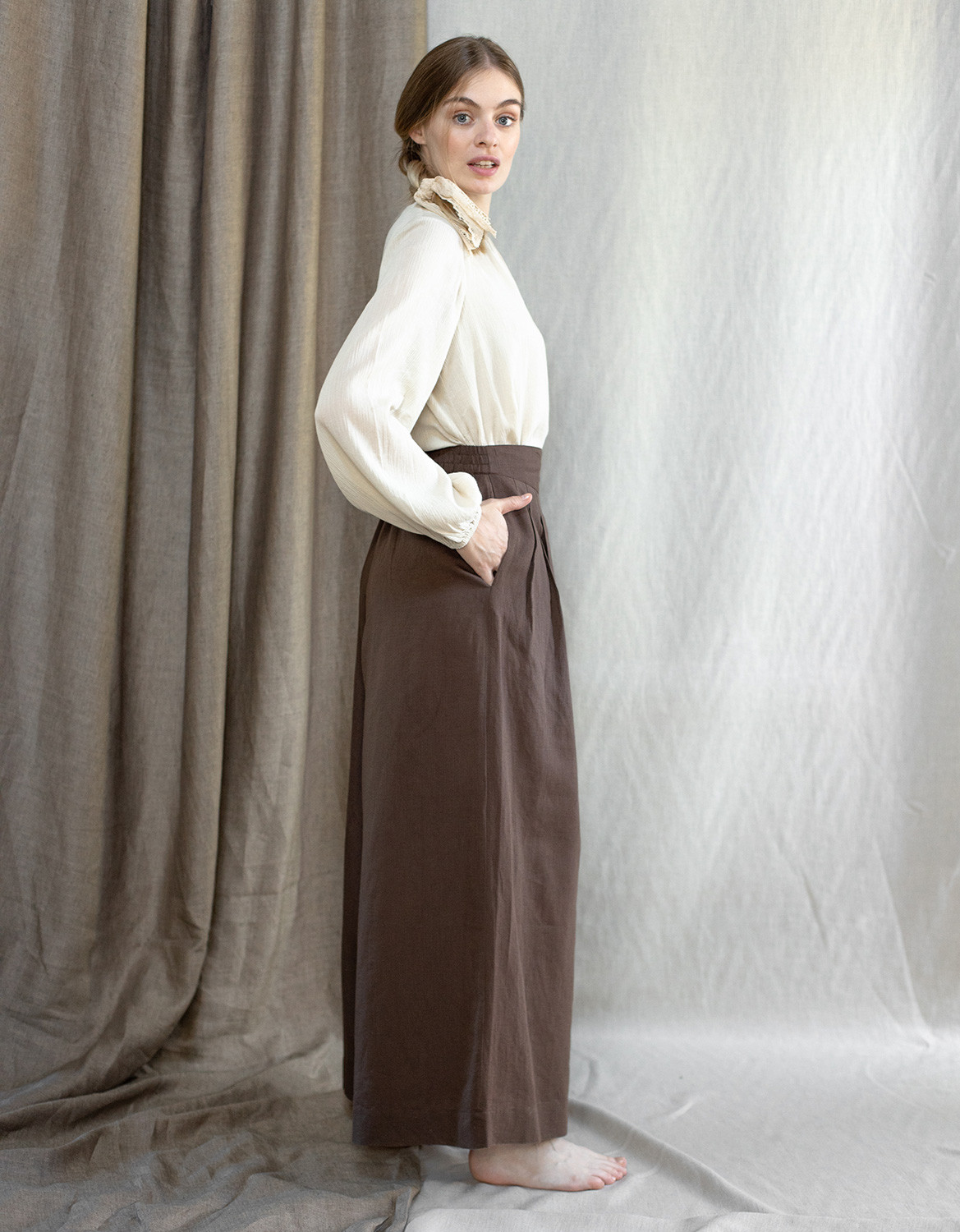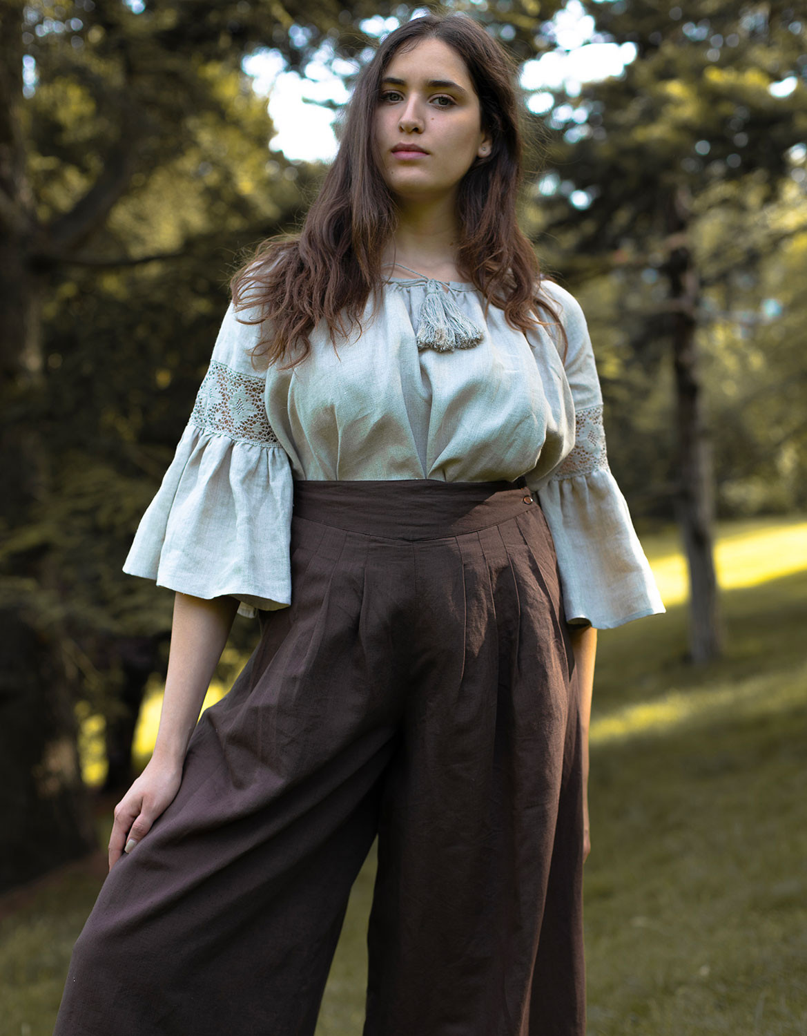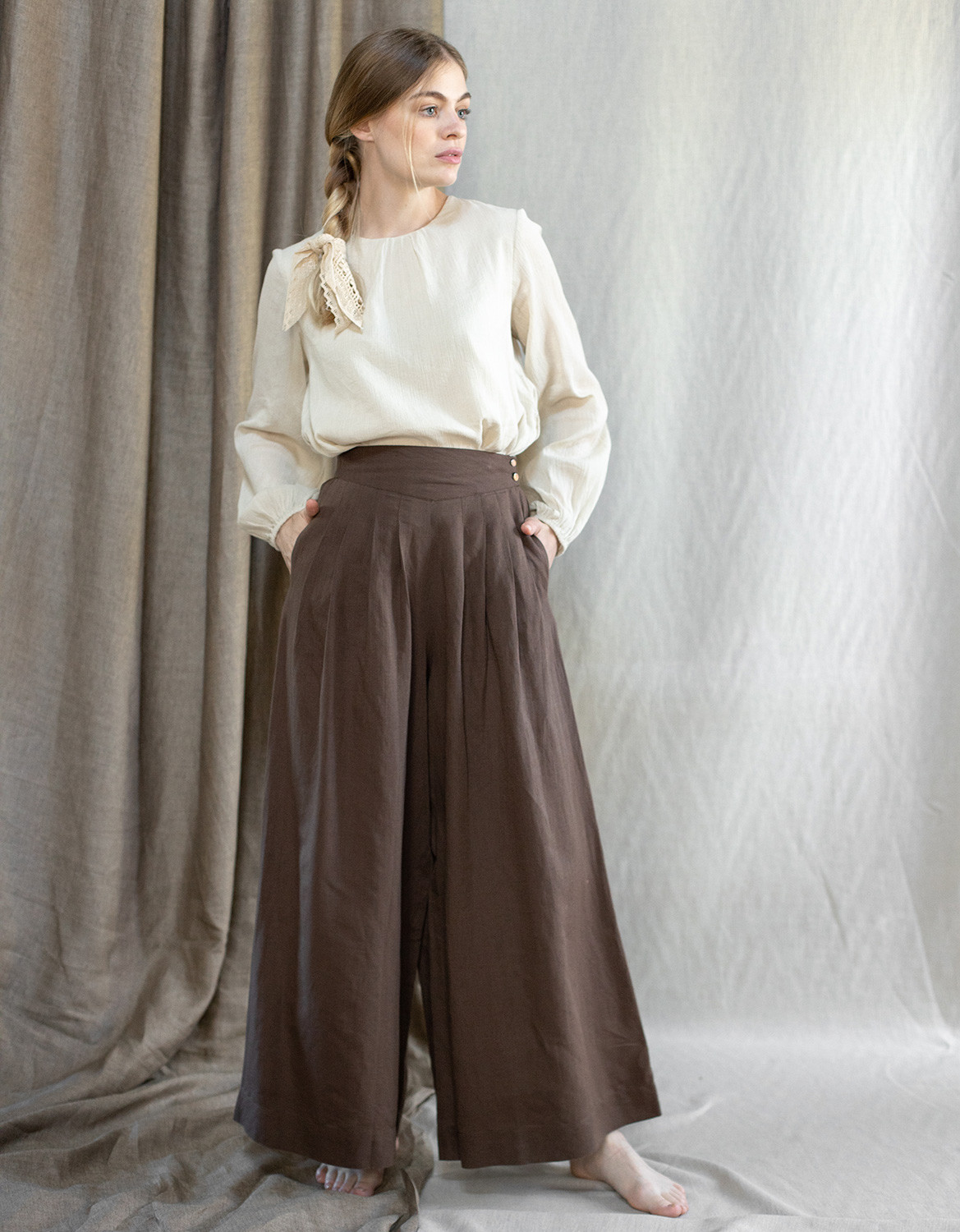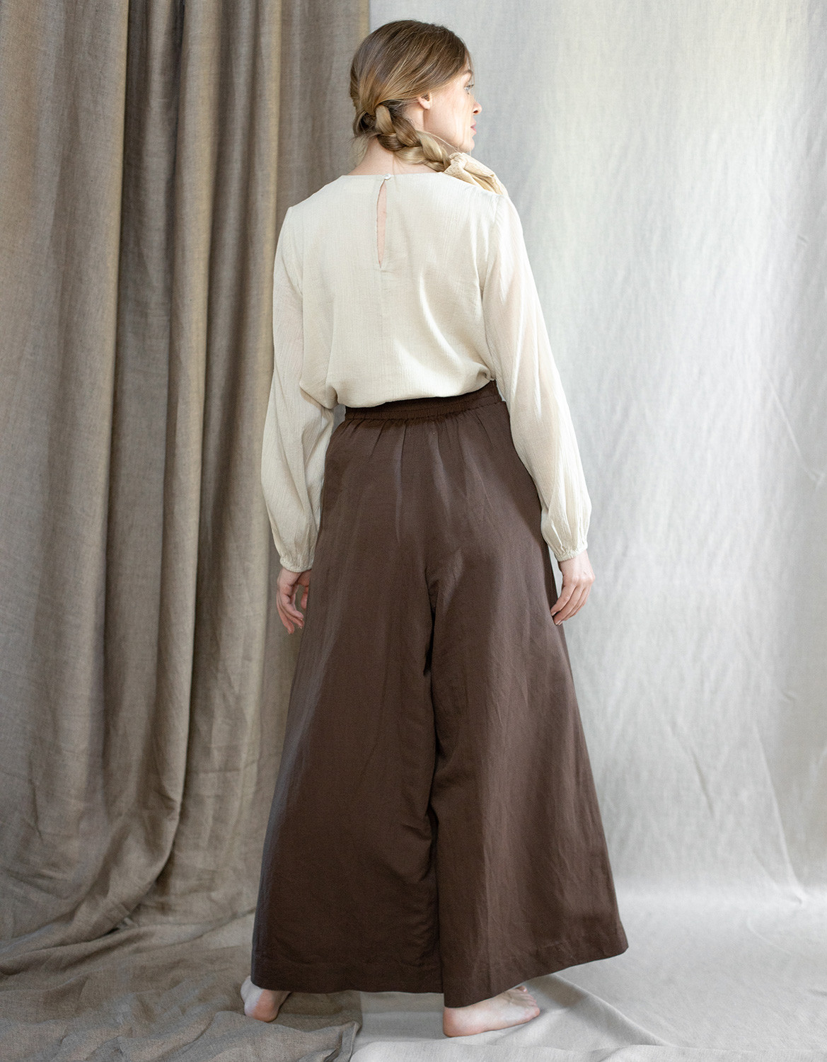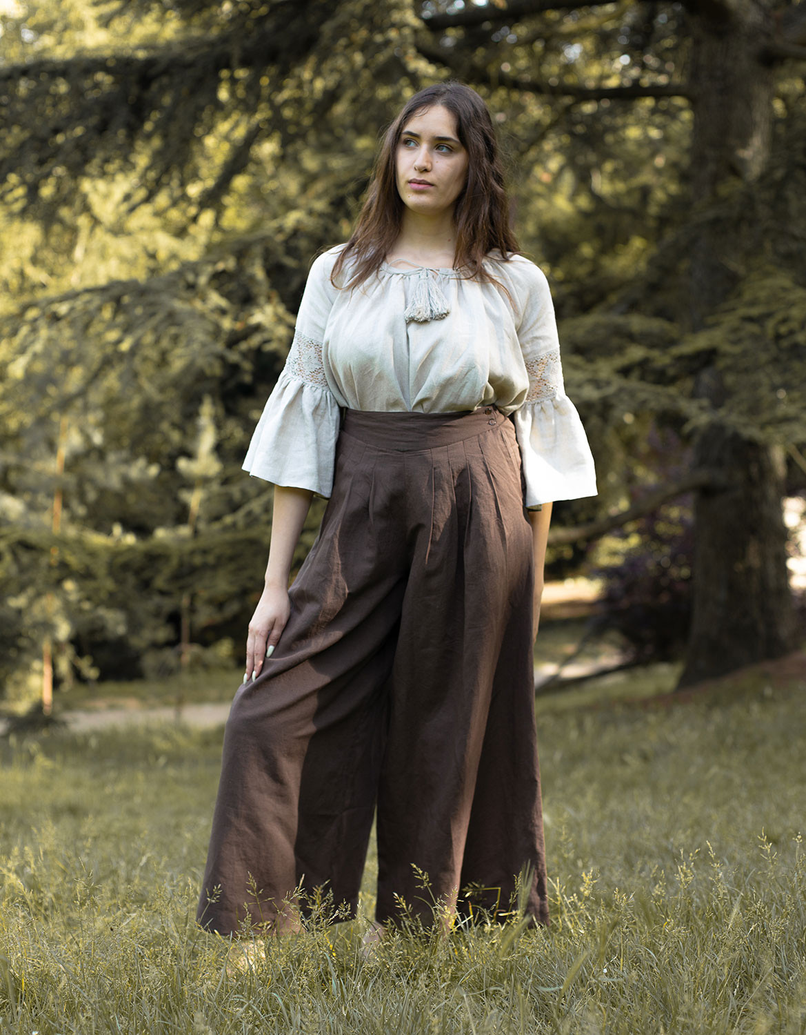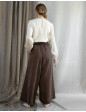Description : Pantalon palazzo long, en lin mélangé coton, avec des plis à la taille et un élastique au dos. Tissu un peu plus fin et estival que pour les autres couleurs.