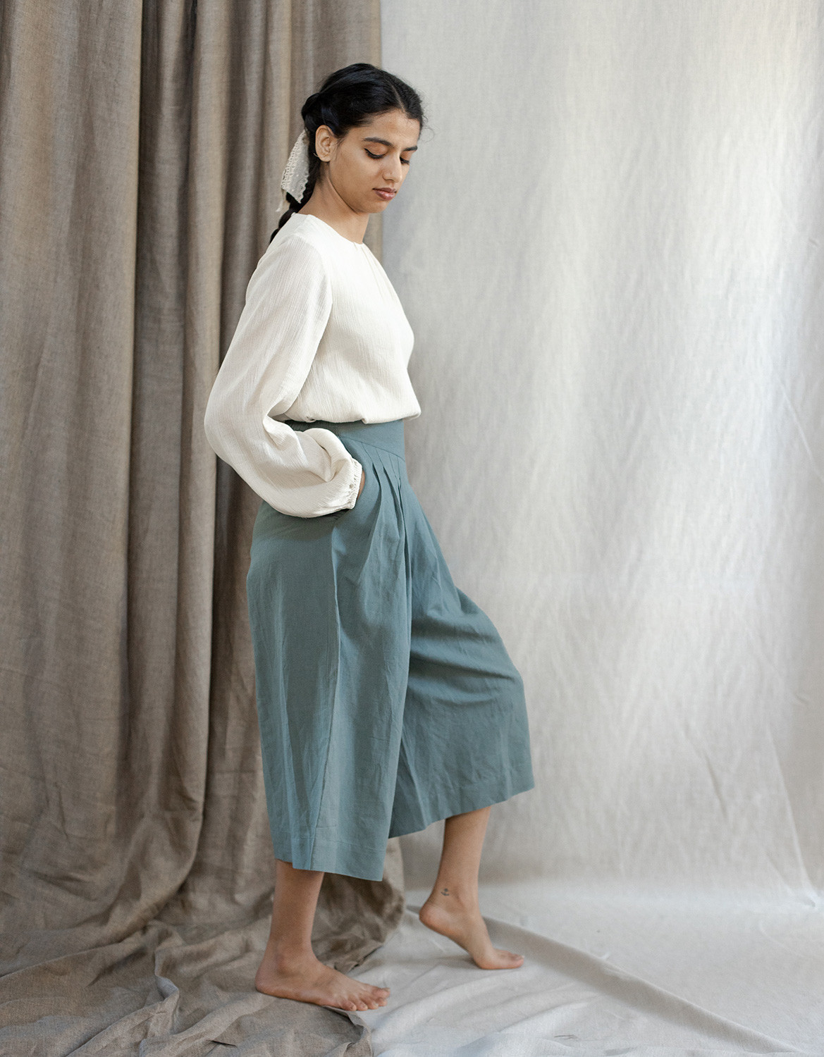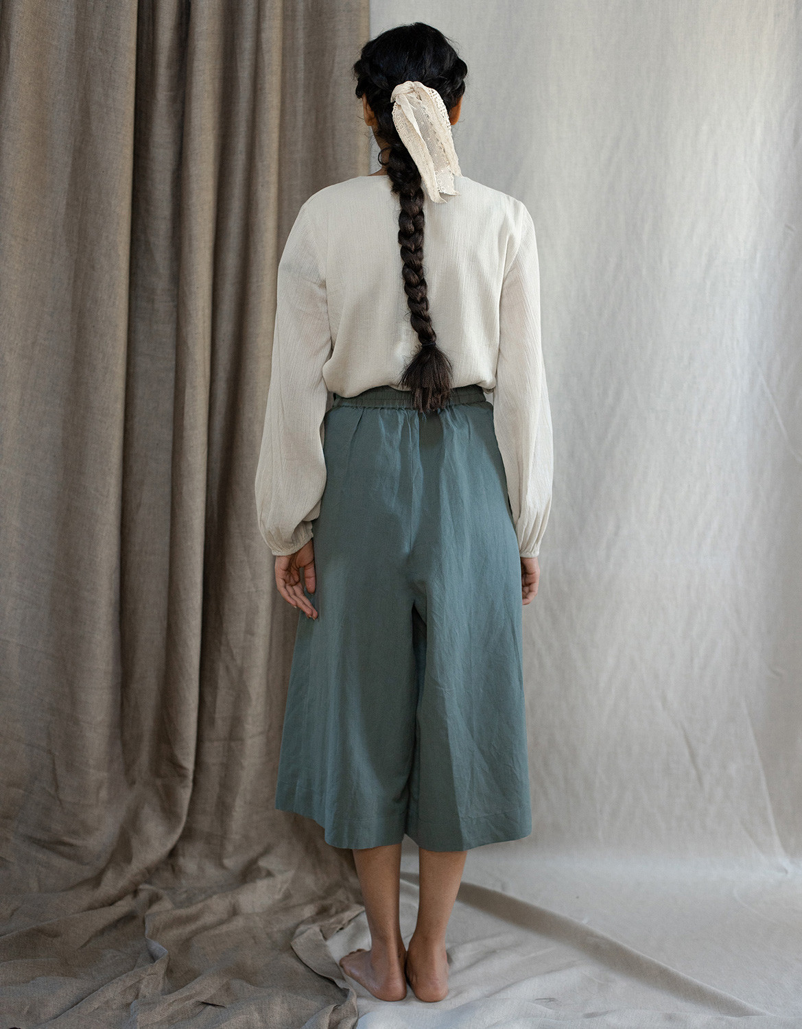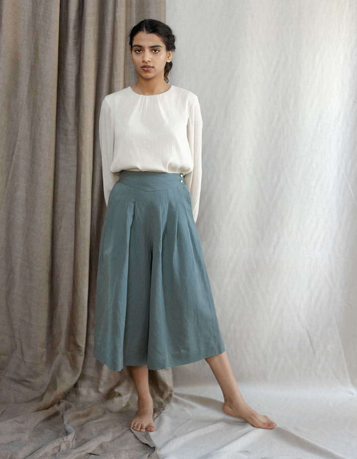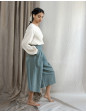 Description : Jupe culotte / pantalon palazzo midi, en lin mélangé coton, avec des plis à la taille et un élastique au dos.