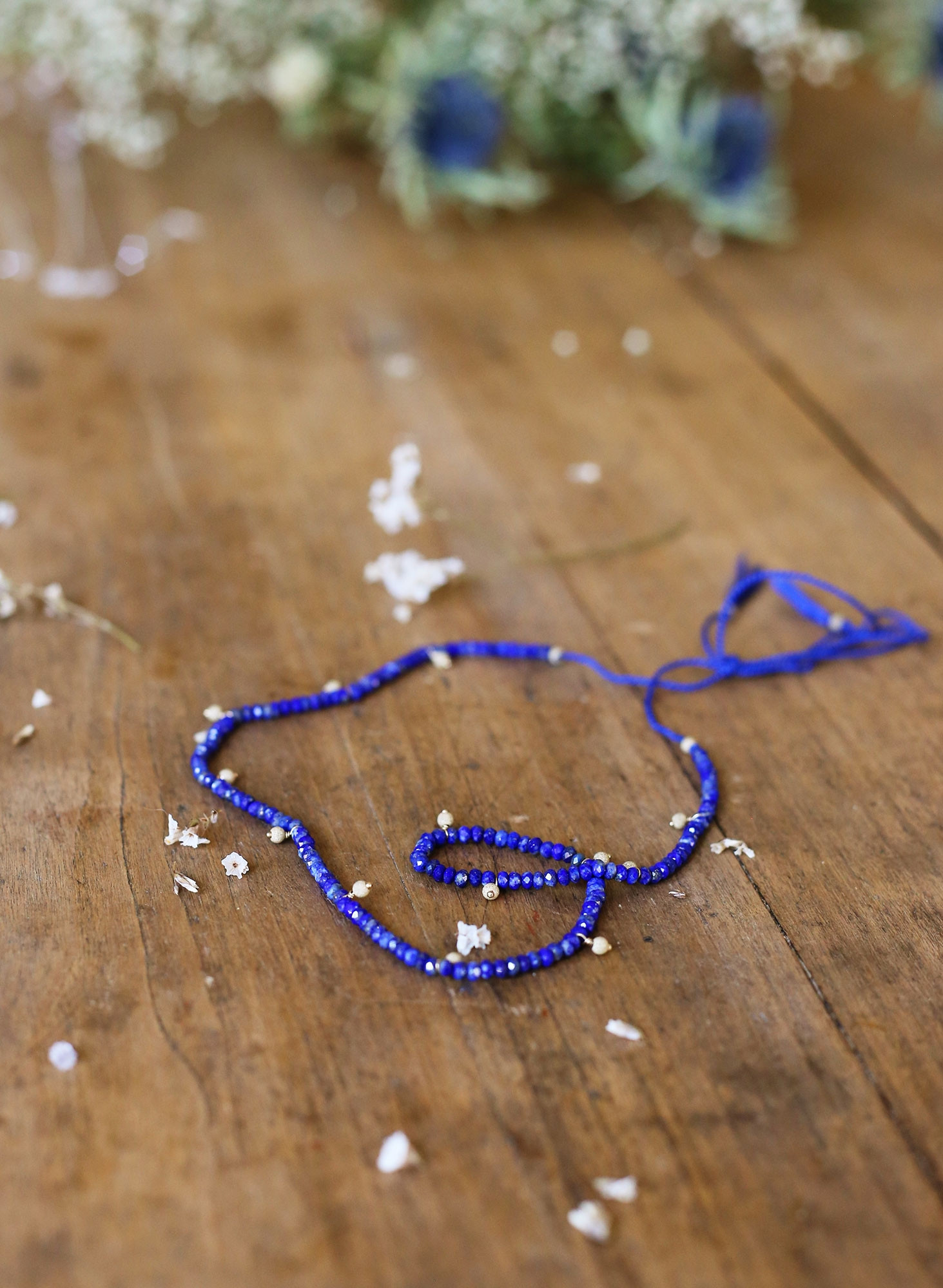Collier précieux en Sodalite avec un cordon en soie et 15 perles en en or 14 carat.