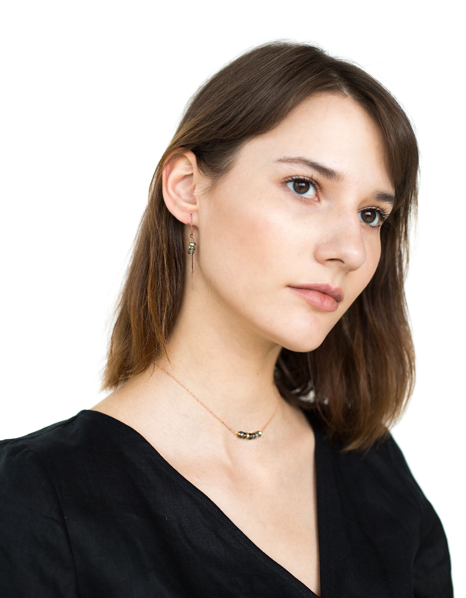 Collier en or rose 14 carat et 6 perles de Labradorite gracieusement alignées au milieu.