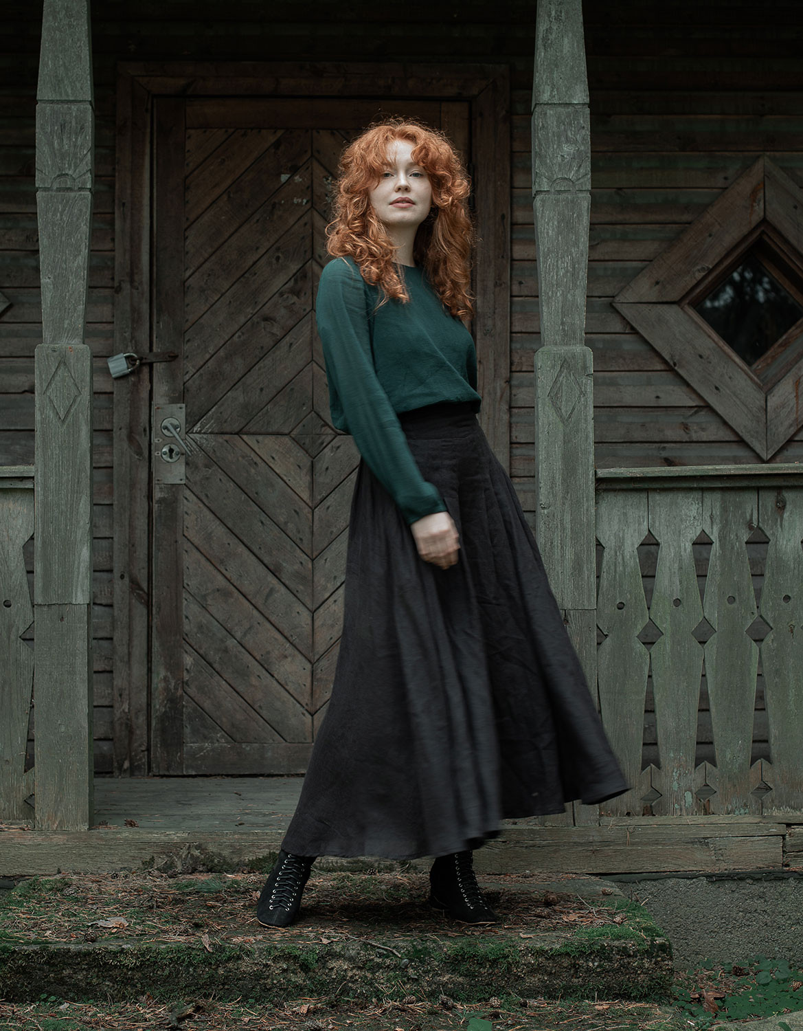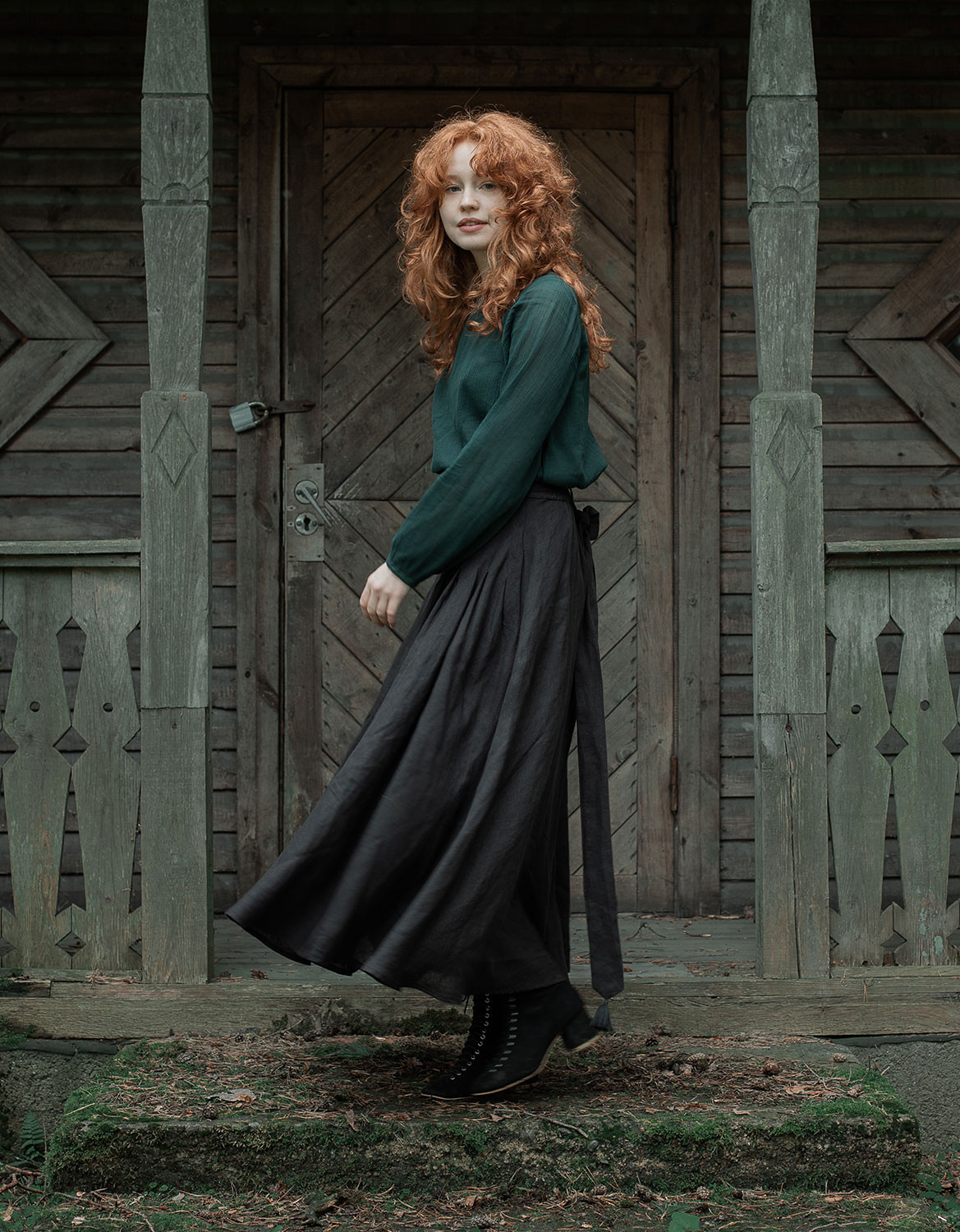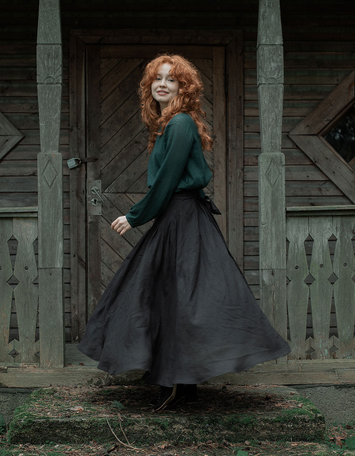 Description: Jupe longue en lin avec des plis à la taille et un élastique au dos.