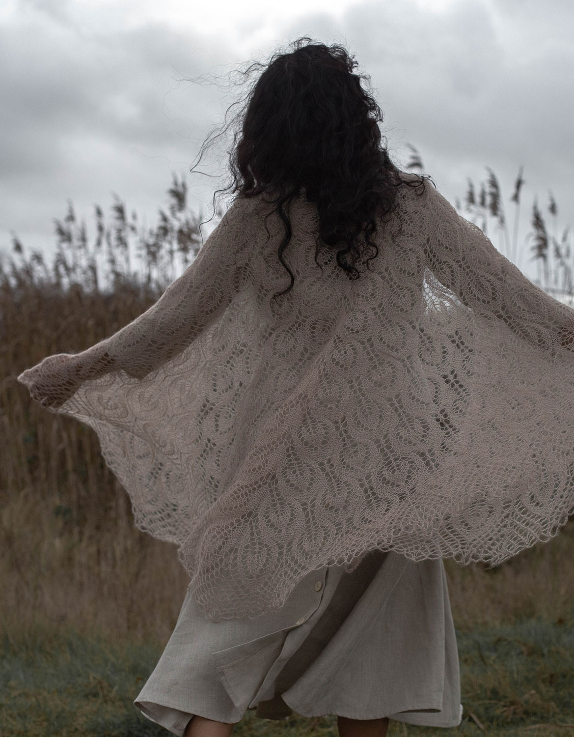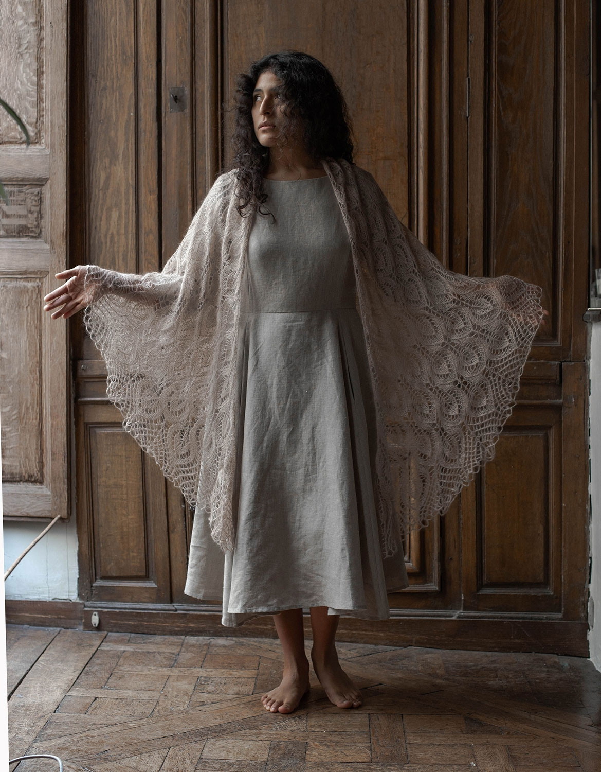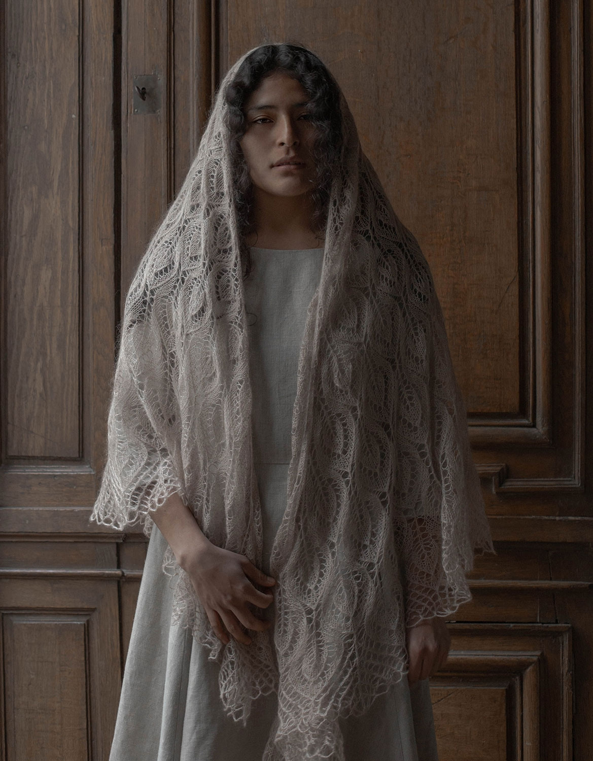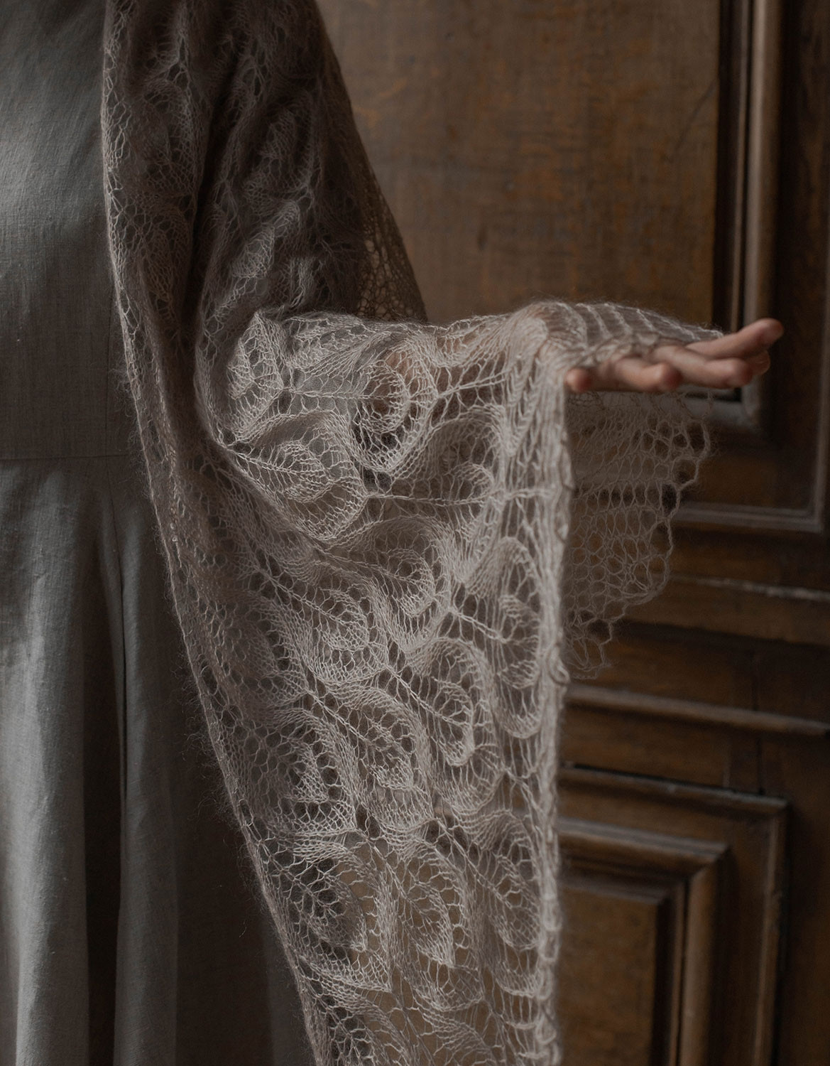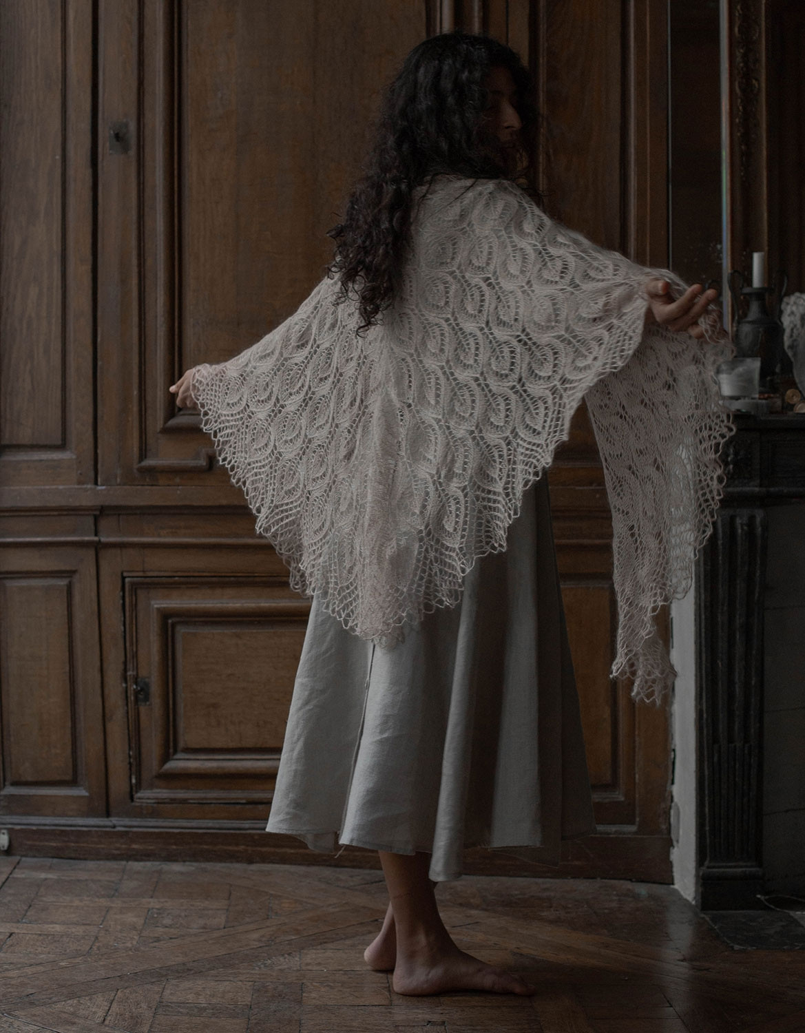 Cette merveilleuse étole a été tricotée à la main par la talentueuse Nadya en Ukraine selon un savoir-faire artisanal de haut niveau.