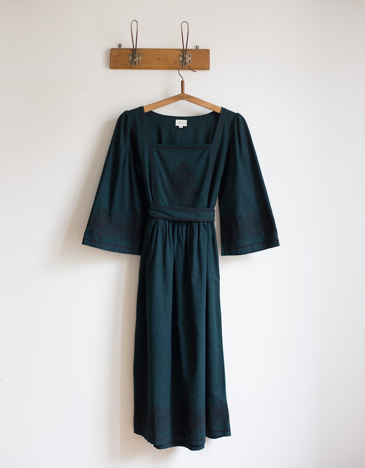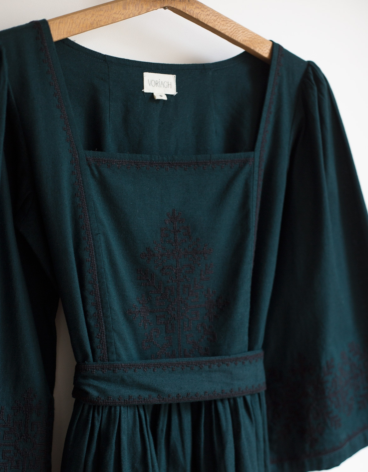 Description : robe longue inspirée du folklore letton : la broderie illustre l'arbre de la vie « Austra » Austras koks, variacija. La robe a des poches.