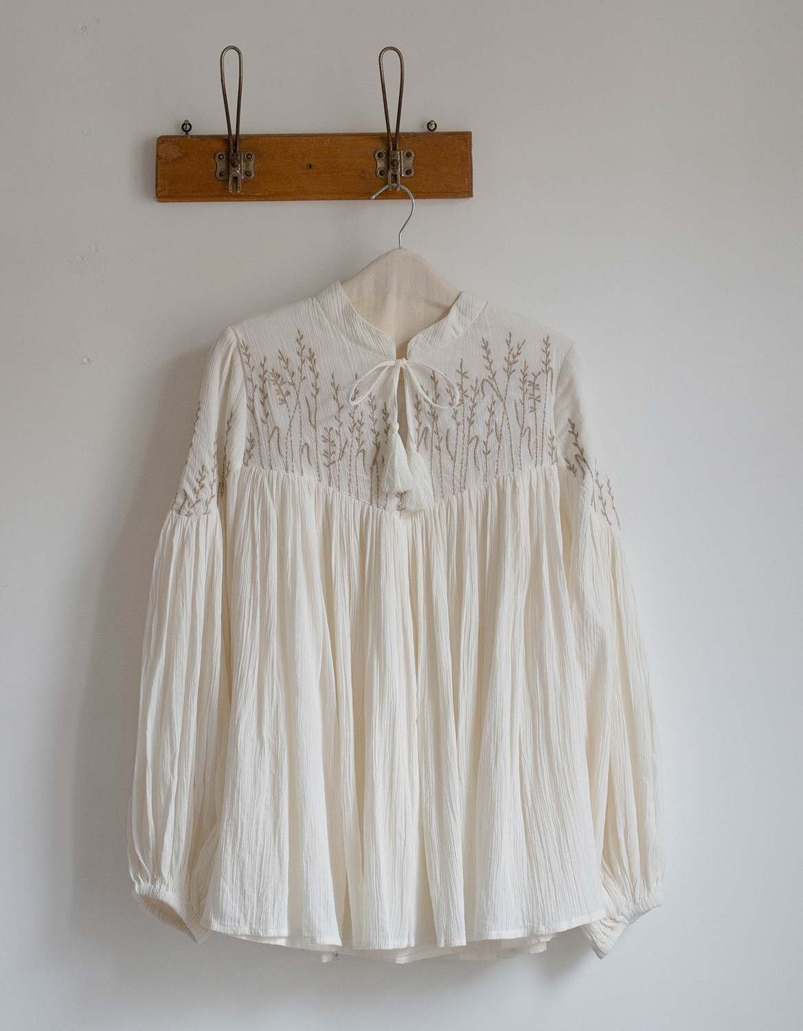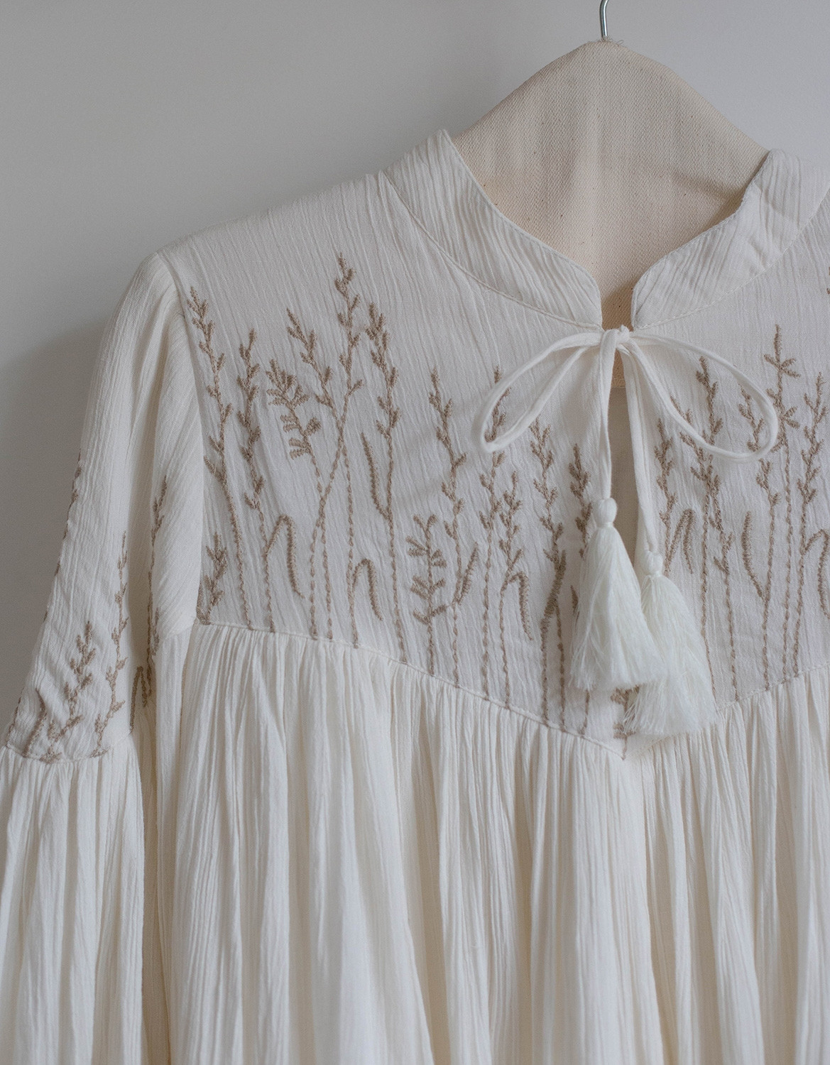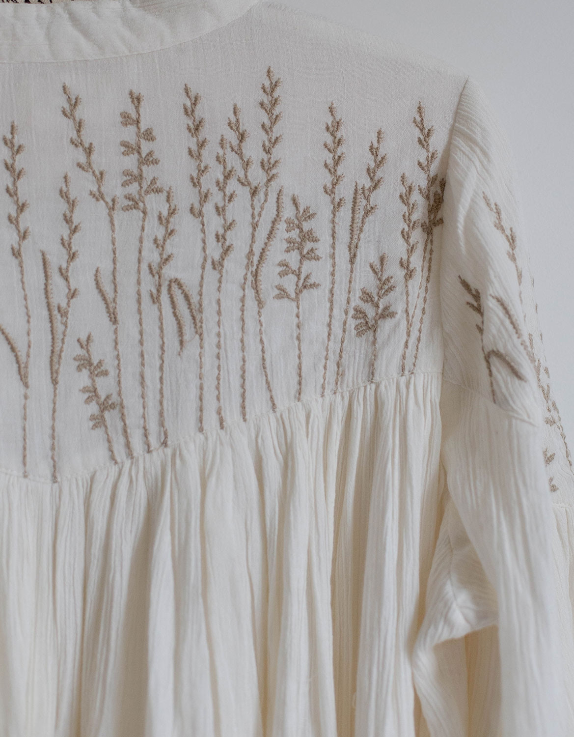 Description: blouse en crêpe de coton brodé avec des petits brins de blé et d’orge. Entièrement doublé sauf les bras.