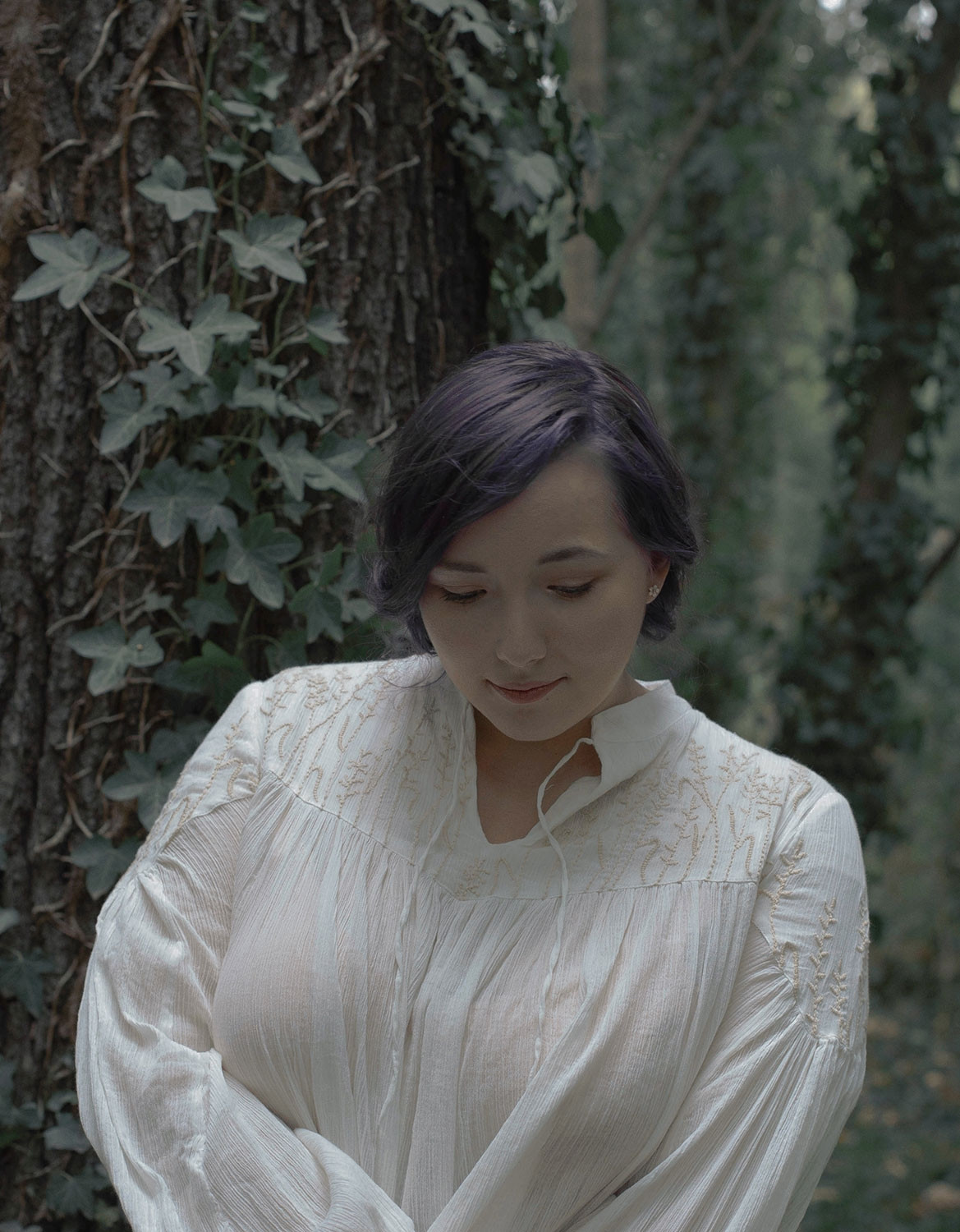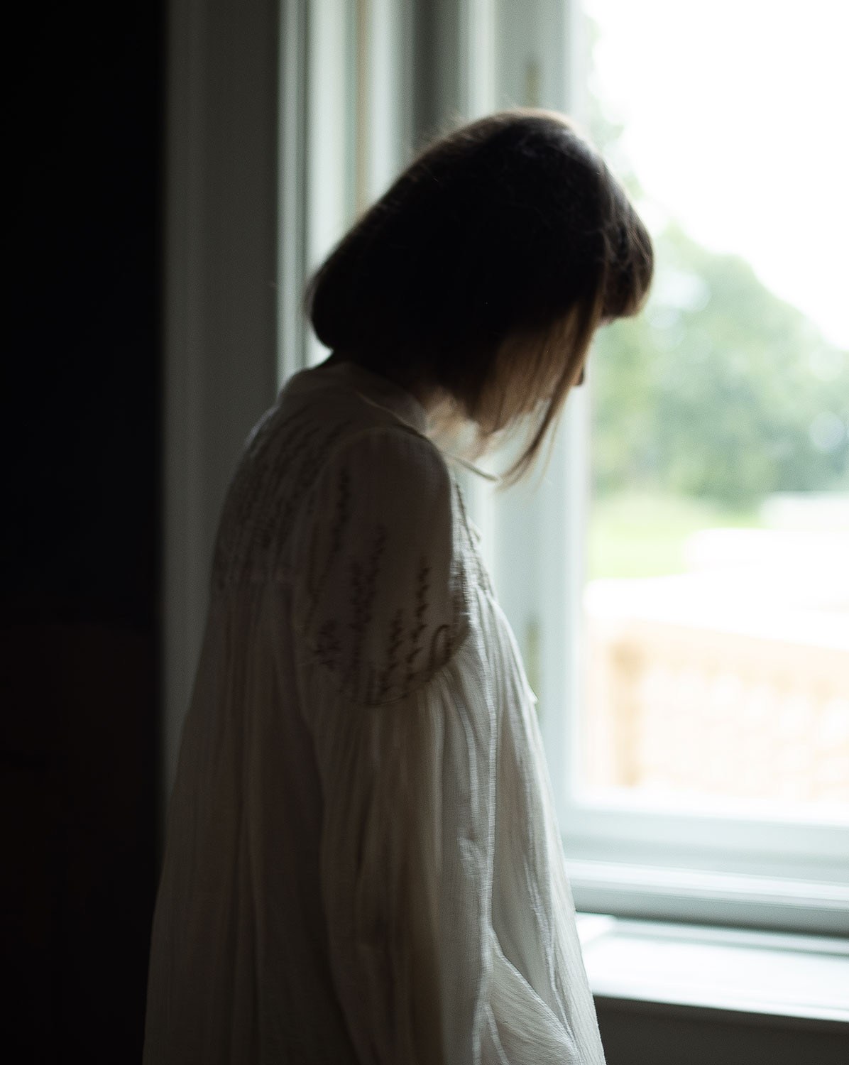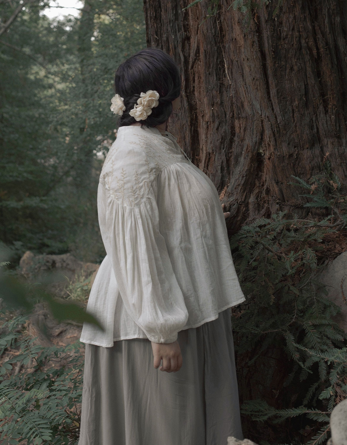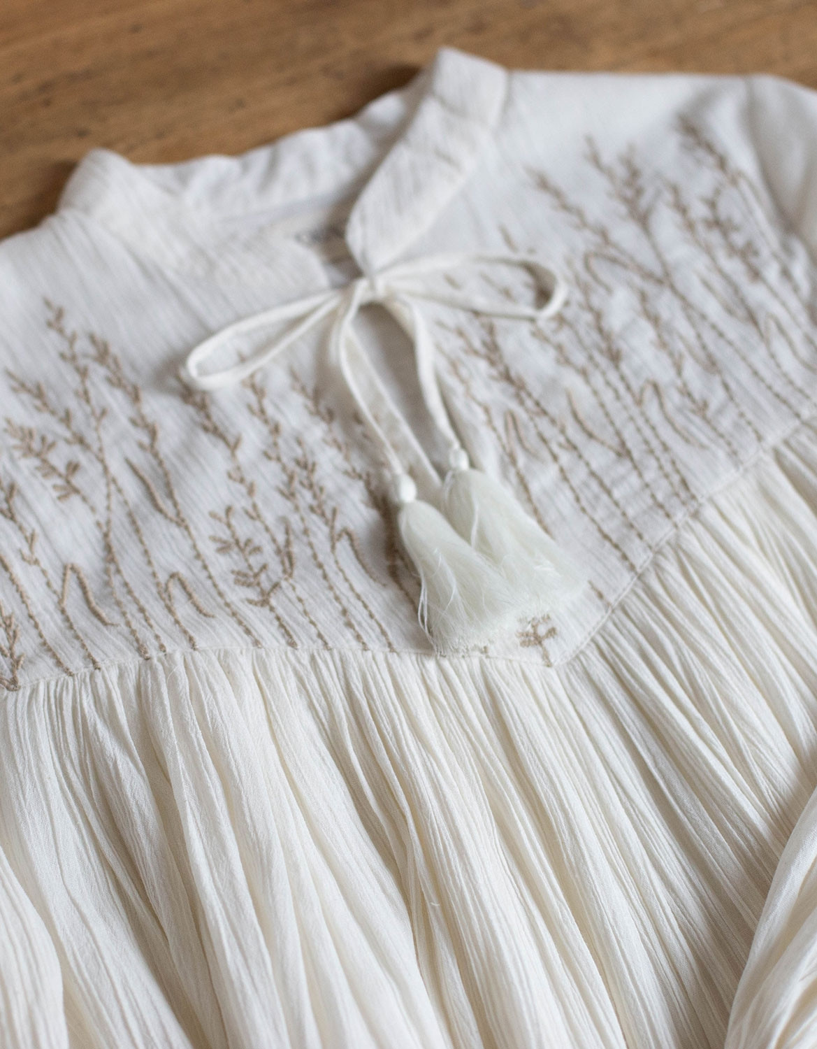 Description: blouse en crêpe de coton brodé avec des petits brins de blé et d’orge. Entièrement doublé sauf les bras.