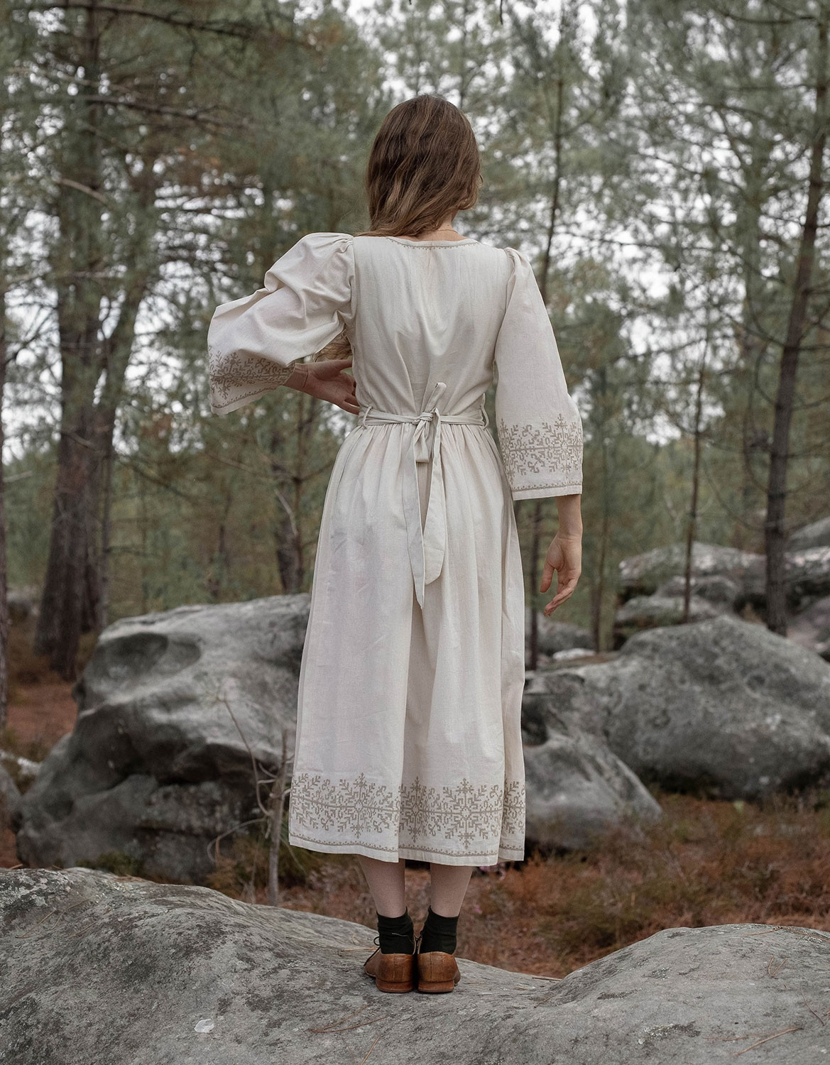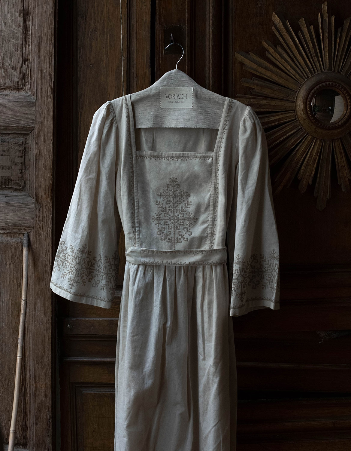 Description : robe longue inspirée du folklore letton : la broderie illustre l'arbre de la vie « Austra » Austras koks, variacija. La robe a des poches.