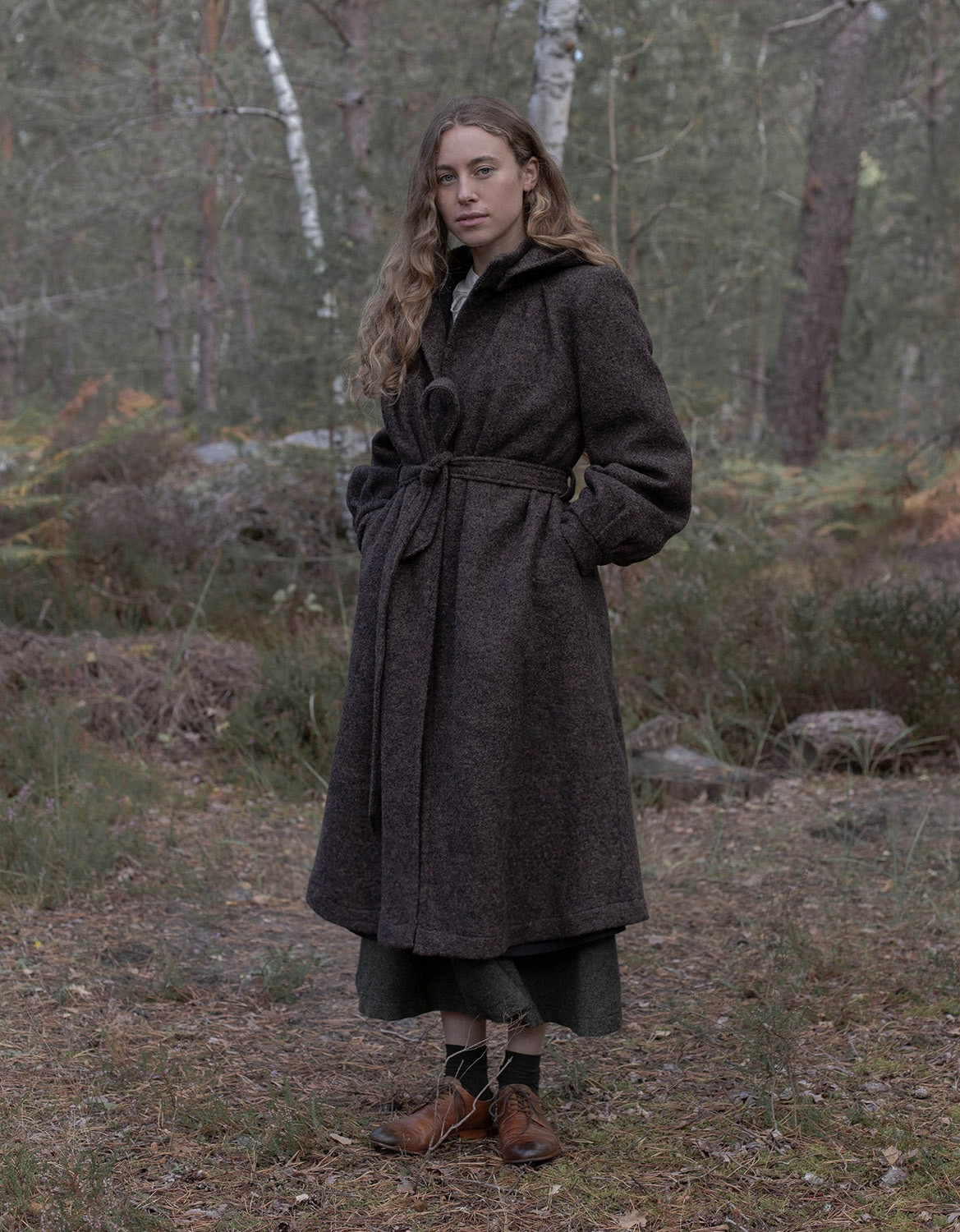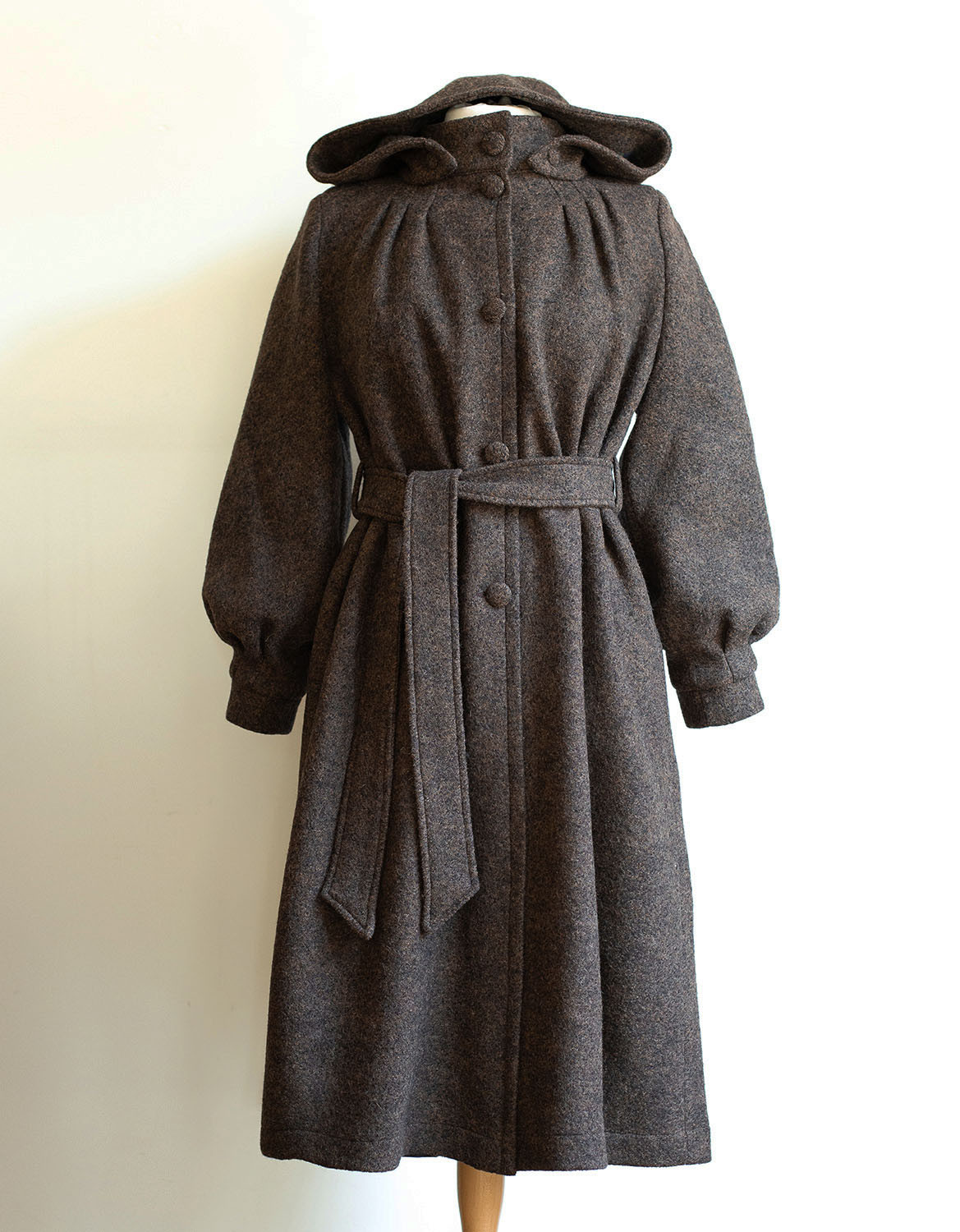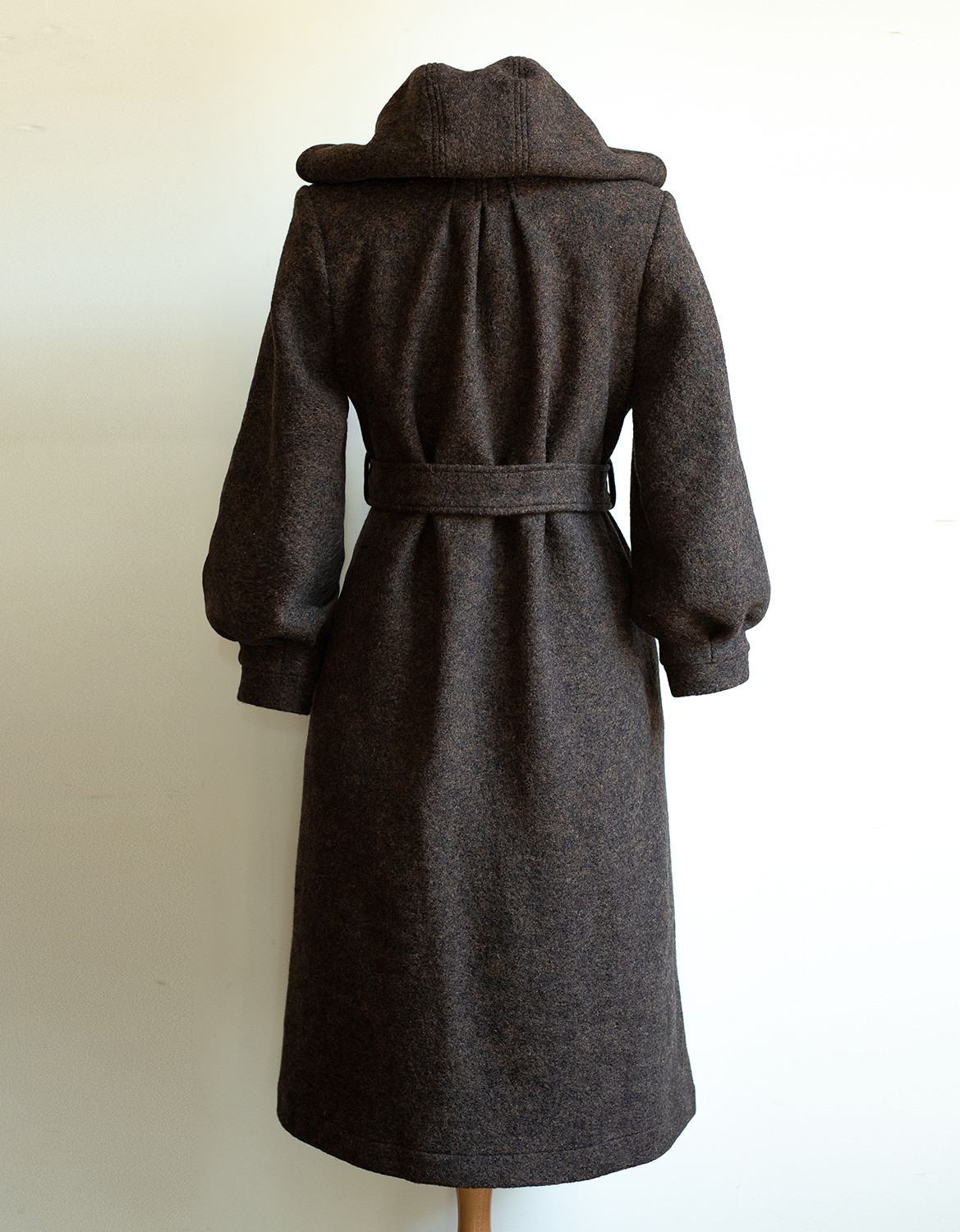 Description: Manteau long, ample et chaud 100% pure laine (Walk Wolle Autrichienne), à nouer à la taille, capuche amovible, entièrement doublé en satin de coton.