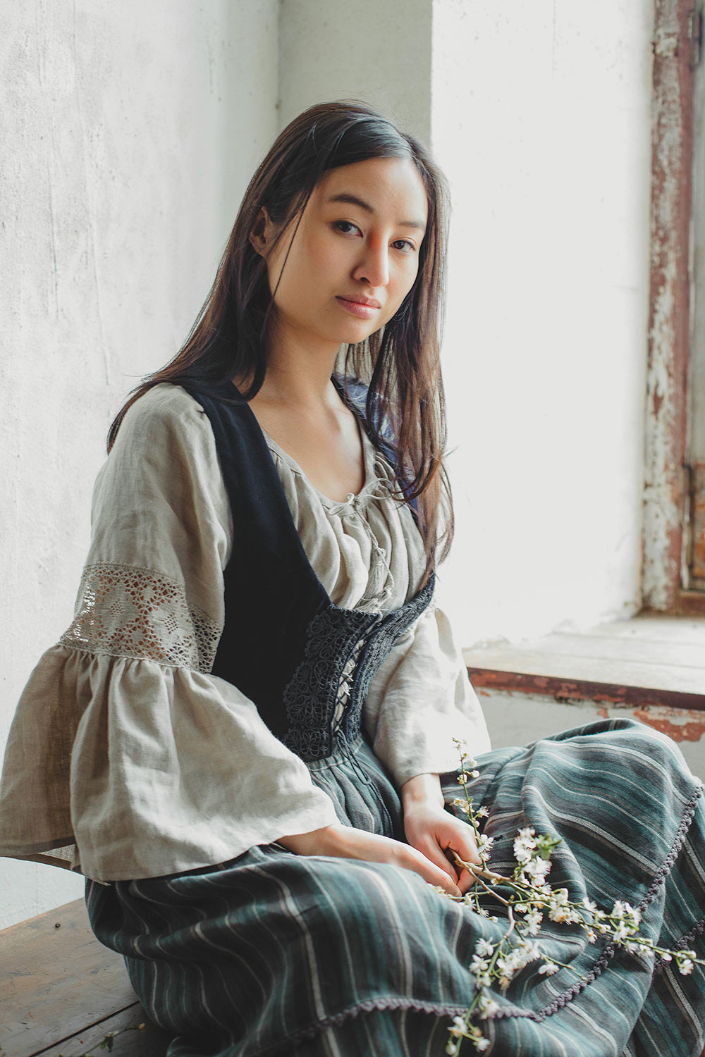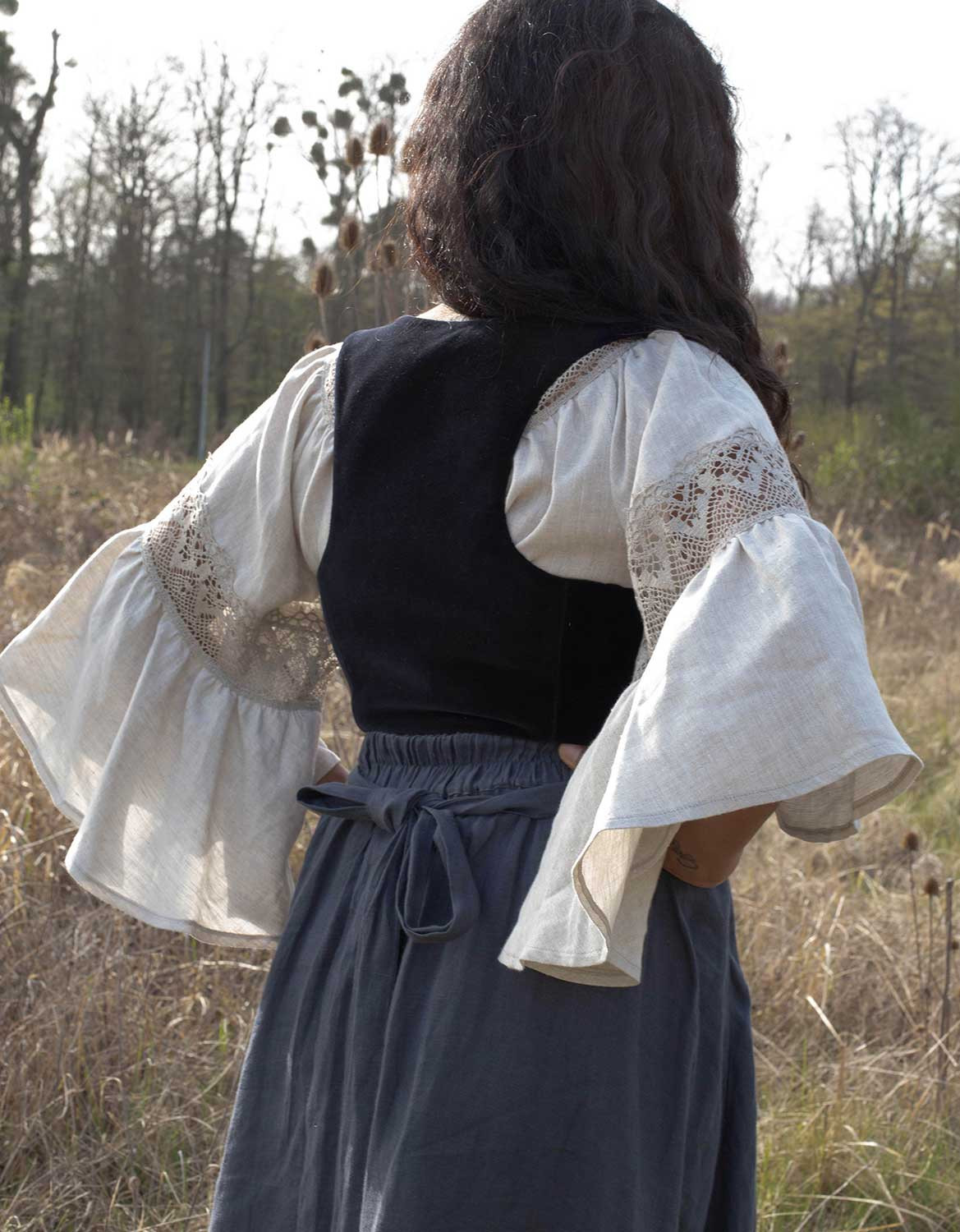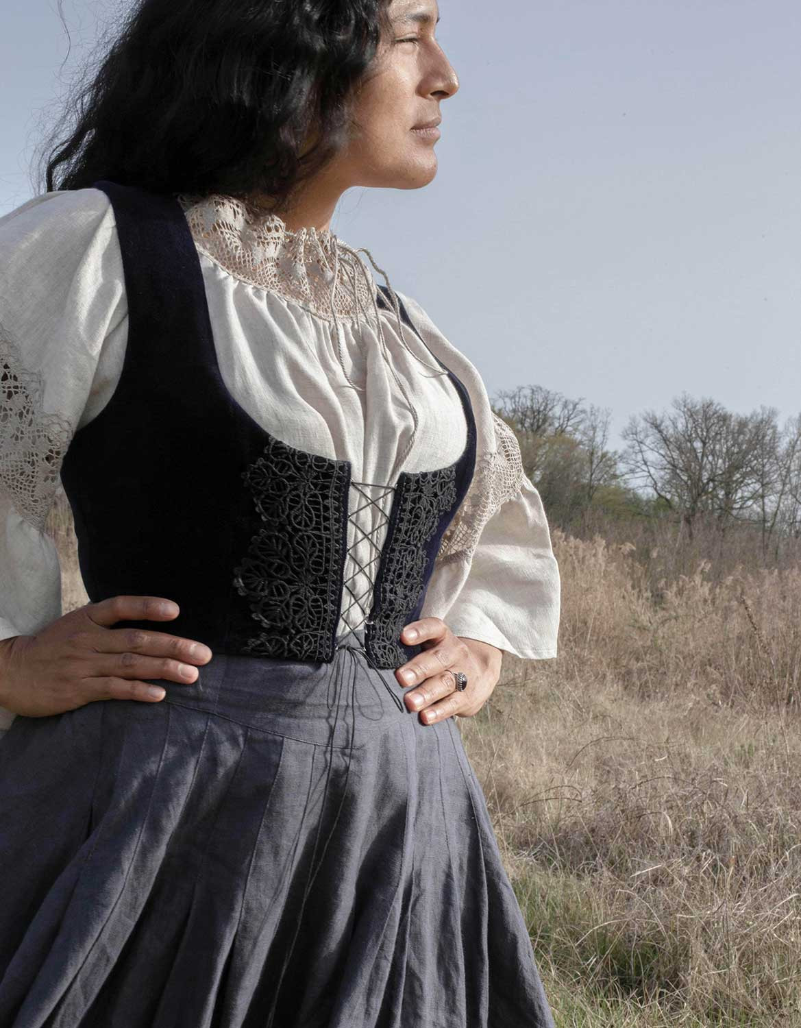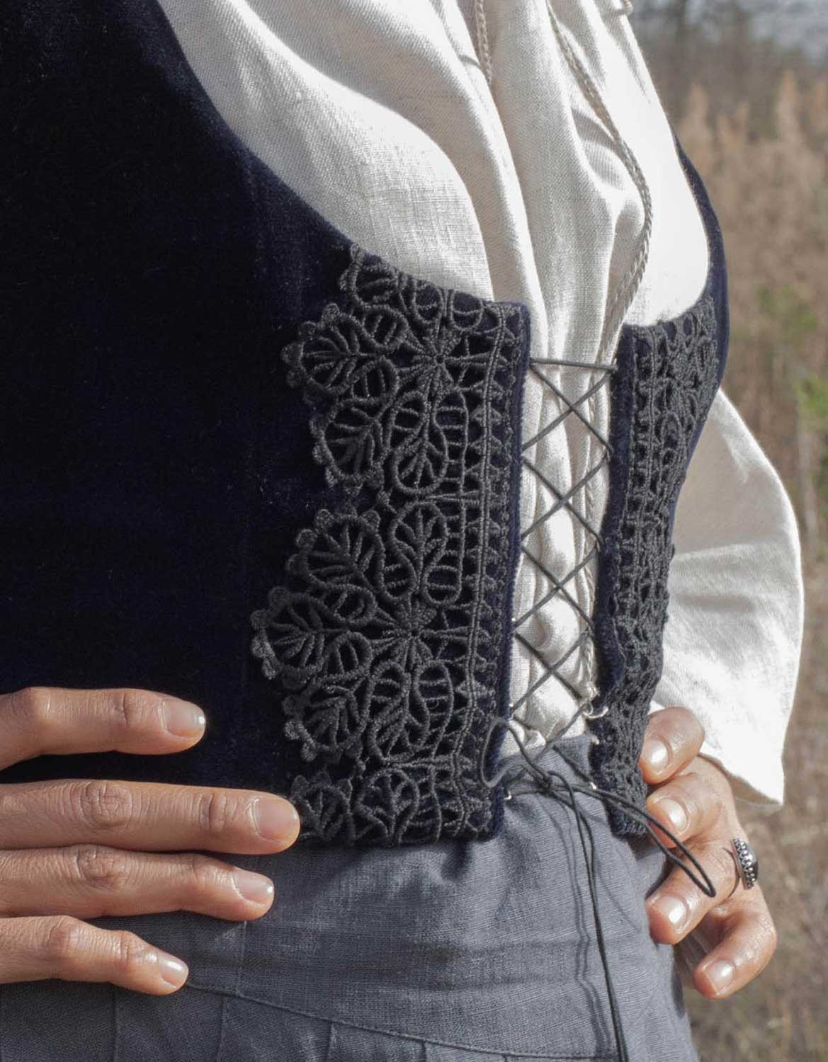 Description : Bustier bas inspiré du folklore Serbe, en velours de coton, avec un joli laçage sur le devant. Le bustier a été développé de façon à marier les formes harmonieusement, peu importe le volume de la poitrine.