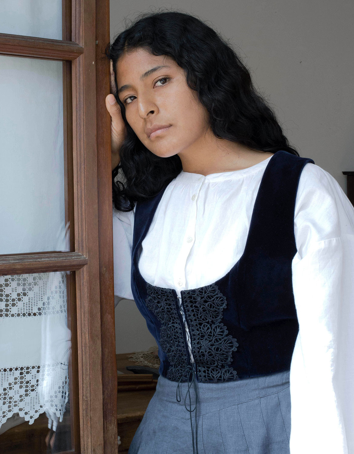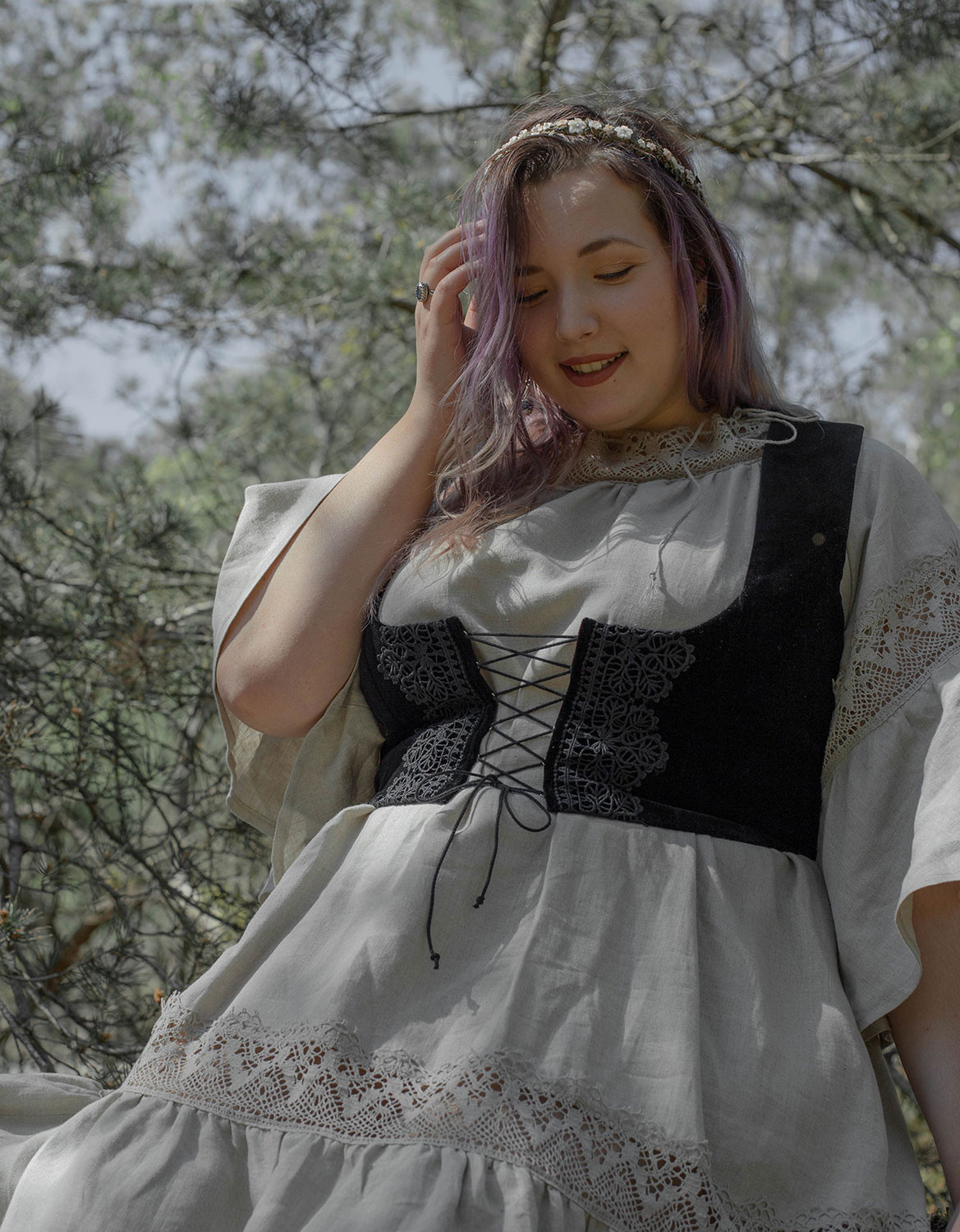 Description : Bustier bas inspiré du folklore Serbe, en velours de coton, avec un joli laçage sur le devant. Le bustier a été développé de façon à marier les formes harmonieusement, peu importe le volume de la poitrine.