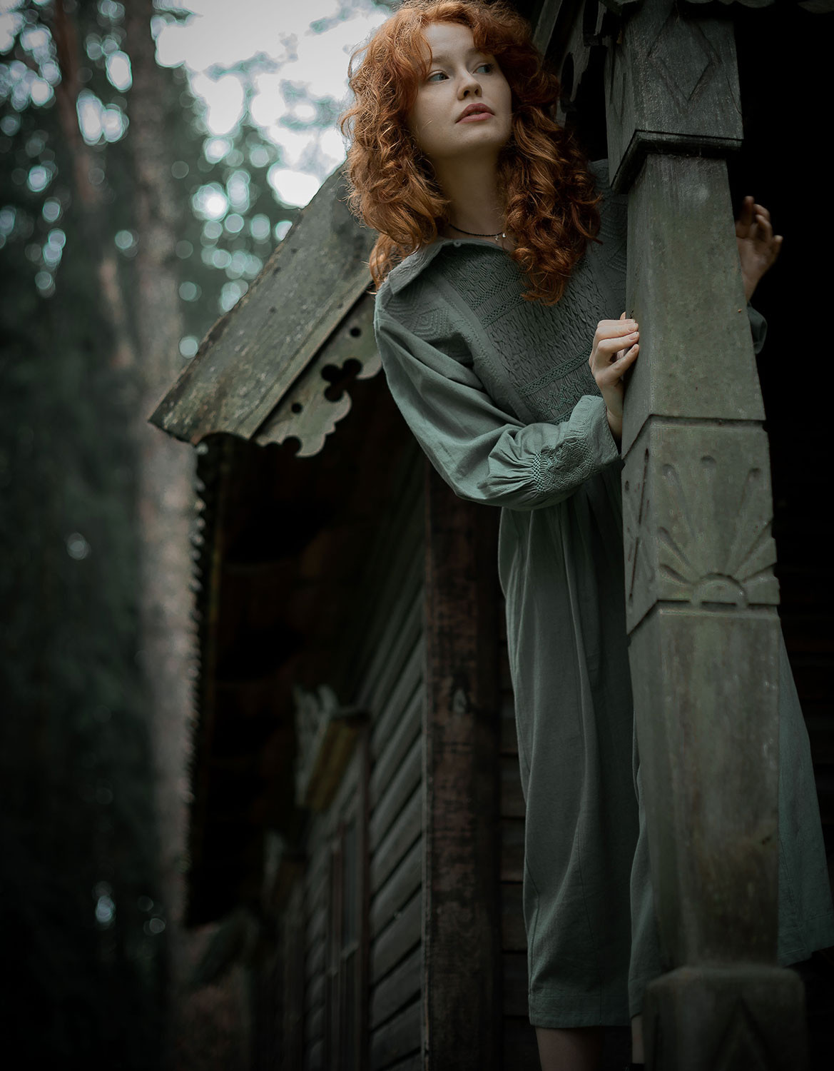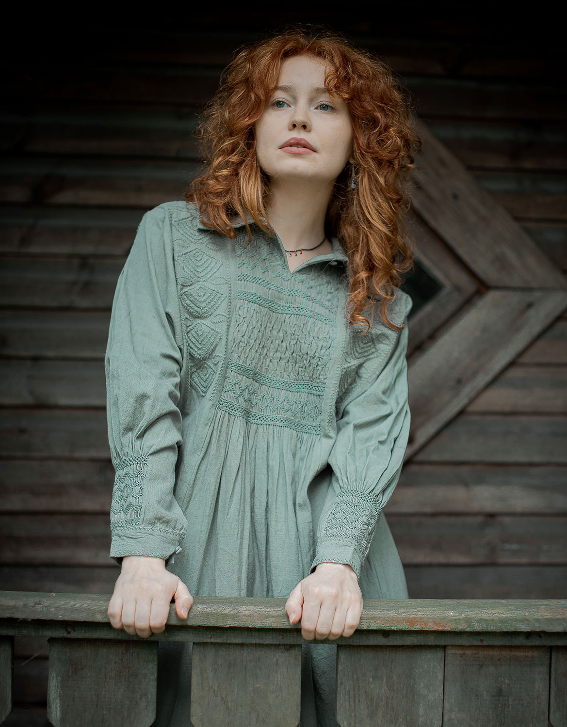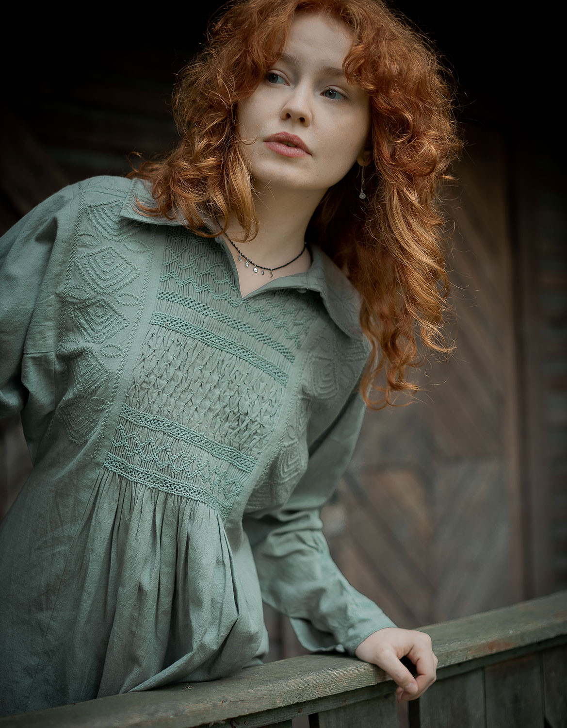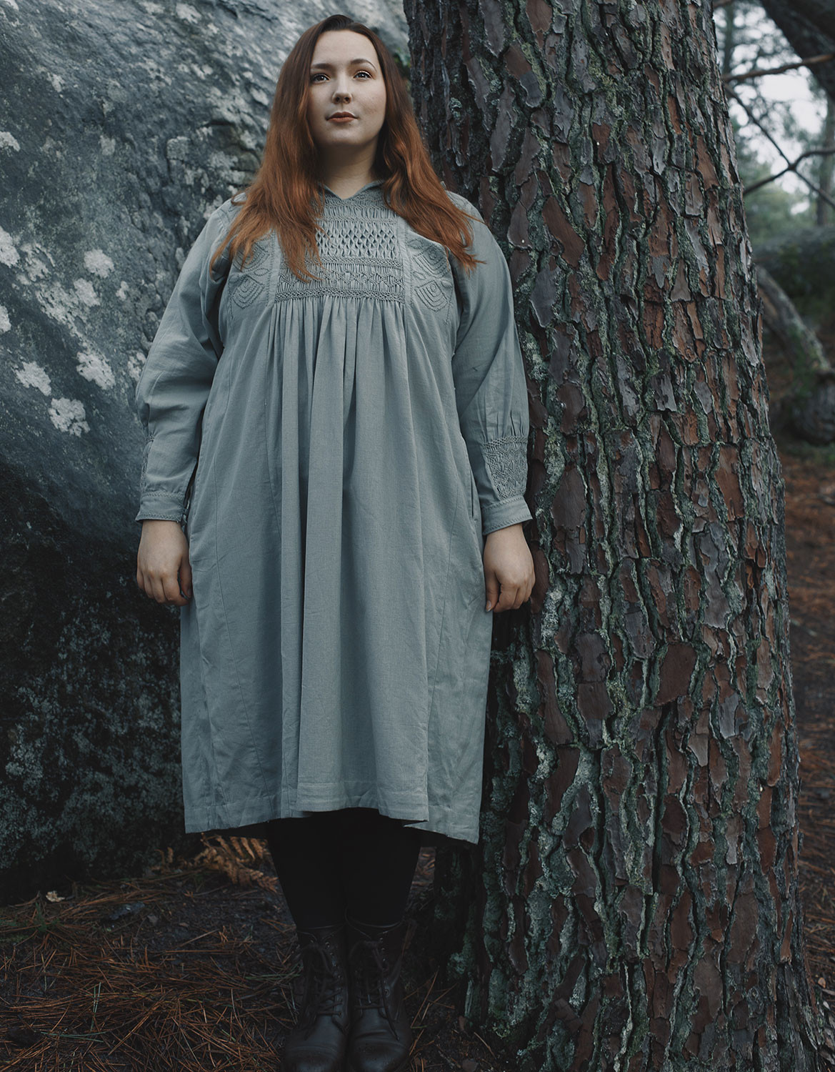 Description : Robe, smockée à la main, réplique d’un habit rural anglais du 18ème nommé « English smock ».
