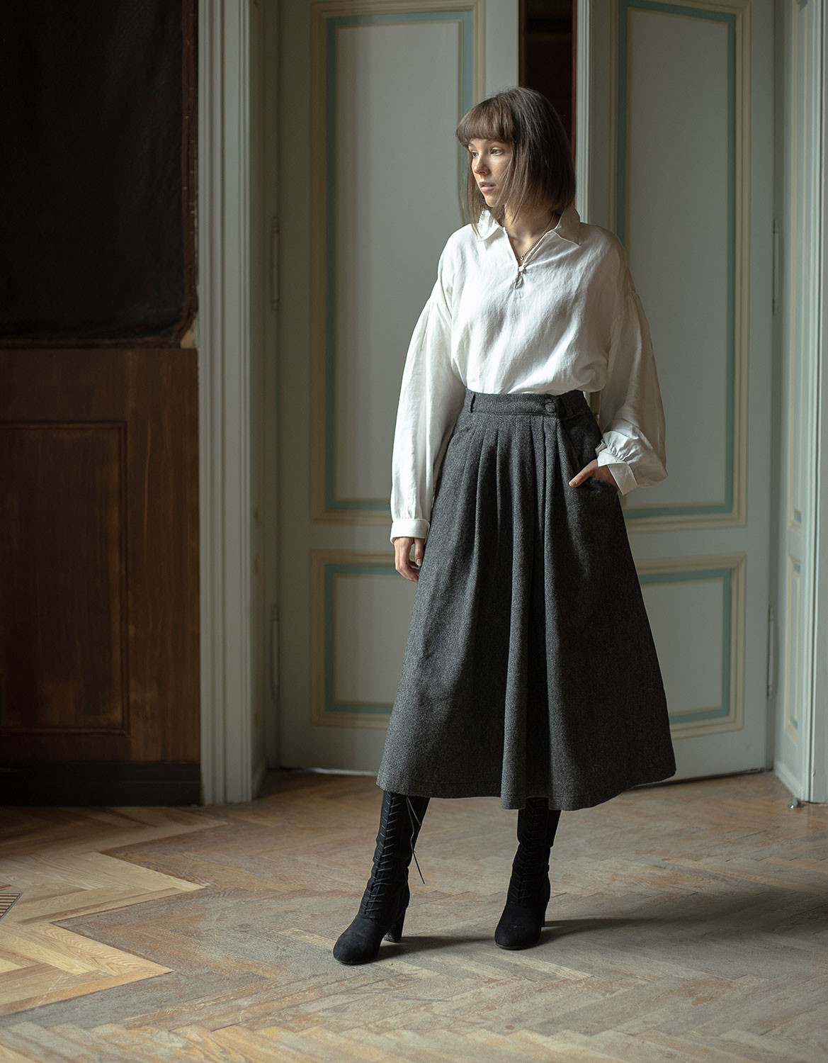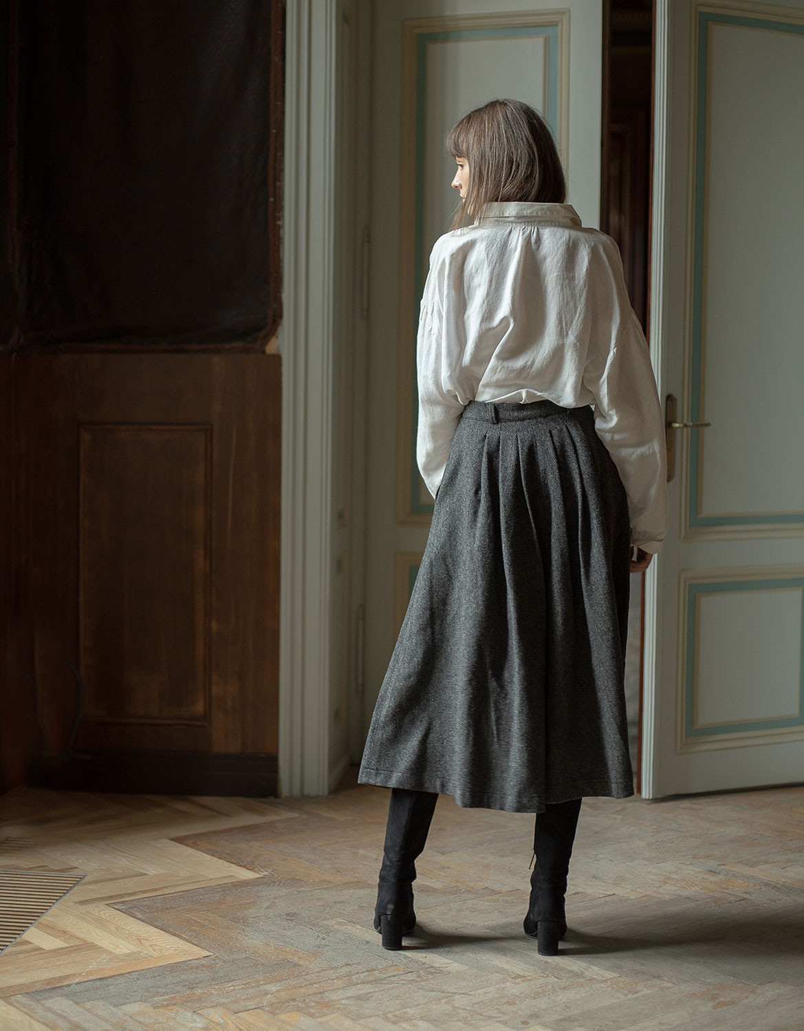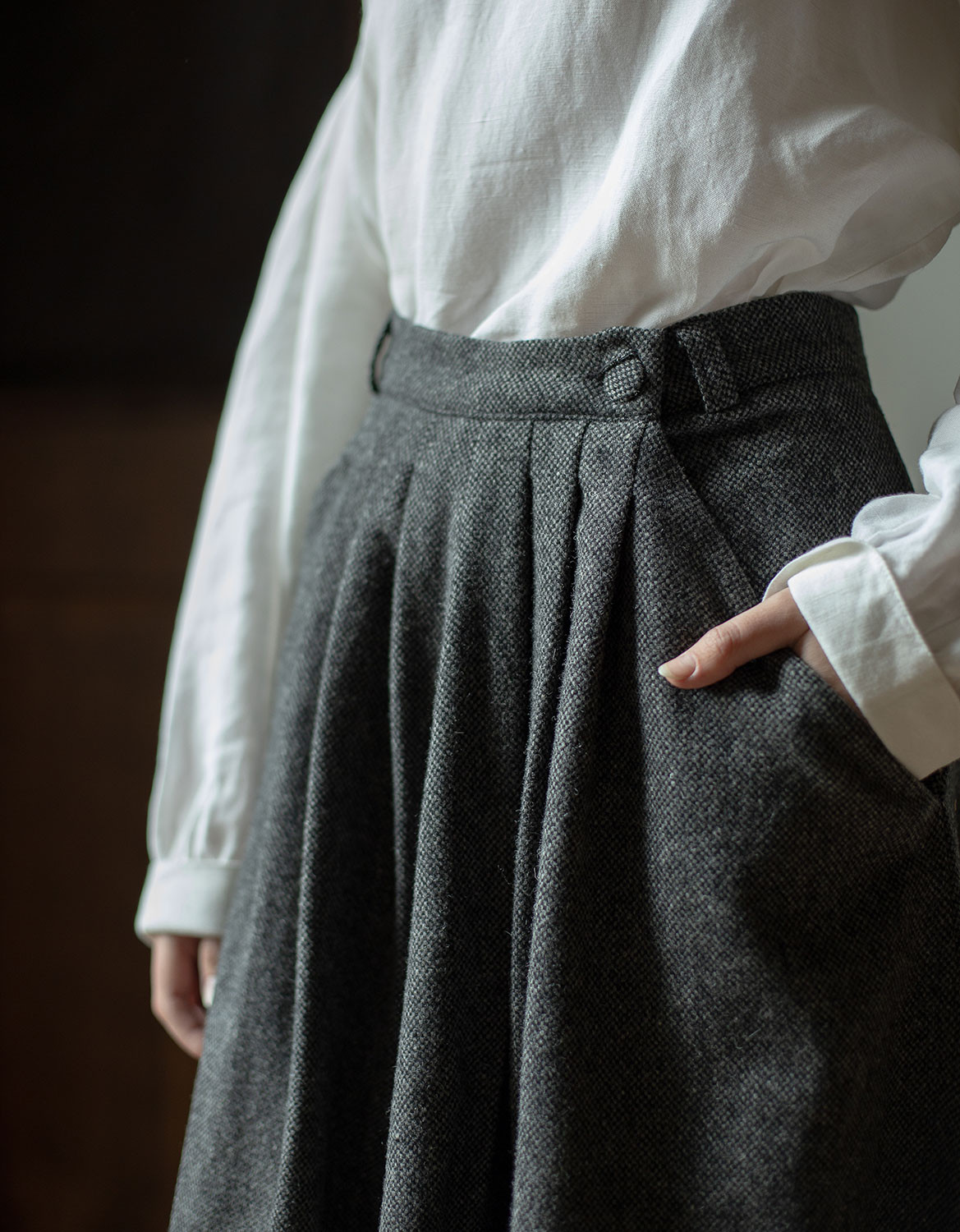 Description : Jupe évasée taille haute à pinces en 100% pure laine tweed avec poches. Fermeture croisée devant. Version améliorée avec une fermeture éclair cachée pour compléter la poche cotée gauche.