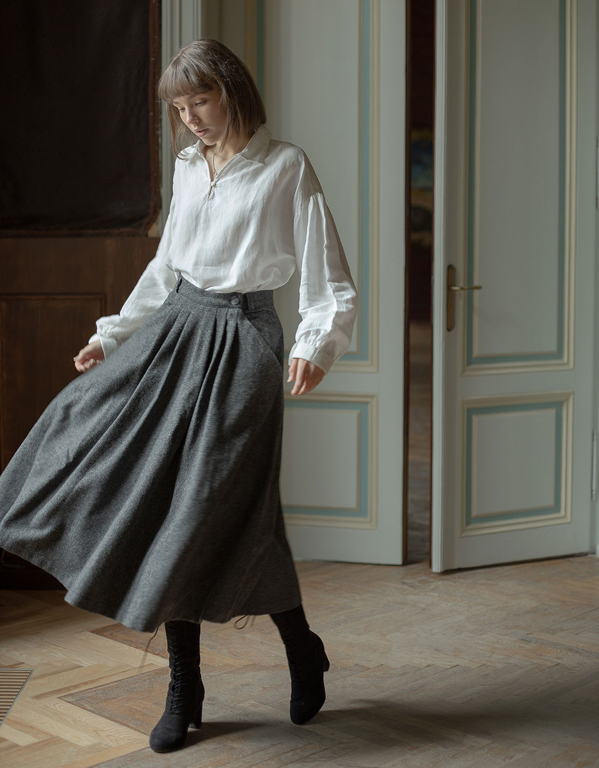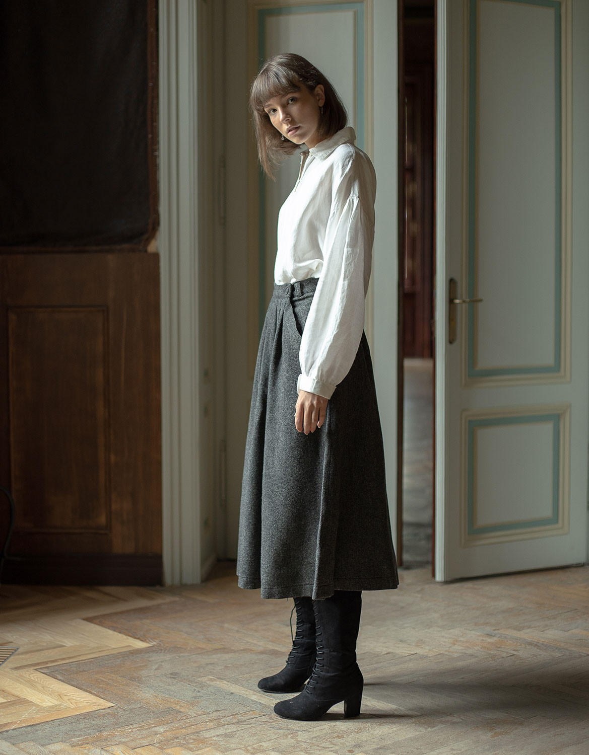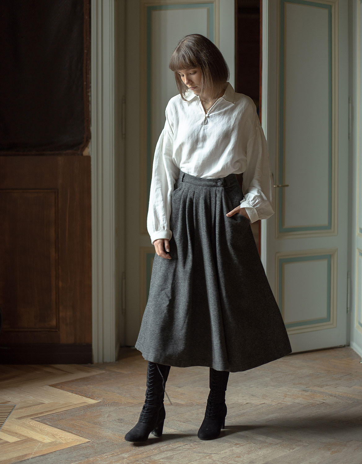 Description : Jupe évasée taille haute à pinces en 100% pure laine tweed avec poches. Fermeture croisée devant. Version améliorée avec une fermeture éclair cachée pour compléter la poche cotée gauche.