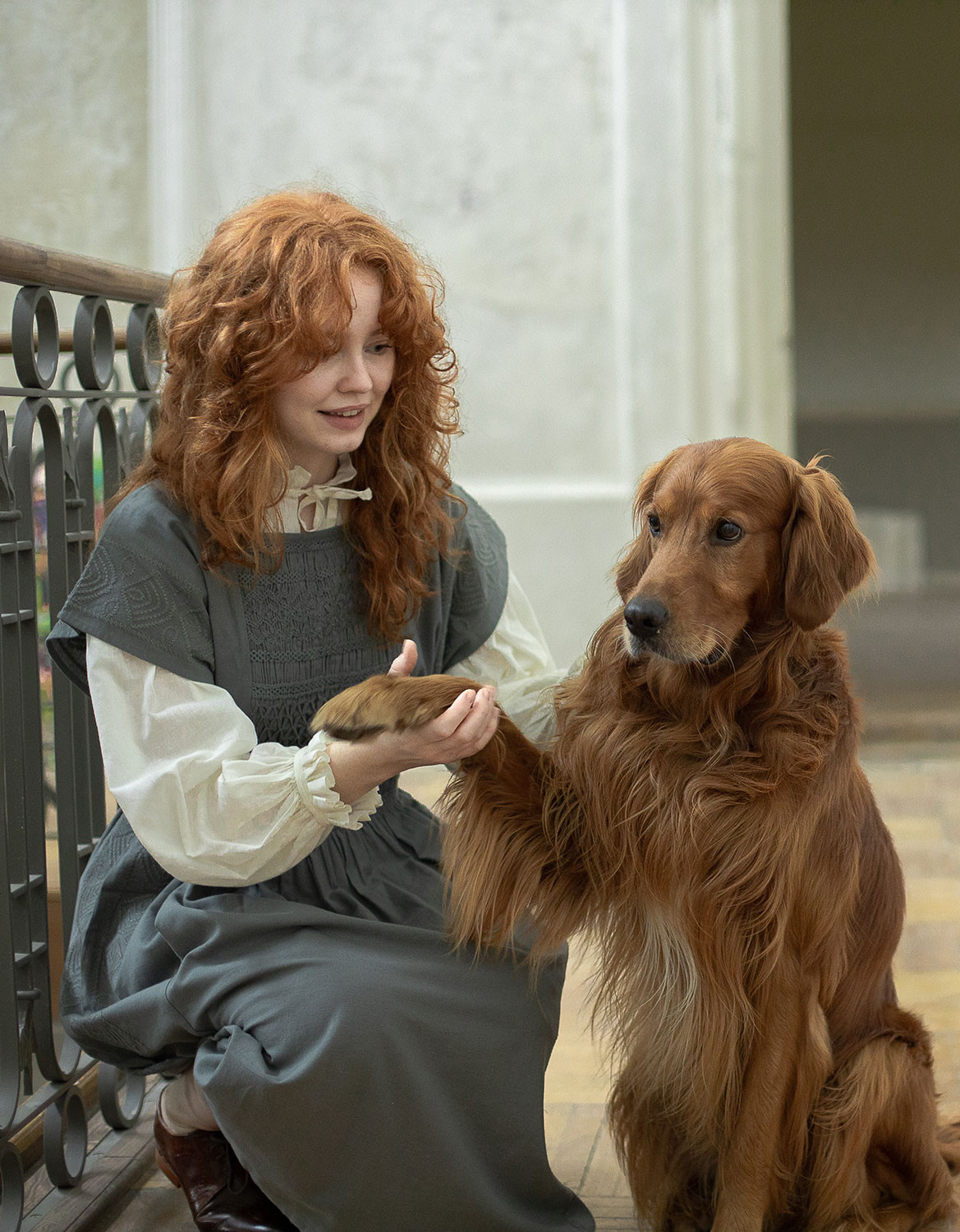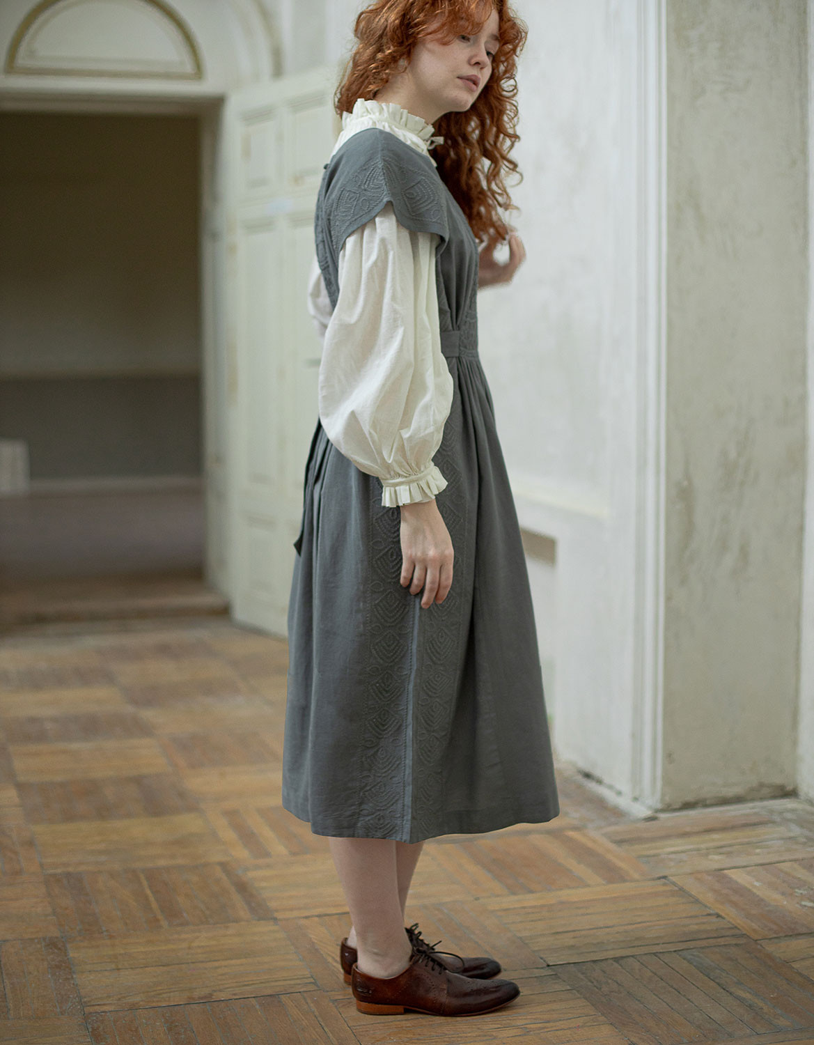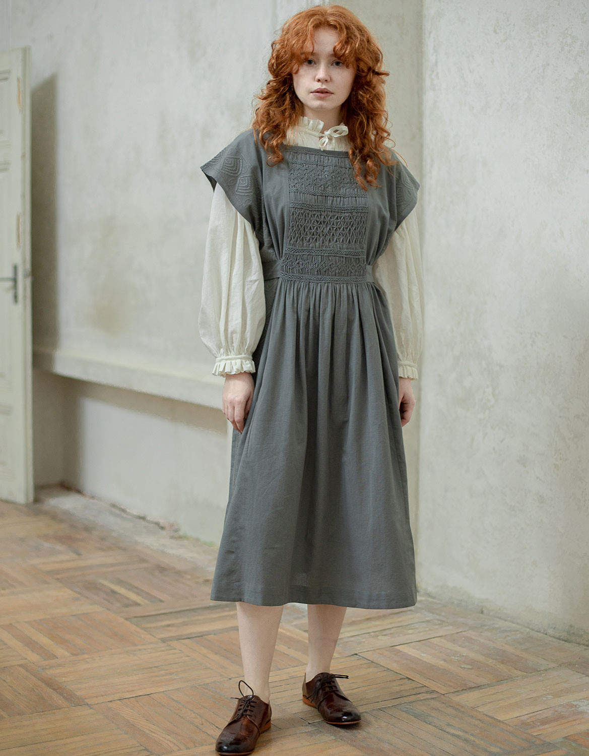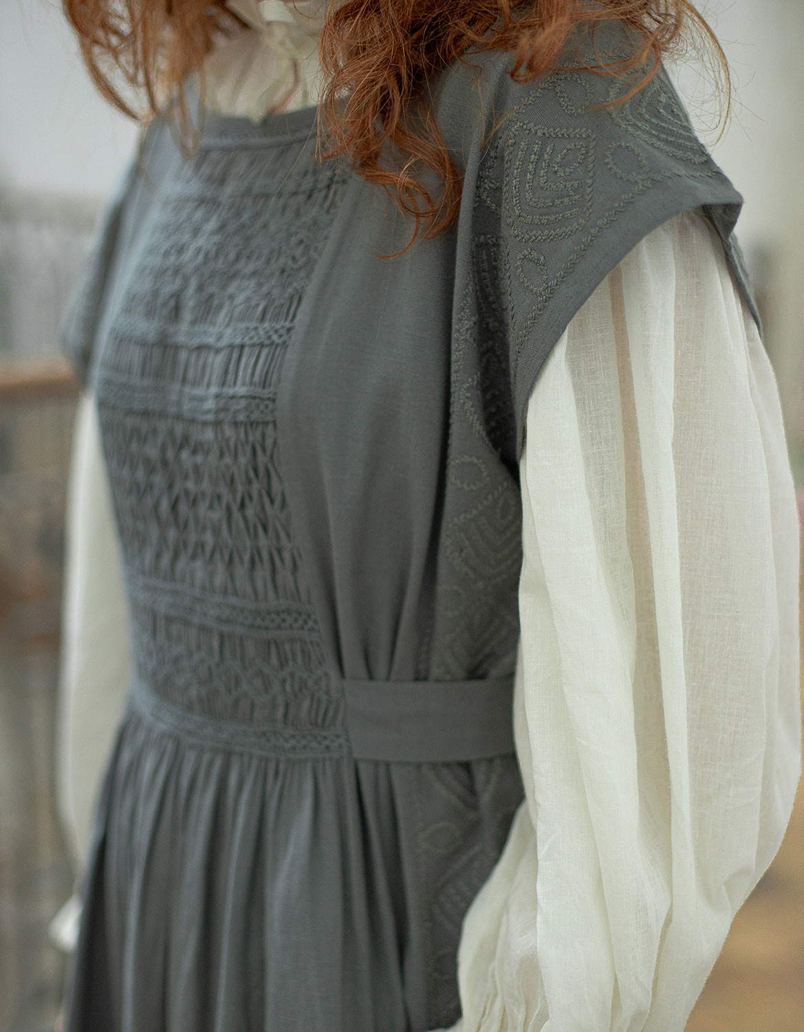 Description : Robe, smockée à la main, avec des broderies sur les côtés et à ajuster / nouer au dos.