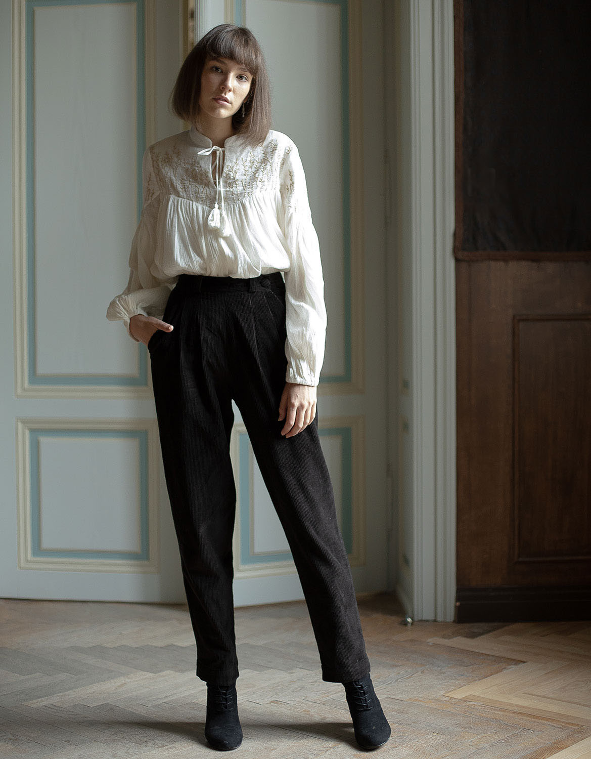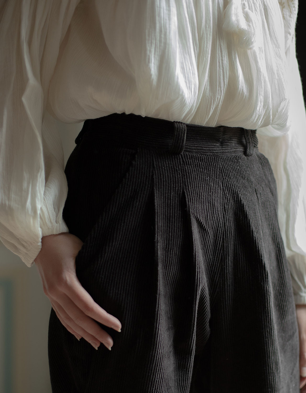 Description : Pantalon taille haute à pinces en velours côtelé 100% coton avec un dos élastiqué et des poches. Fermeture croisée devant. Idéal pour toutes les silhouettes, en particulier pour les hanches généreuses, un ourlet peut être réalisé.