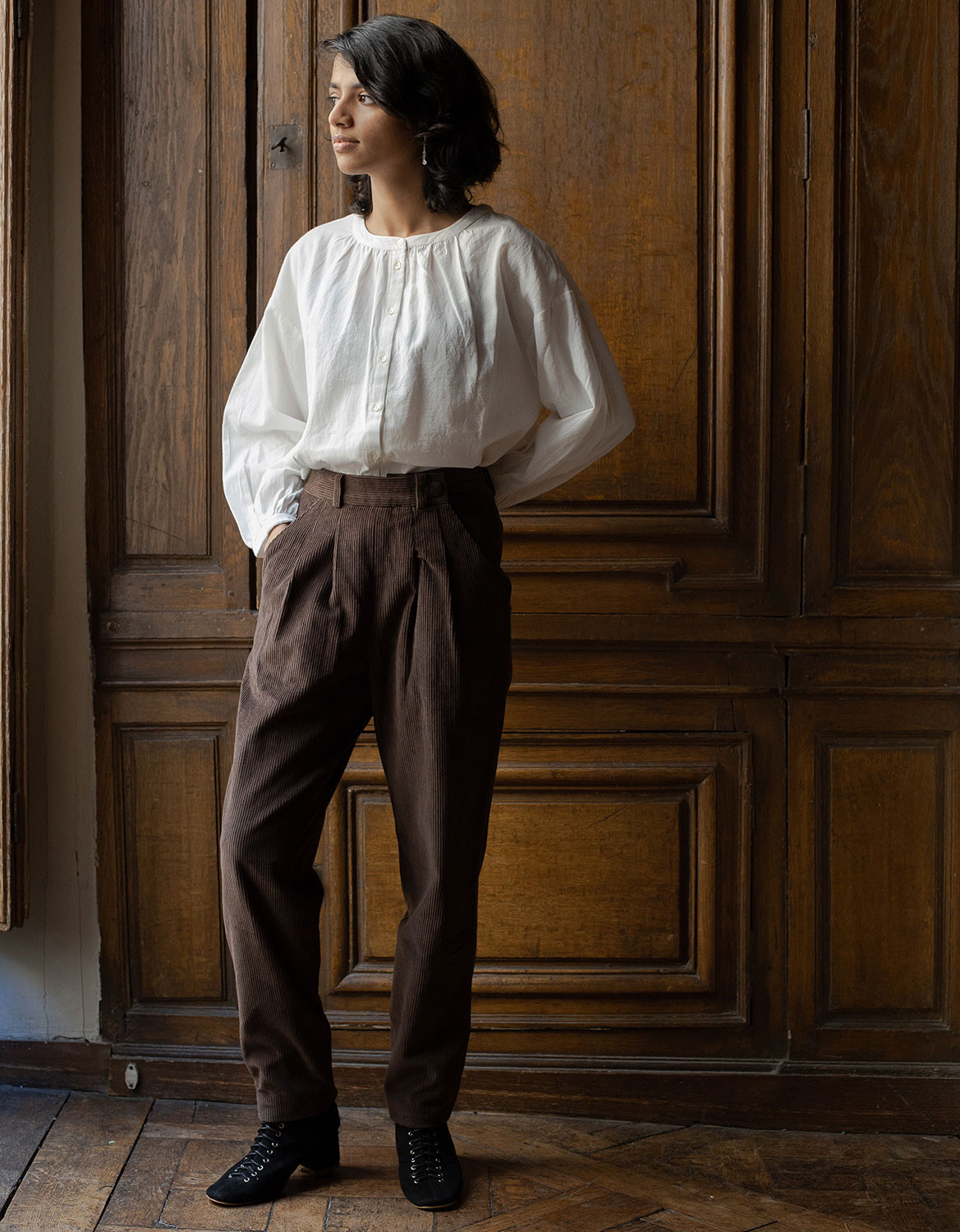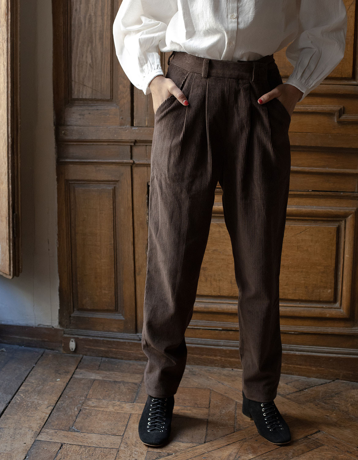 Description : Pantalon taille haute à pinces en velours côtelé 100% coton avec un dos élastiqué et des poches. Fermeture croisée devant. Idéal pour toutes les silhouettes, en particulier pour les hanches généreuses, un ourlet peut être réalisé.