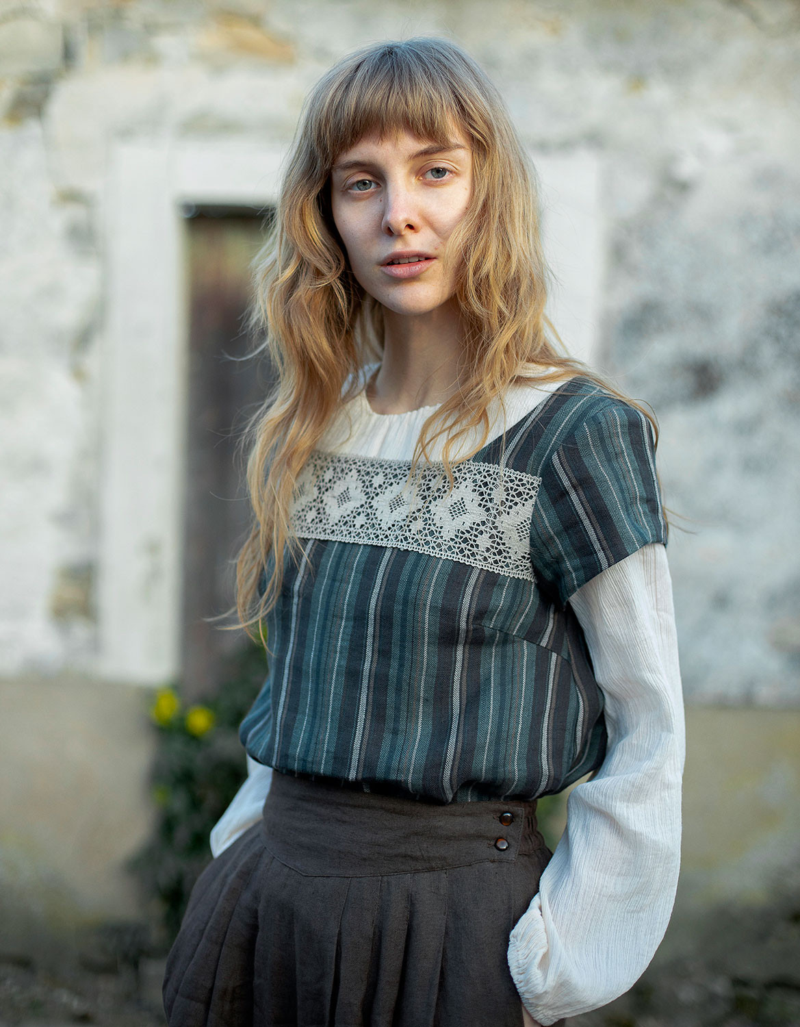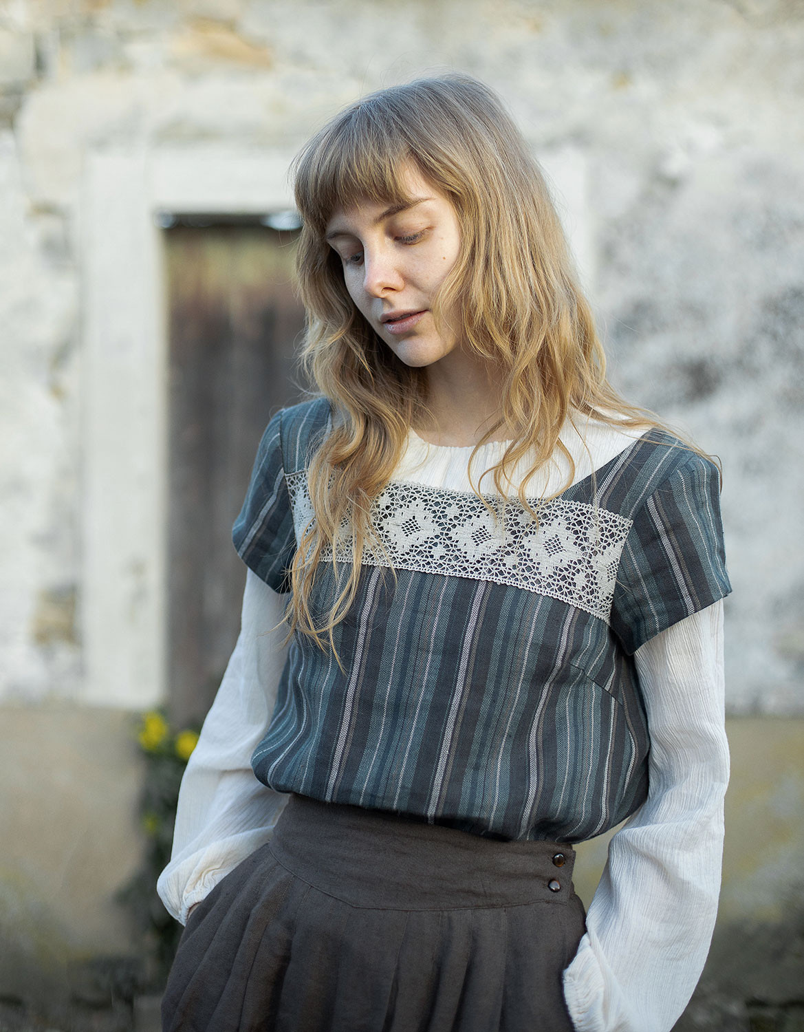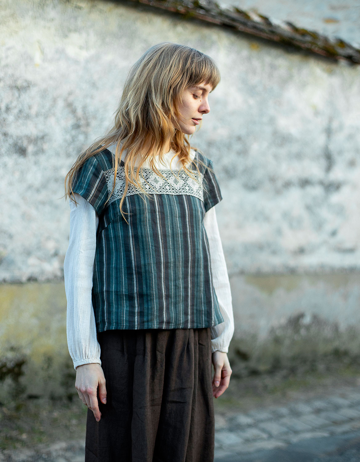 Joli haut de style rétro, décoré de dentelle de lin assorti aux rayures claires, avec un joli décolleté en forme de V dans le dos.