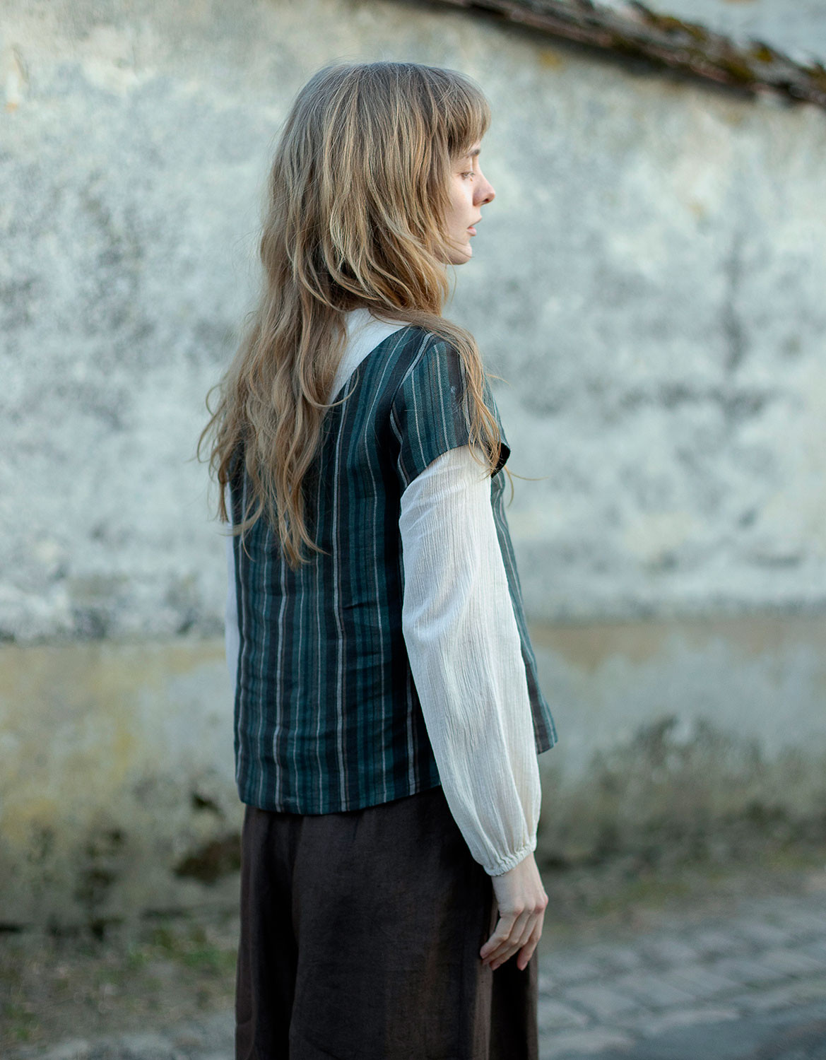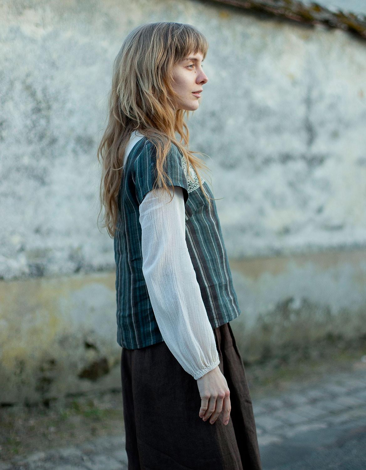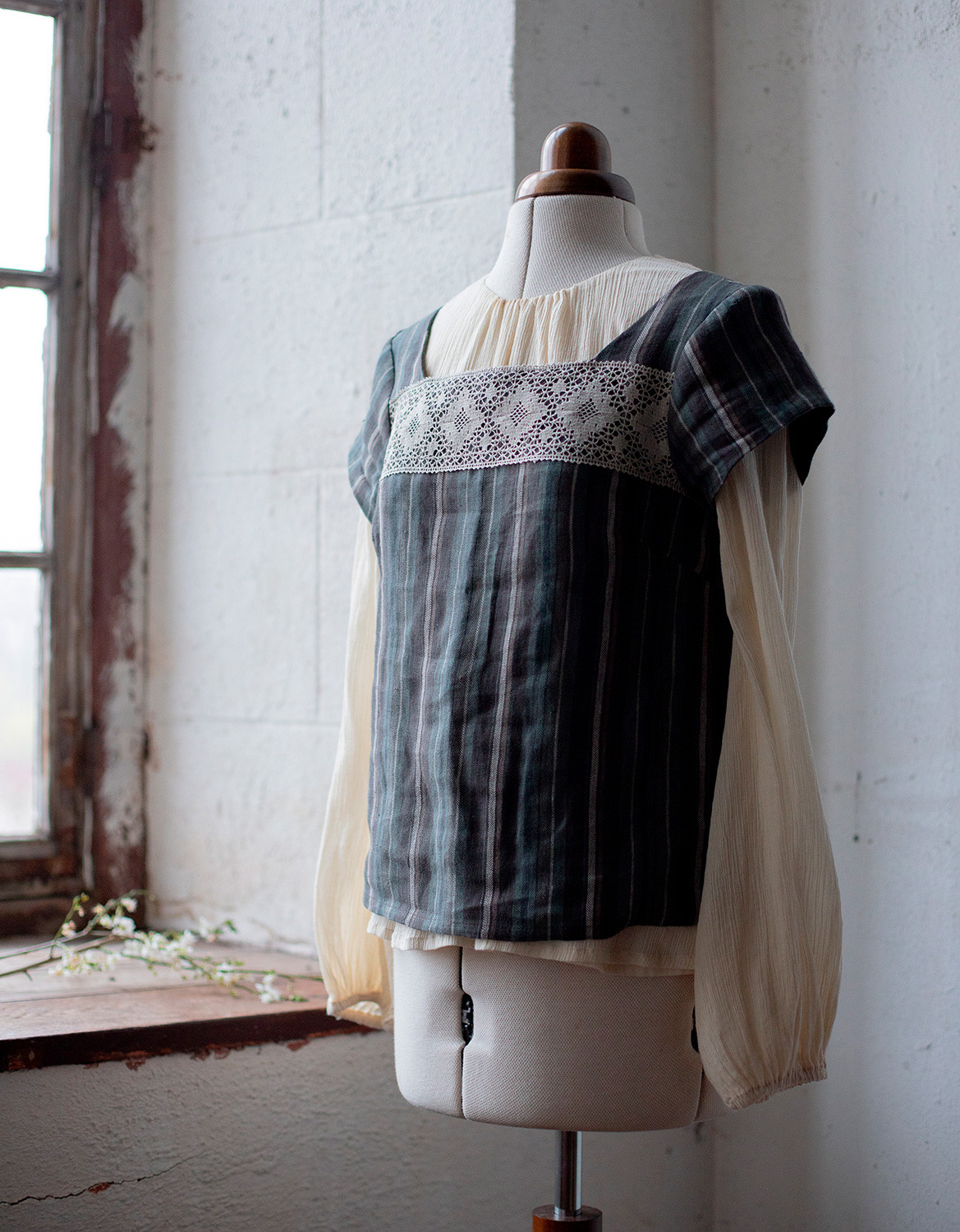Joli haut de style rétro, décoré de dentelle de lin assorti aux rayures claires, avec un joli décolleté en forme de V dans le dos.