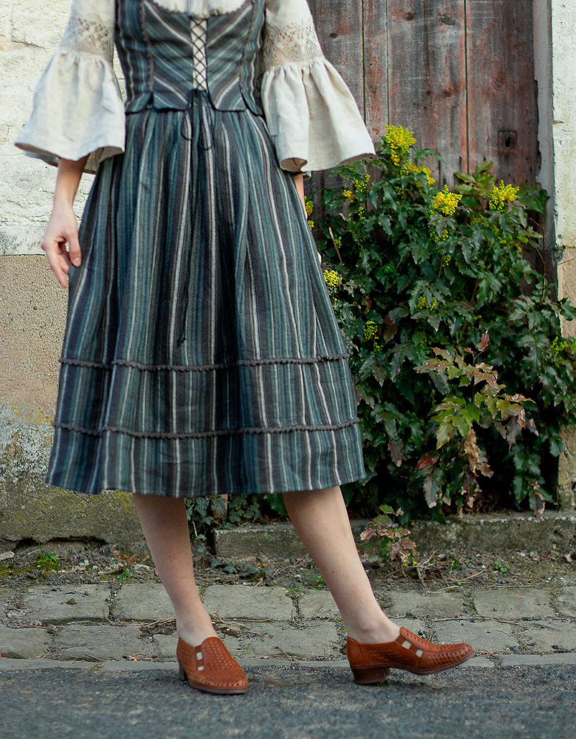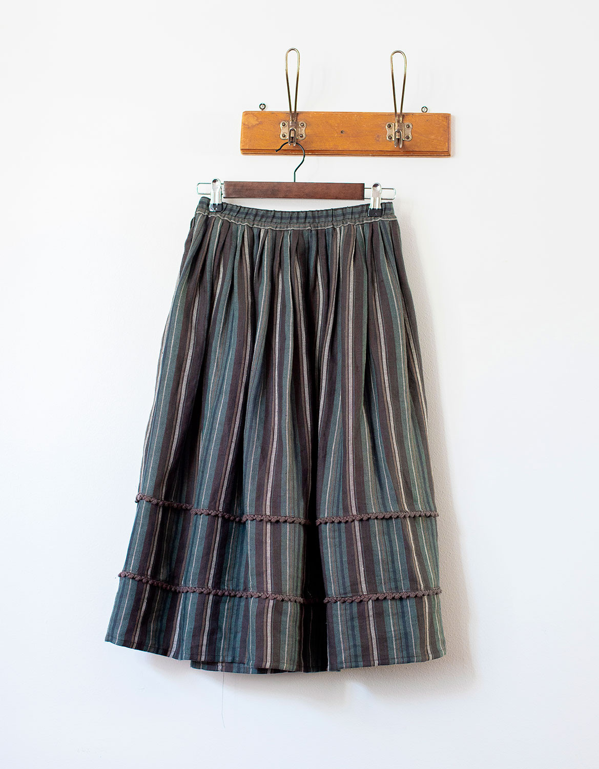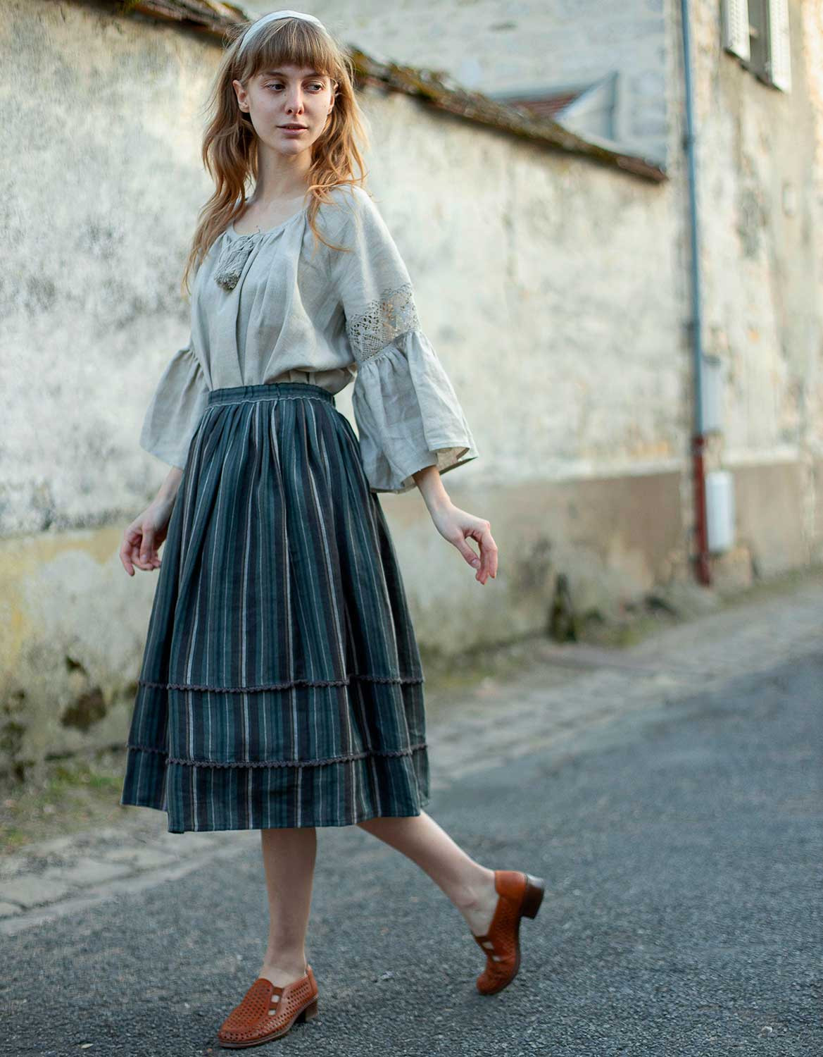 Jupe plissée, inspirée du folklore lituanien et polonais, en lin rayé bio, avec une poche du côté de la fermeture éclair, car le tissu est coupé selon un concept de 0 déchet, en bandes, puis assemblé par tailles. Les coutures ne sont donc pas systématiquement latérales mais parfois distribuées dans le dos et un seul côté.
