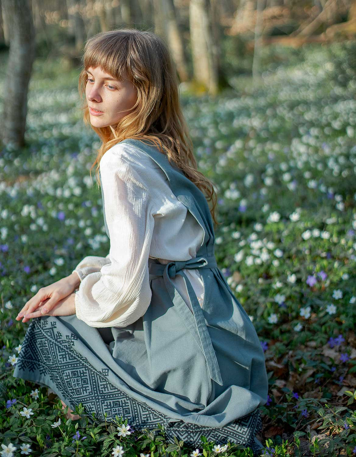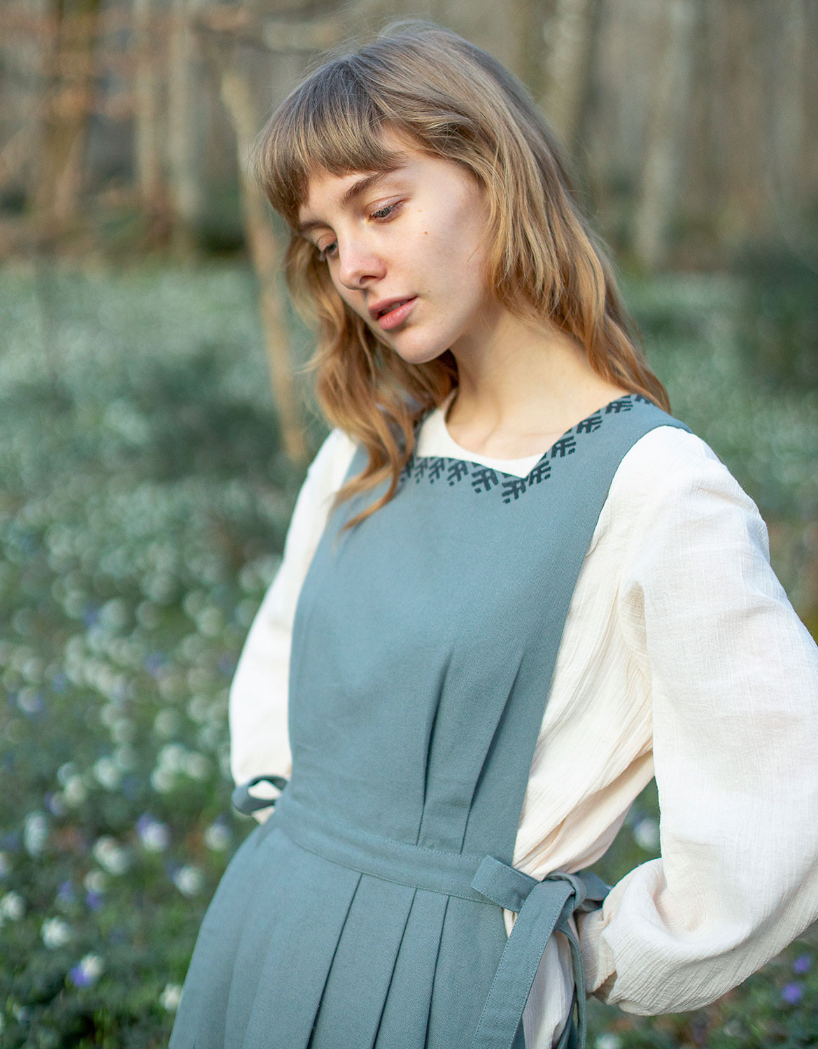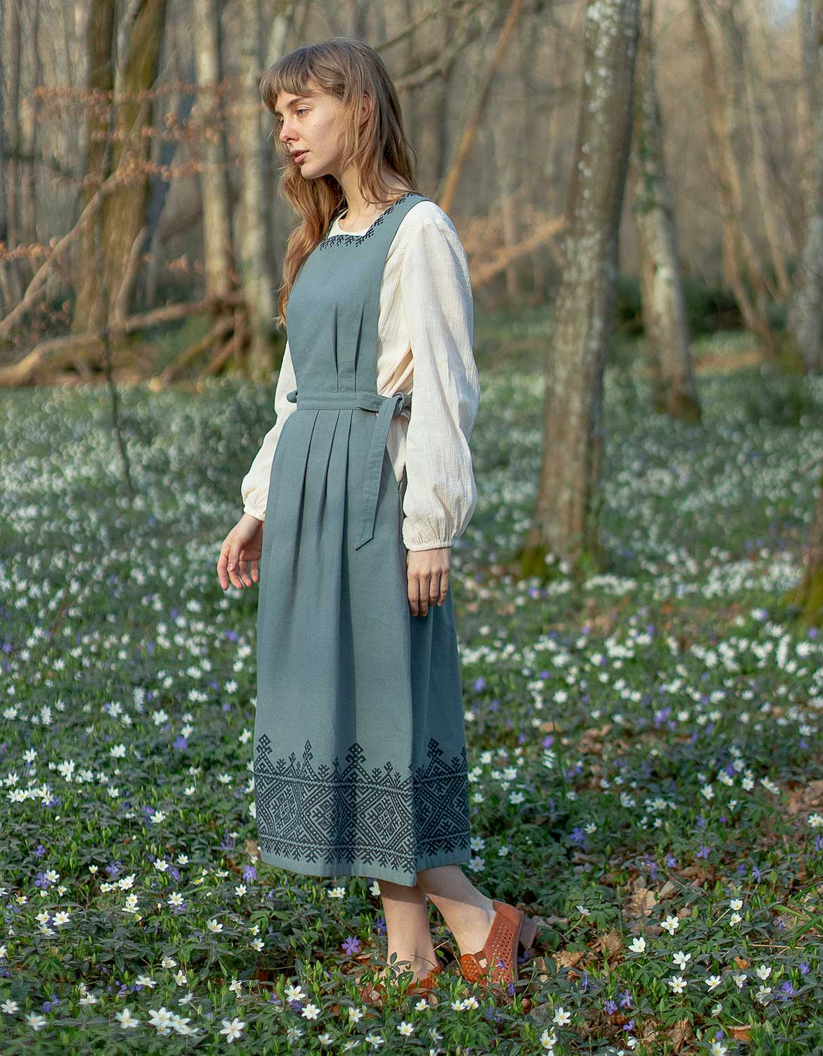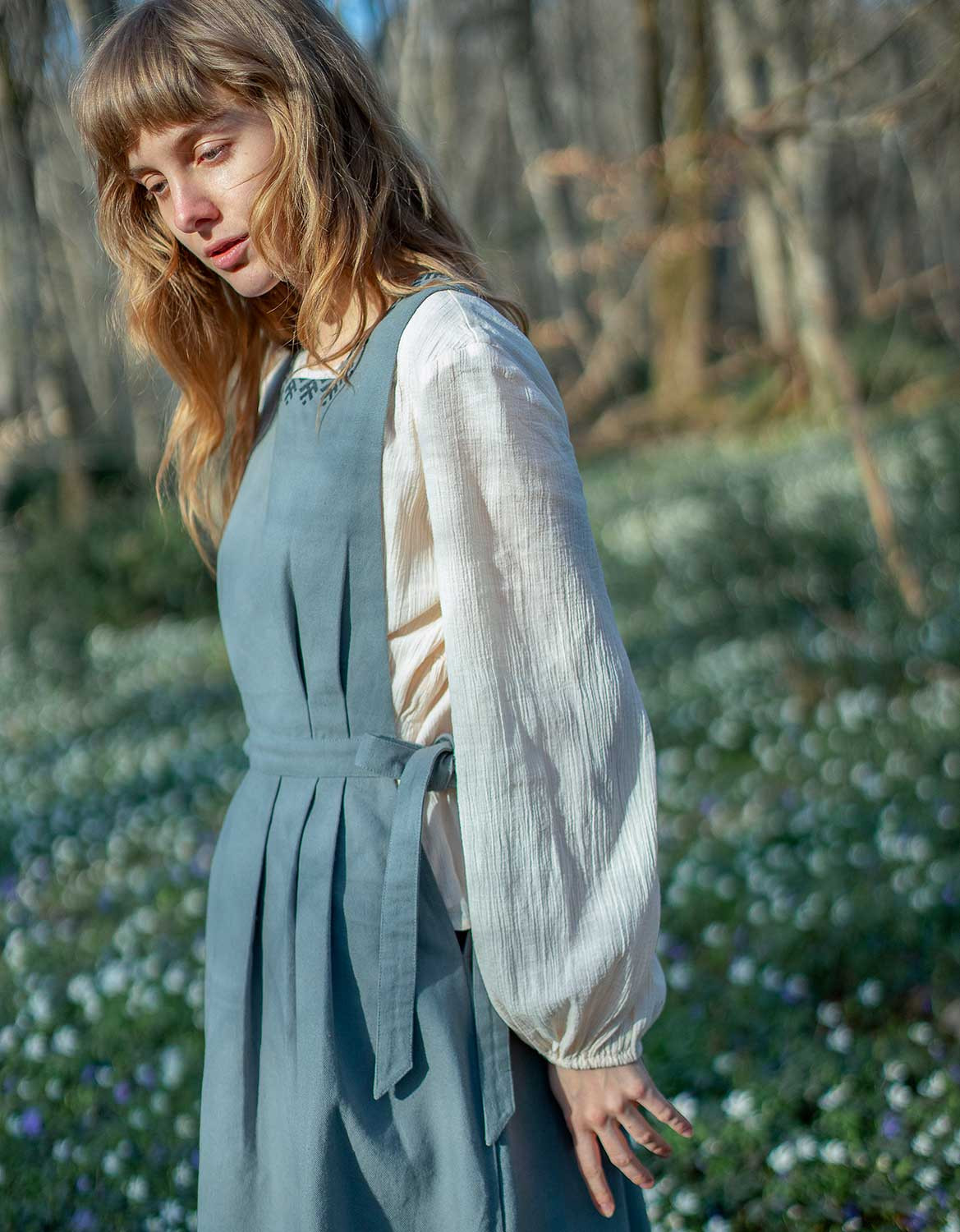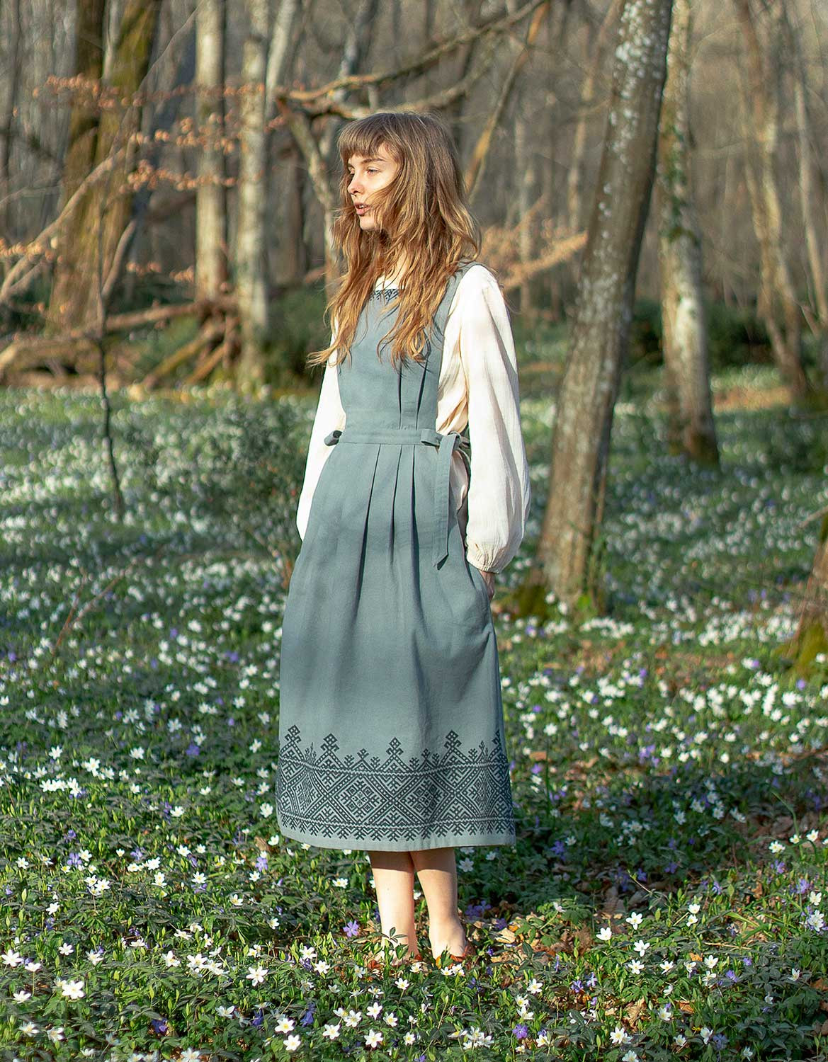 Robe chasuble structurée, en canevas de coton épais, arborant une broderie de style ukrainien. La coupe est délicatement cintrée et flatteuse, se noue sur les côtés. Avec poches.
