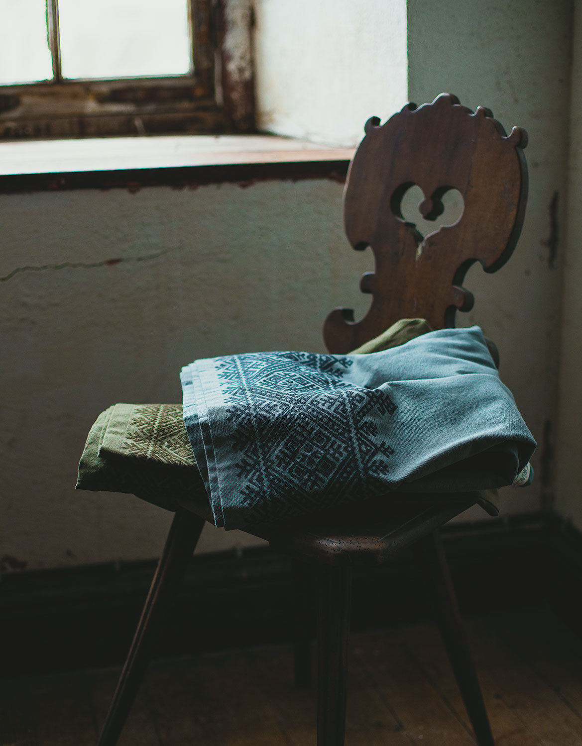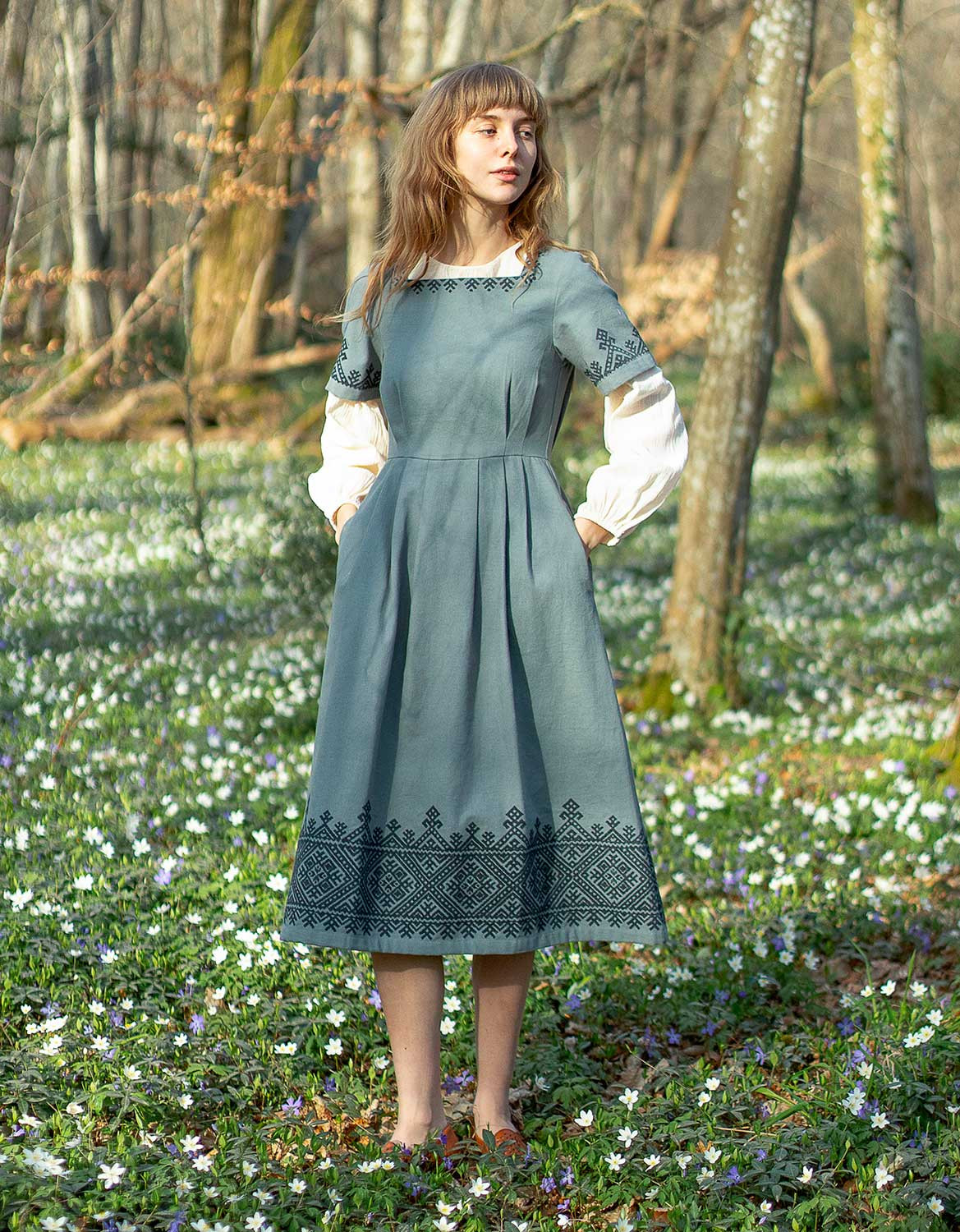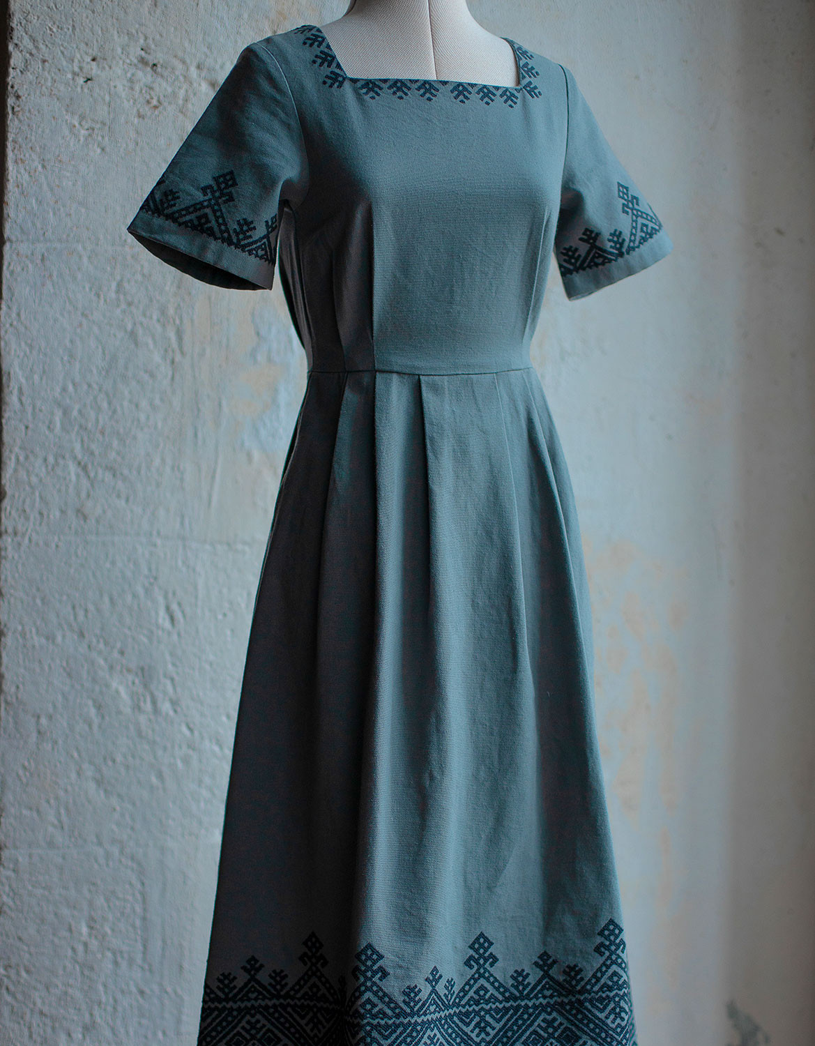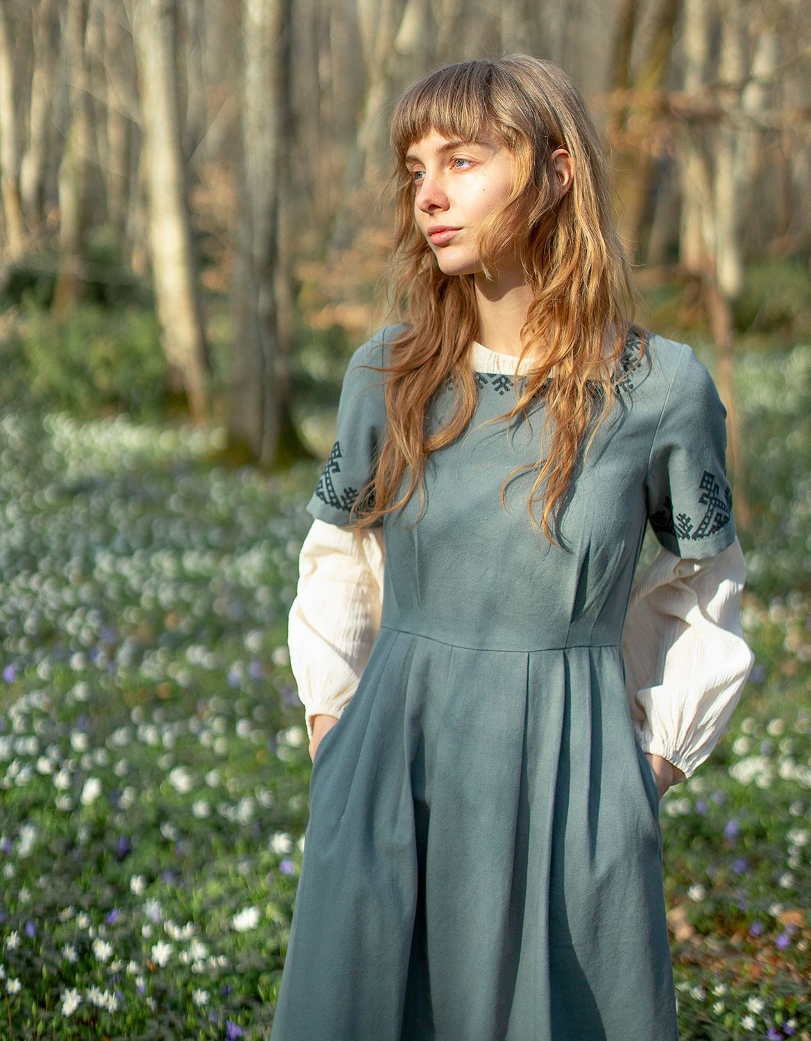 Robe structurée, en canevas de coton épais, arborant une broderie de style ukrainien. La coupe est délicatement cintrée et flatteuse. Avec poches.