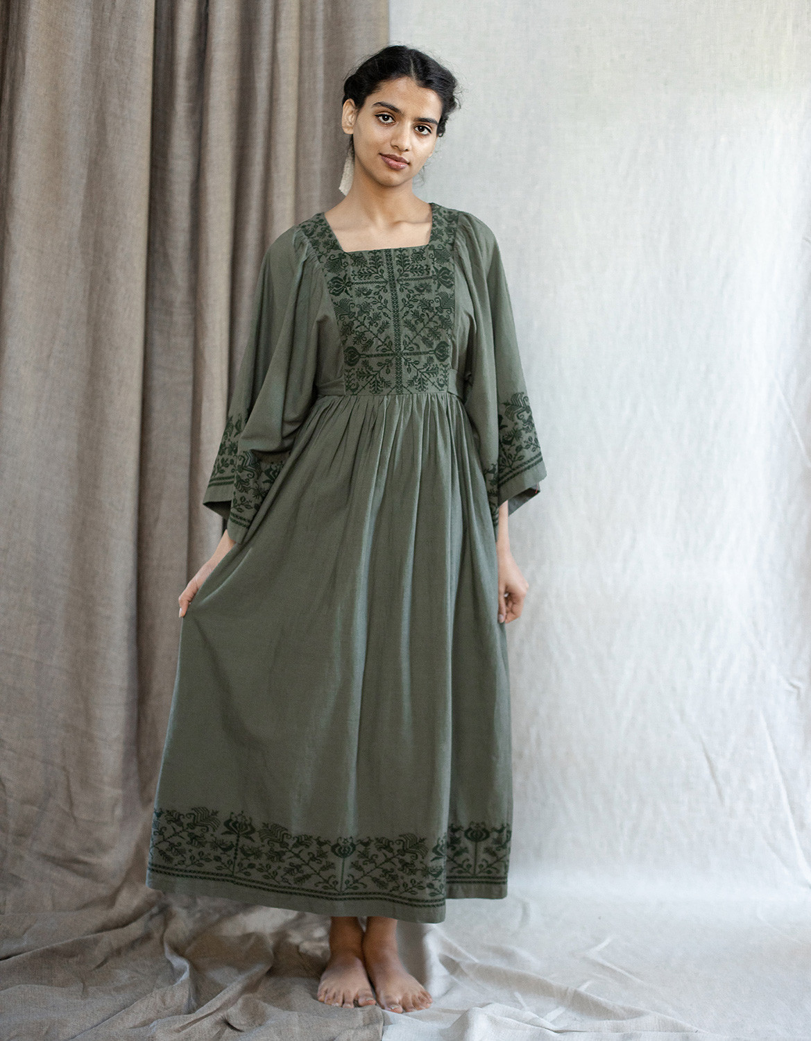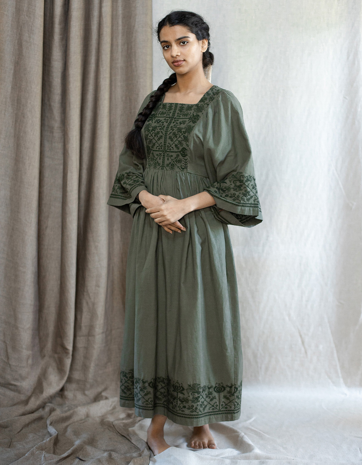 Description : Robe en coton bio avec manches ¾ évasées, décorée de somptueuses broderies de style hongrois.