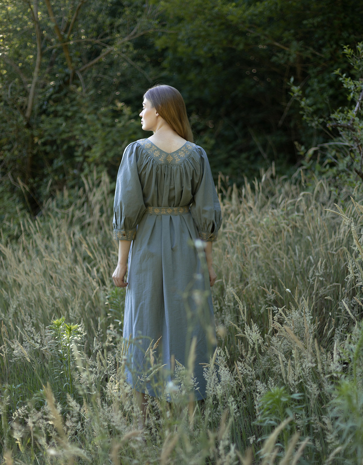 Description: robe longue à col V avec des manches ¾ et broderies illustrant la traditionnelle étoile du matin, très populaire dans les pays scandinaves et slaves.