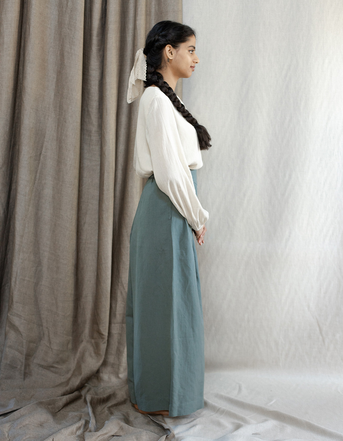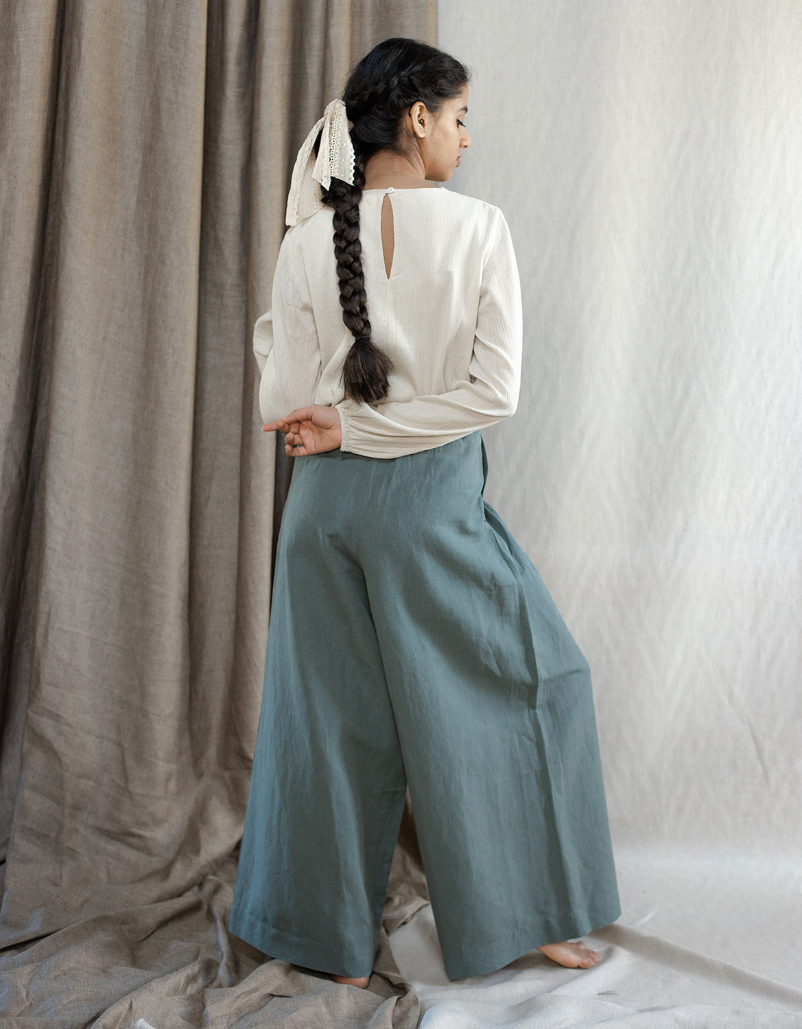Description : Pantalon palazzo long, en lin mélangé coton, avec des plis à la taille et un élastique au dos.