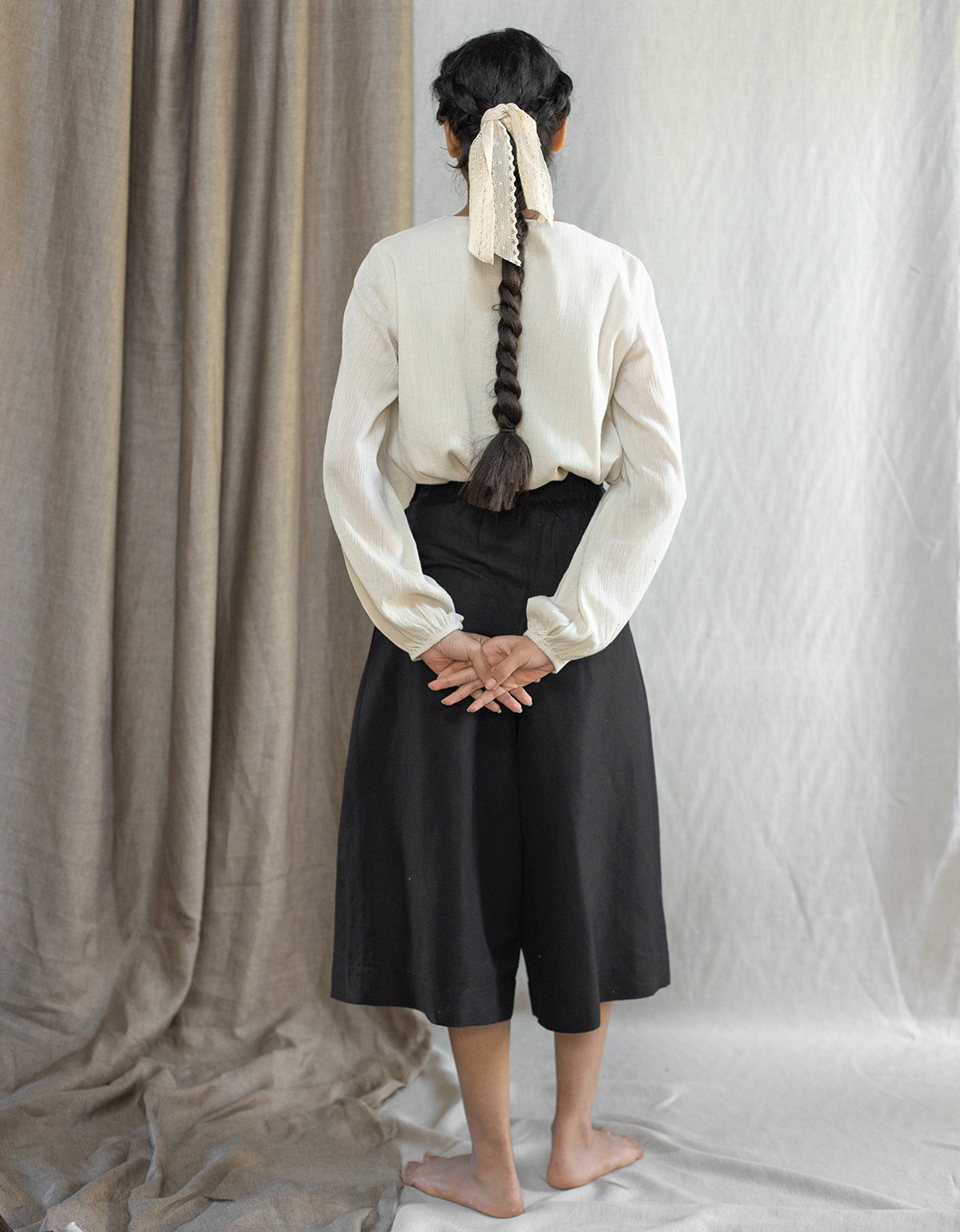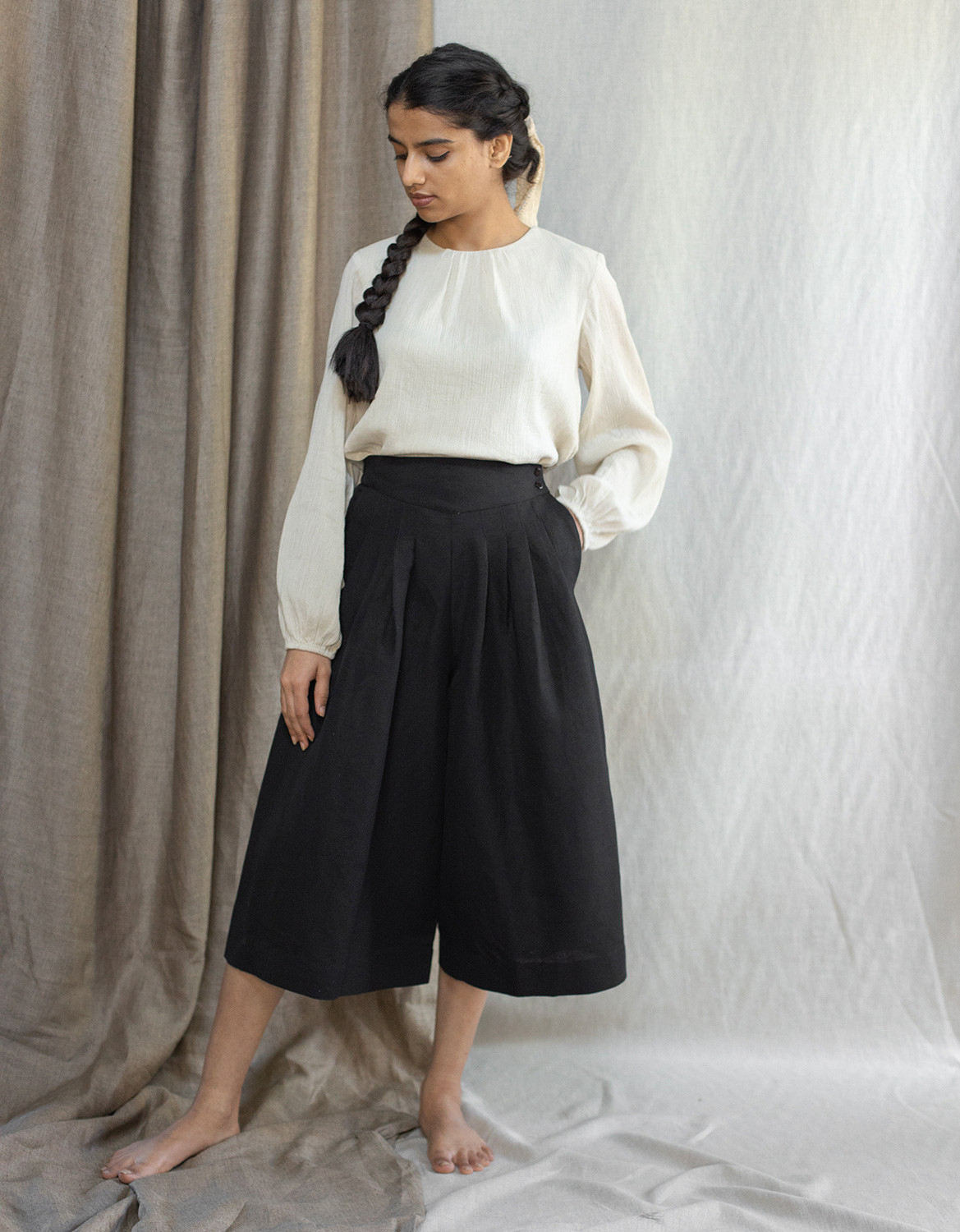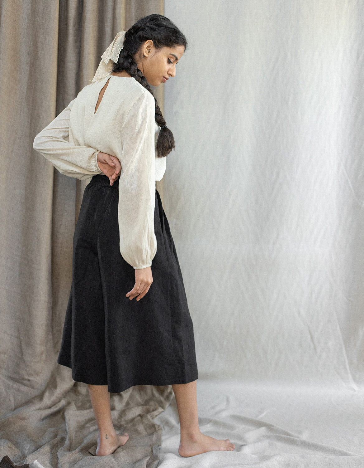 Description : Jupe culotte / pantalon palazzo midi, en lin mélangé coton, avec des plis à la taille et un élastique au dos.