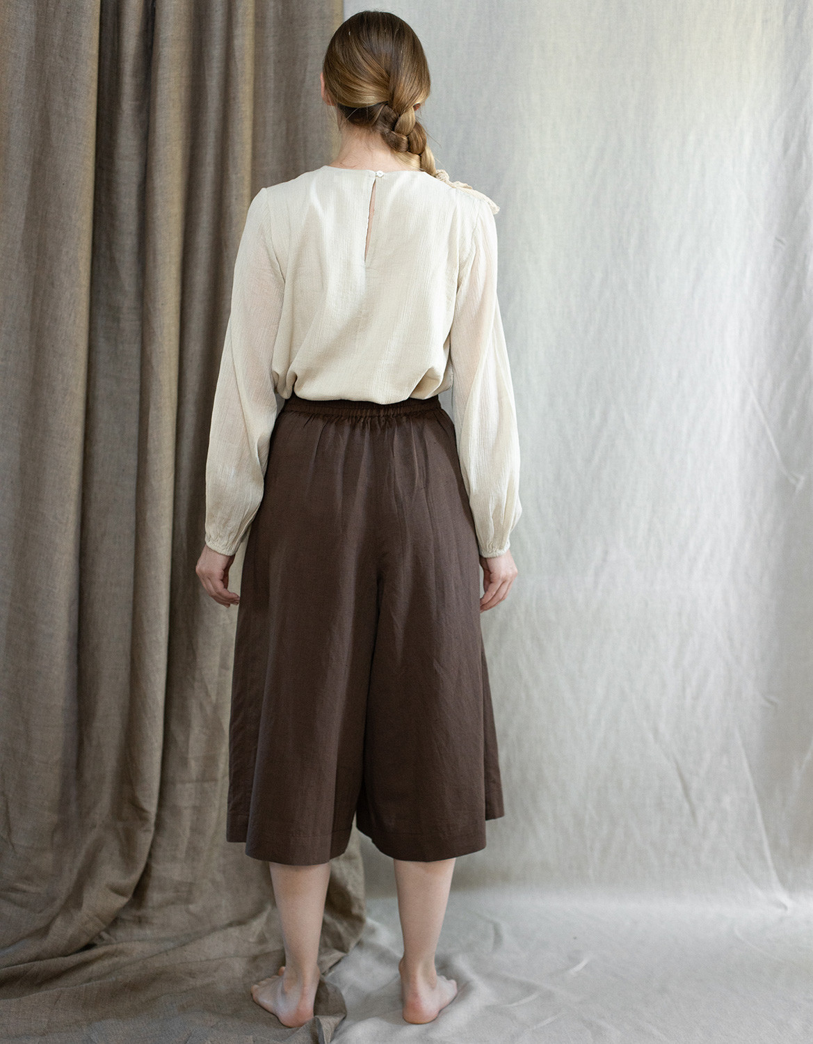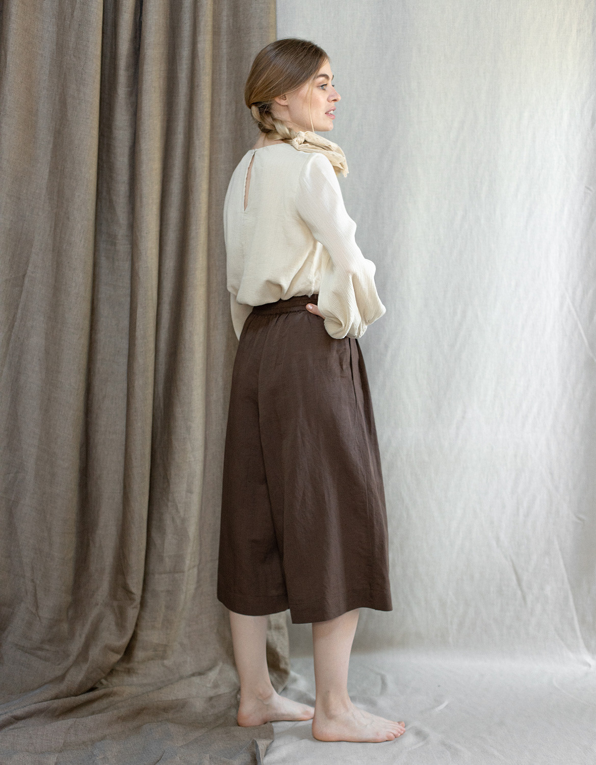 Description : Pantalon palazzo long, en lin mélangé coton, avec des plis à la taille et un élastique au dos. Tissu un peu plus fin et estival que pour les autres couleurs.