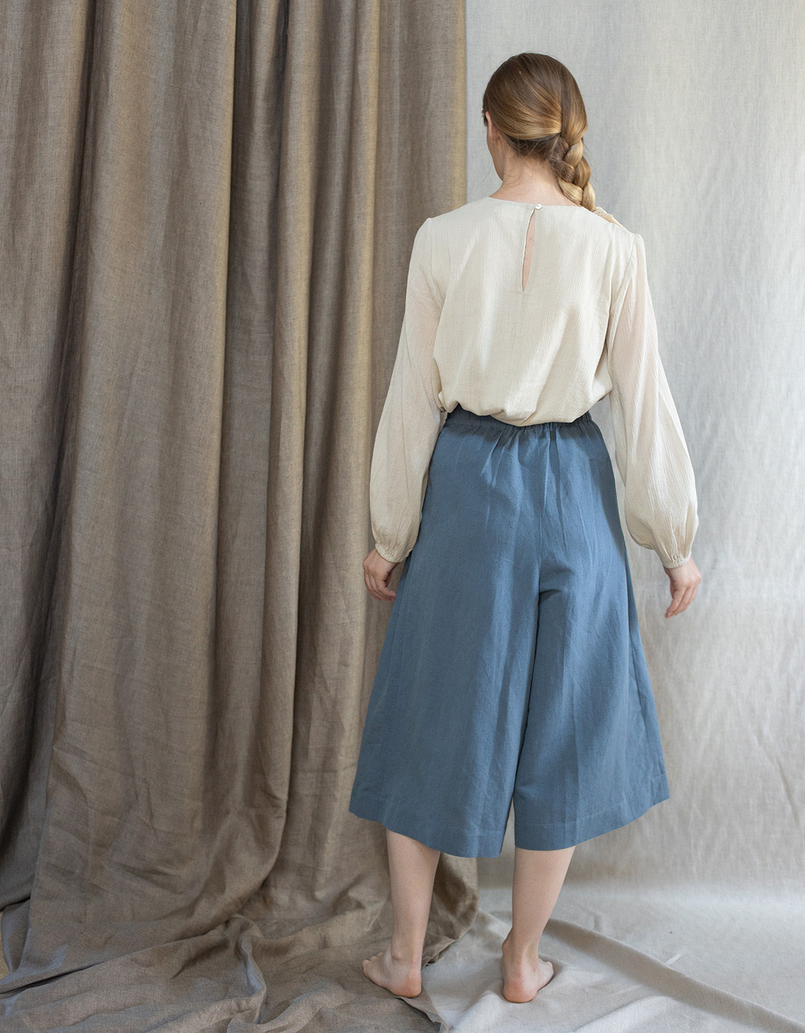 Description : Jupe culotte / pantalon palazzo midi, en lin mélangé coton, avec des plis à la taille et un élastique au dos.