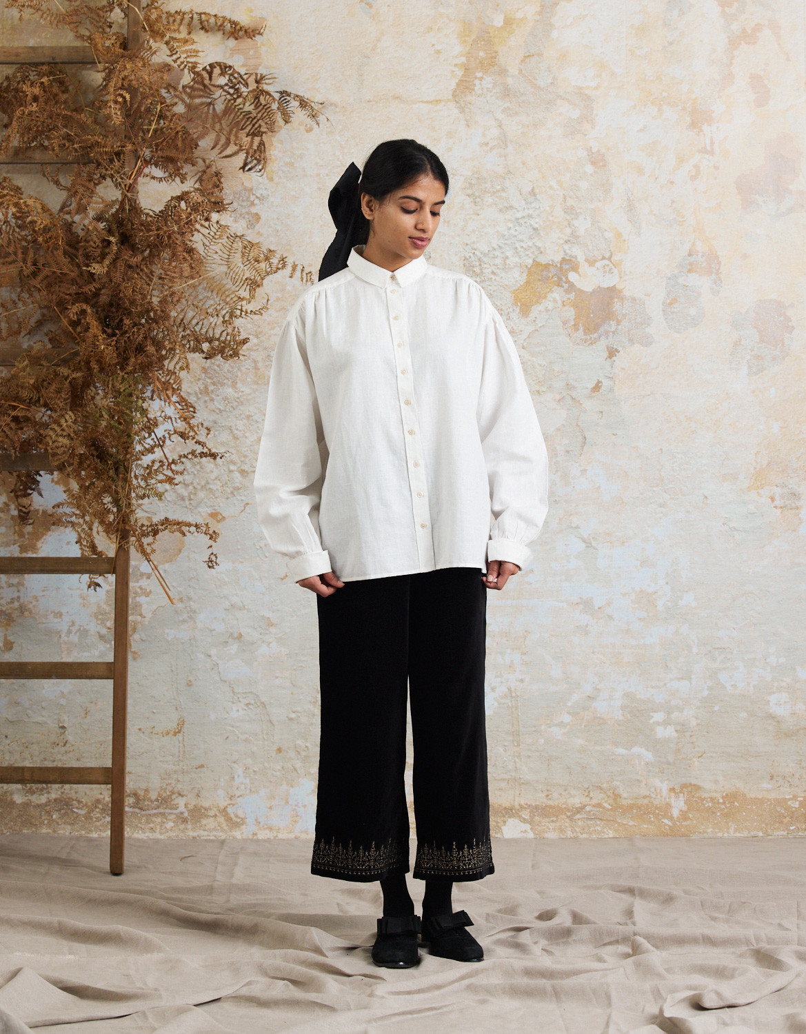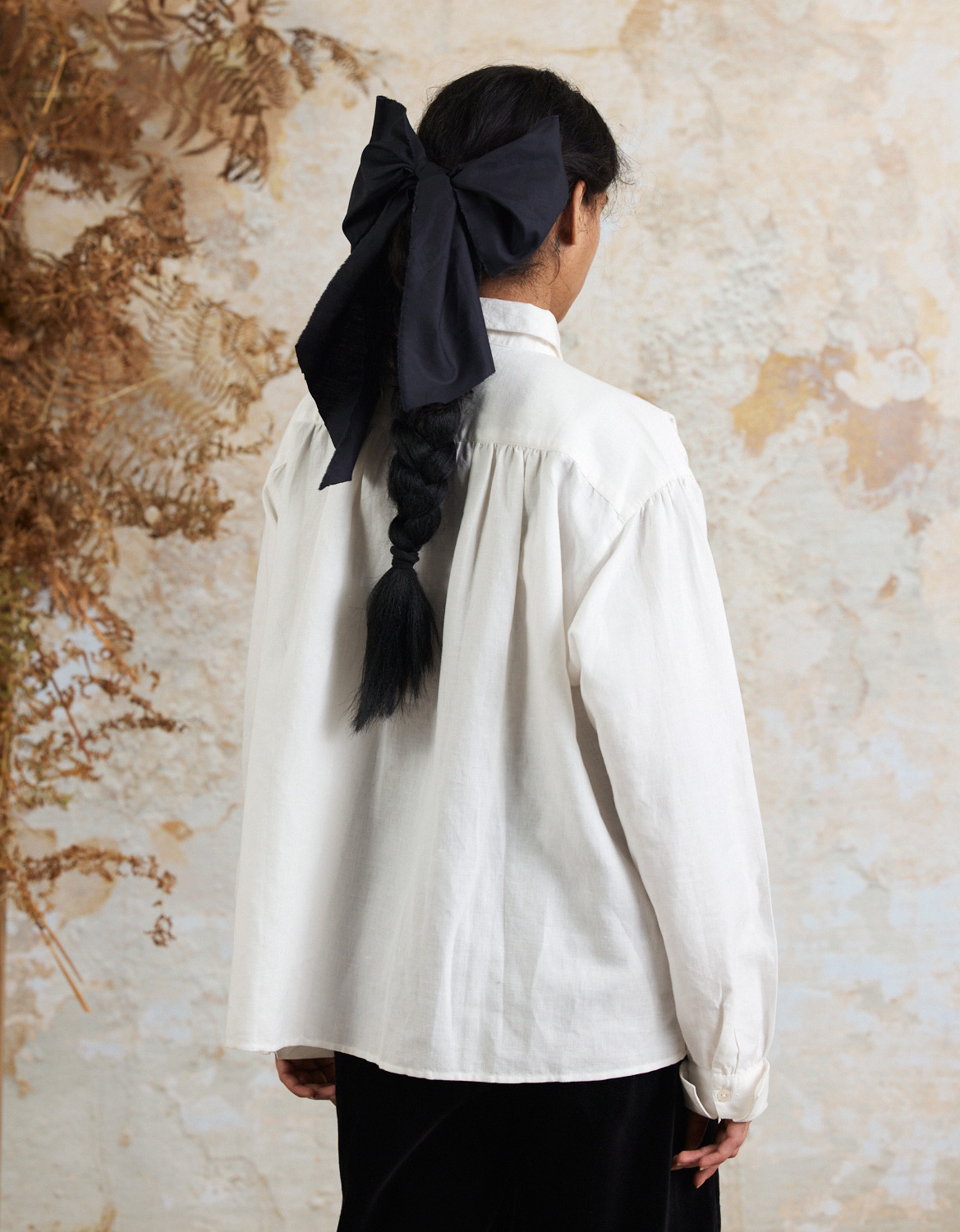 Inspirée d’une chemise masculine du milieu du 19ème siècle, « Viola » évoque les charismatiques dandys avec leurs cols amidonnés et manchettes apparentes. Les épaules sont légèrement tombantes, et arborent des fronces tout au long de l’empiècement devant et derrière, pour un tomber fluide et une coupe oversize.