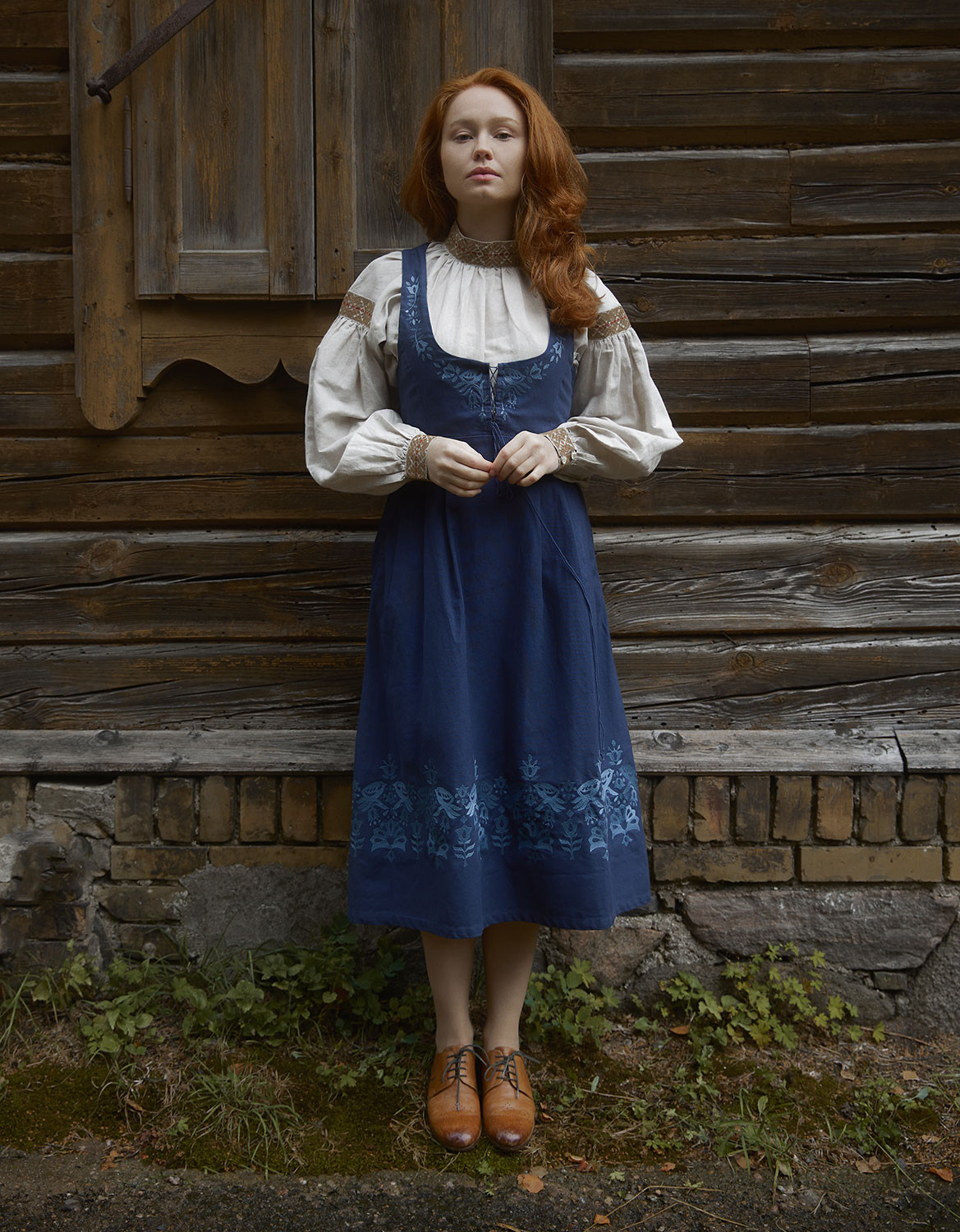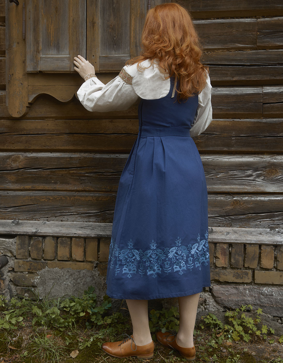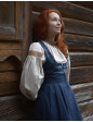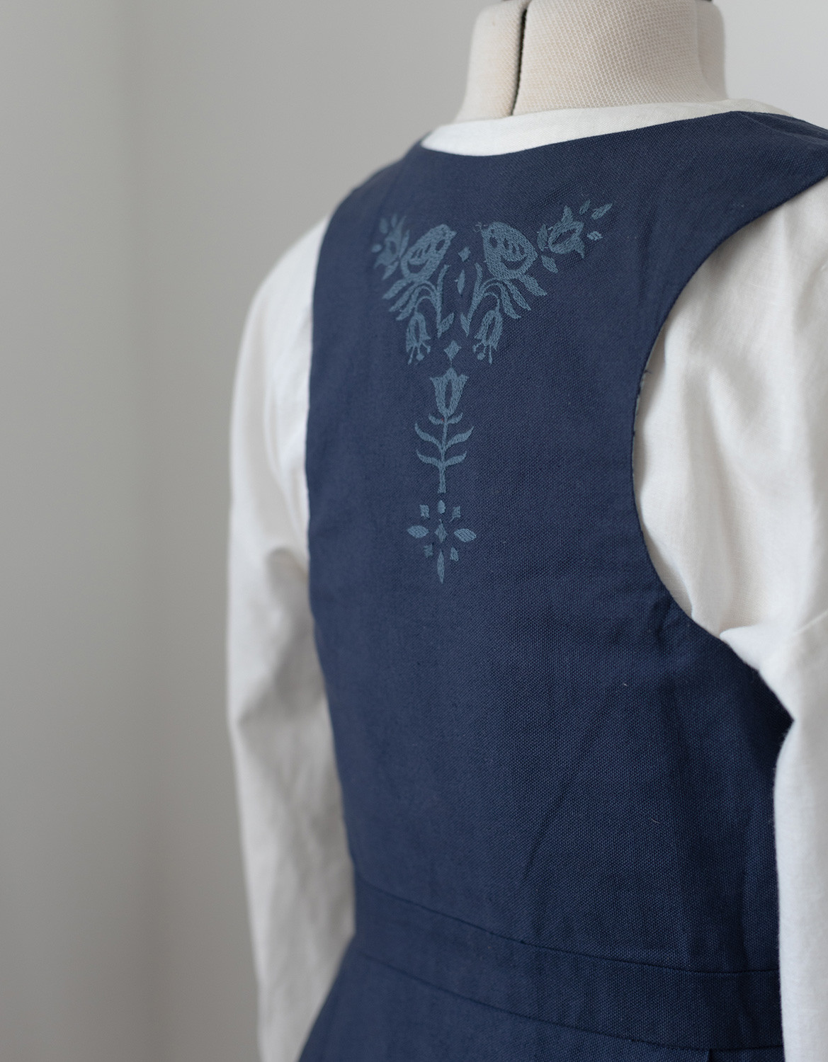 Description : Robe-bustier inspirée du « Bunad » de Bergen en Norvège, en canevas de coton, avec un joli laçage sur le devant et des oiseaux brodés. Le bustier a été développé de façon à marier les formes harmonieusement, peu importe le volume de la poitrine.