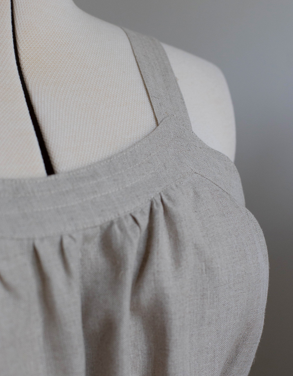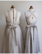 Description:  robe-tablier en lin lavé bio (traitement anti froisse) avec poches, amplement croisée dans le dos, et donc entièrement réglable.