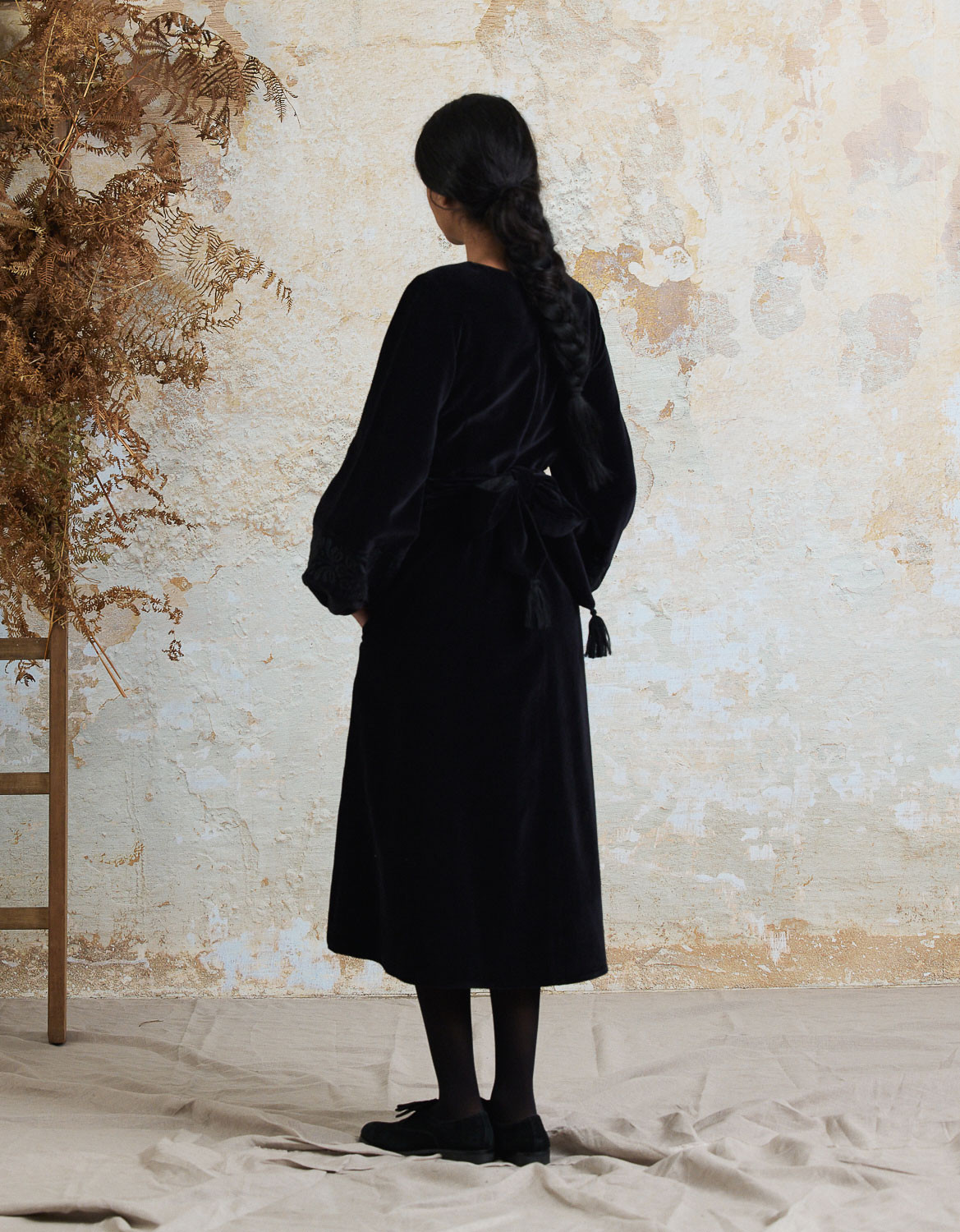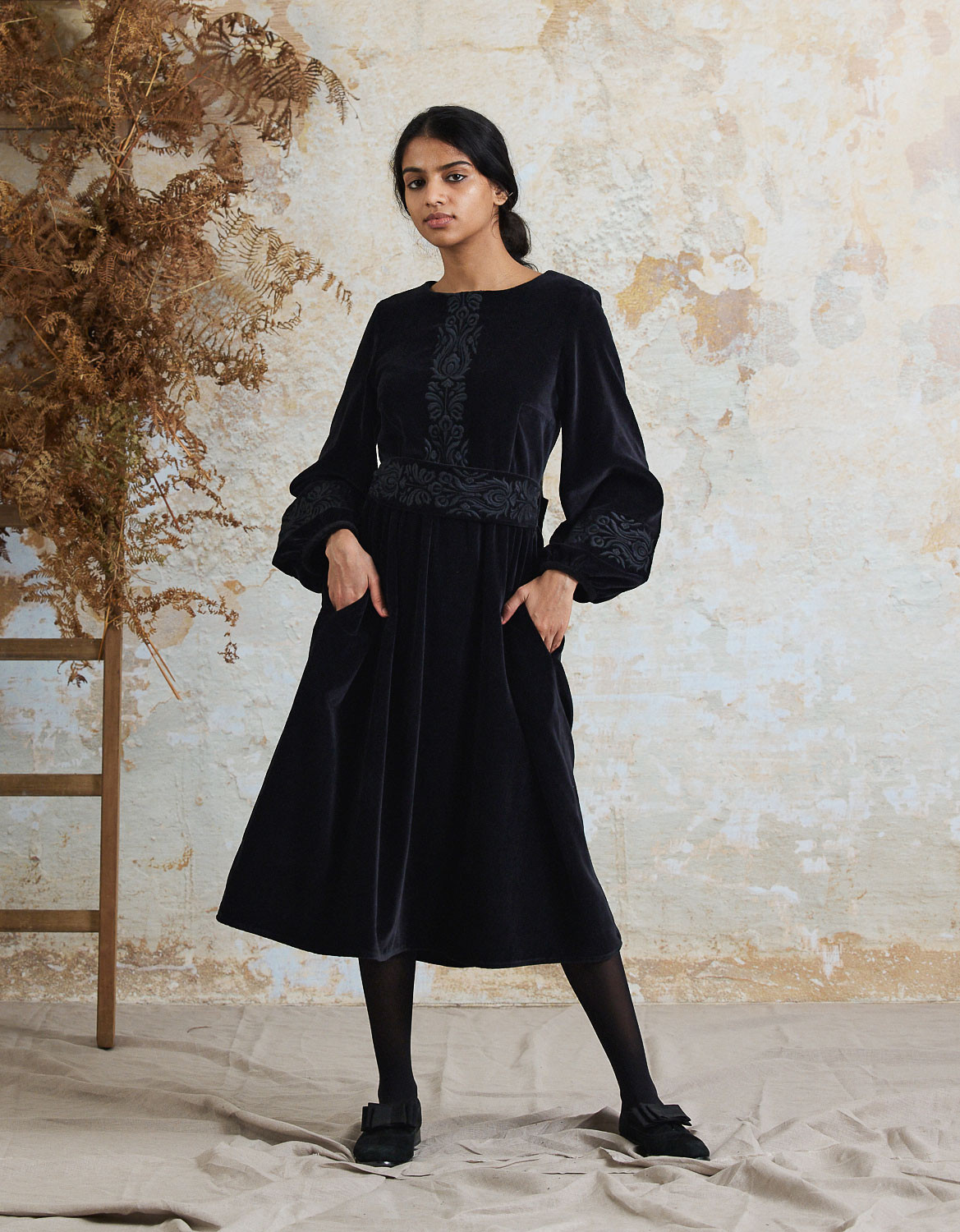 Réalisée dans un agréable velours de coton, vous pouvez la porter seule, ou avec la ceinture brodée, assortie, qui viendra marquer la taille. Vous trouverez aussi deux poches, et une fermeture éclair dans le dos.